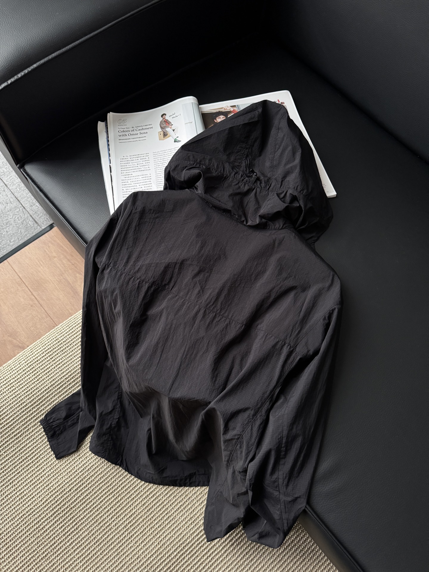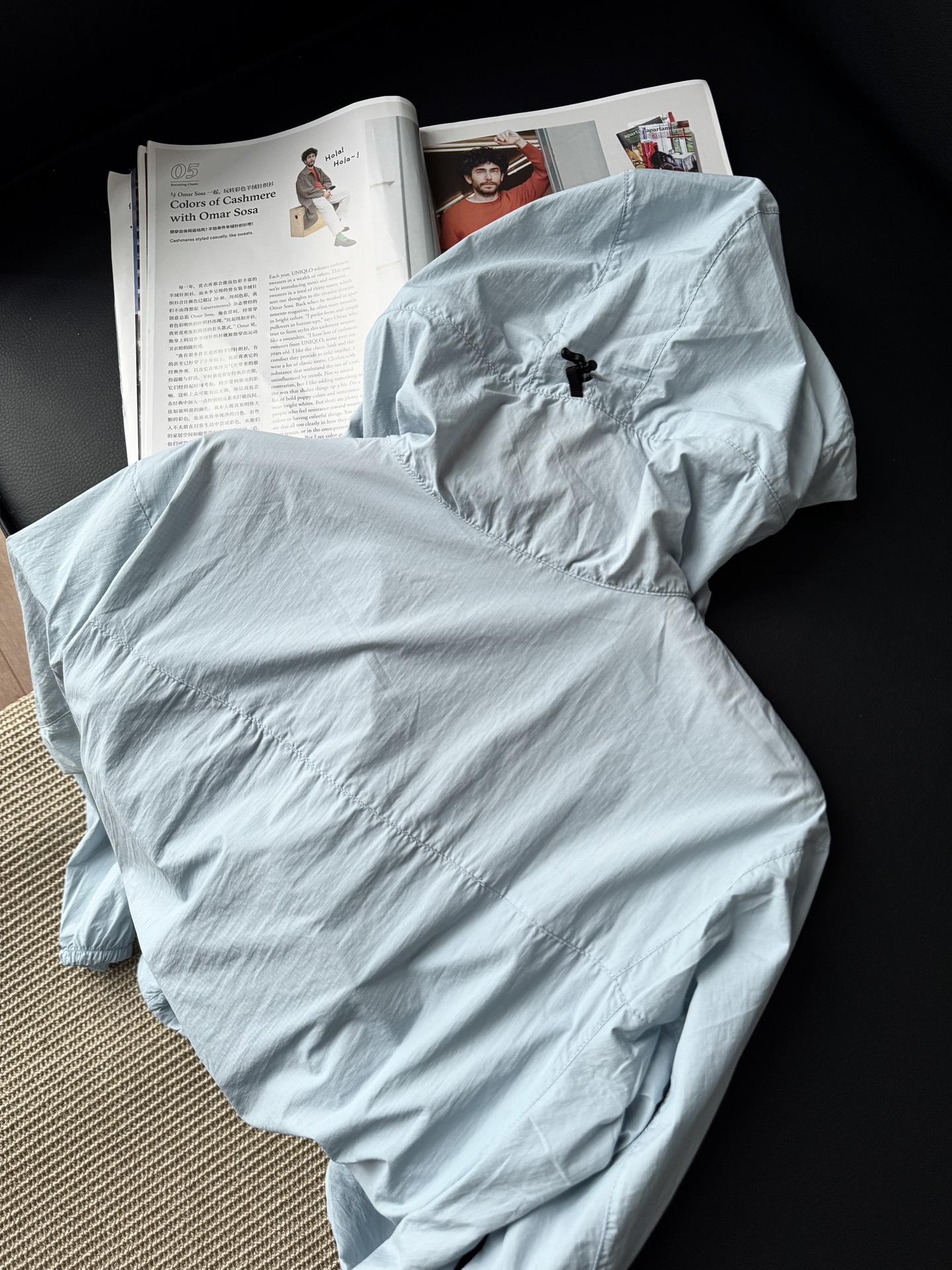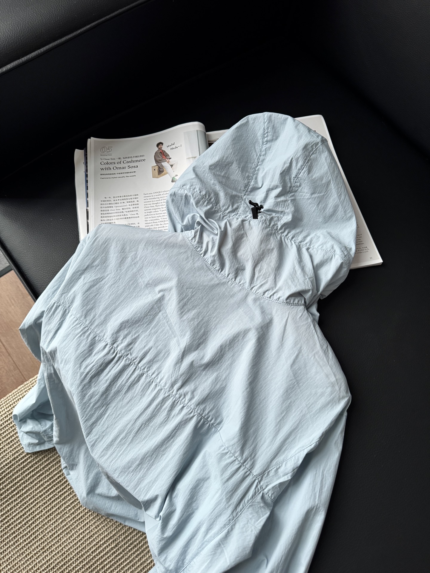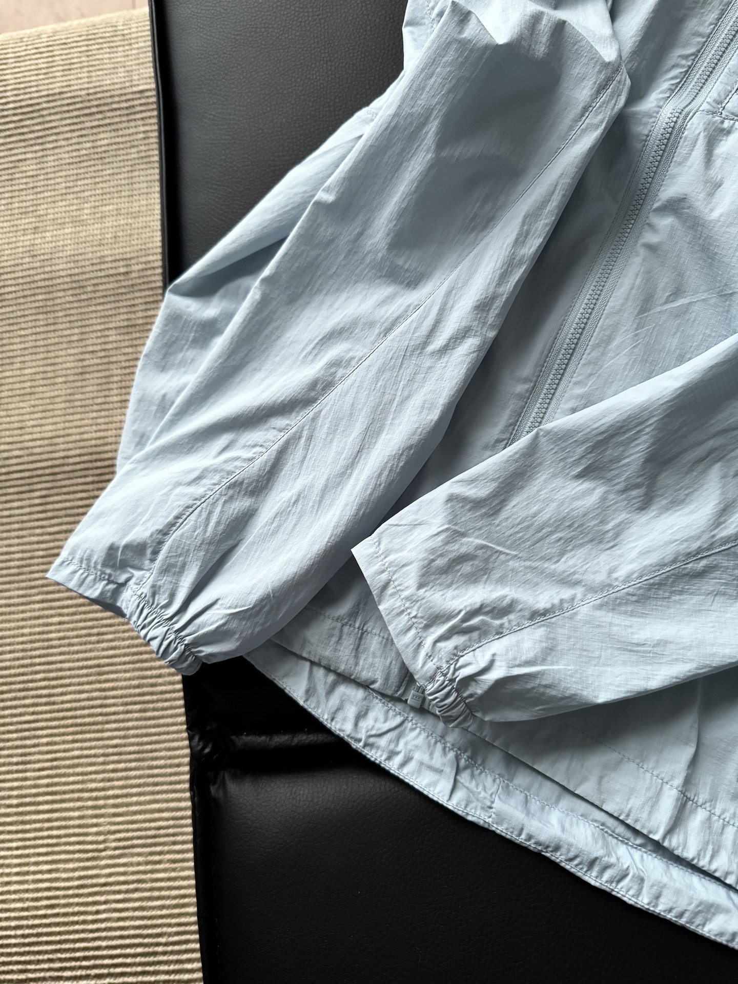 原面料 很经典的防护型防晒衣,UPF50+的防晒值,可以穿情侣款,超级实穿的防晒衣, 日常通勤,休闲运动、或者是户外徒步都OK,Tyono30防撕裂机织面料,表面都有暗格纹结构,轻量、防风、防雨、防撕裂防护性很好,户外小雨不用担心,透气、防潮不挑男女,上身酷飒十足,高级感满满的都市机能风, 胸前单侧做了拉链口袋 袖口,下摆都有收口工艺 下摆内里做有抽绳,可调节收紧半圈弹力袖口 舒适贴合手腕