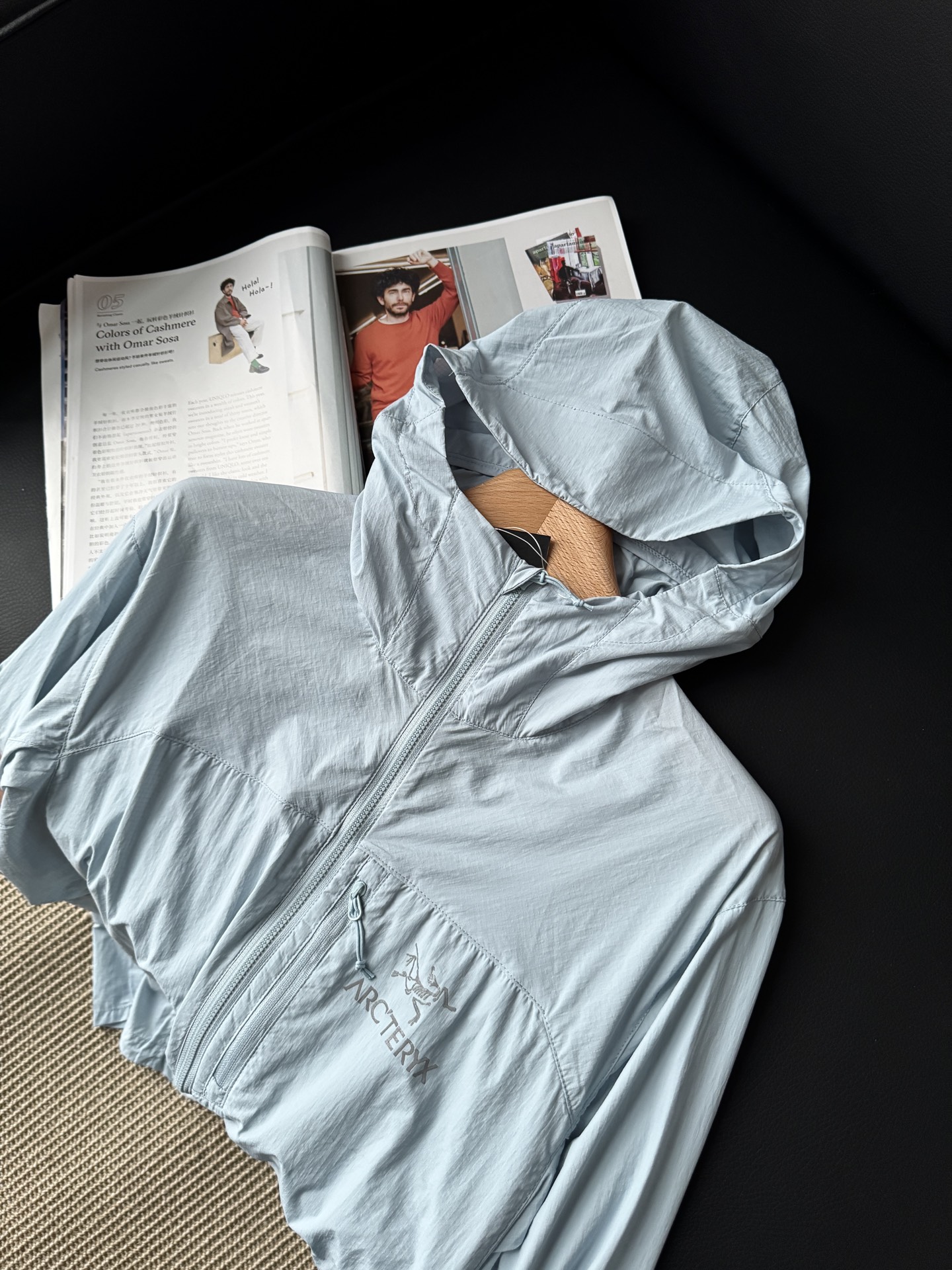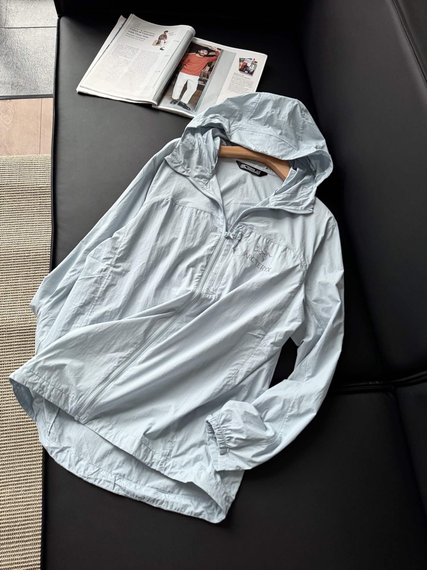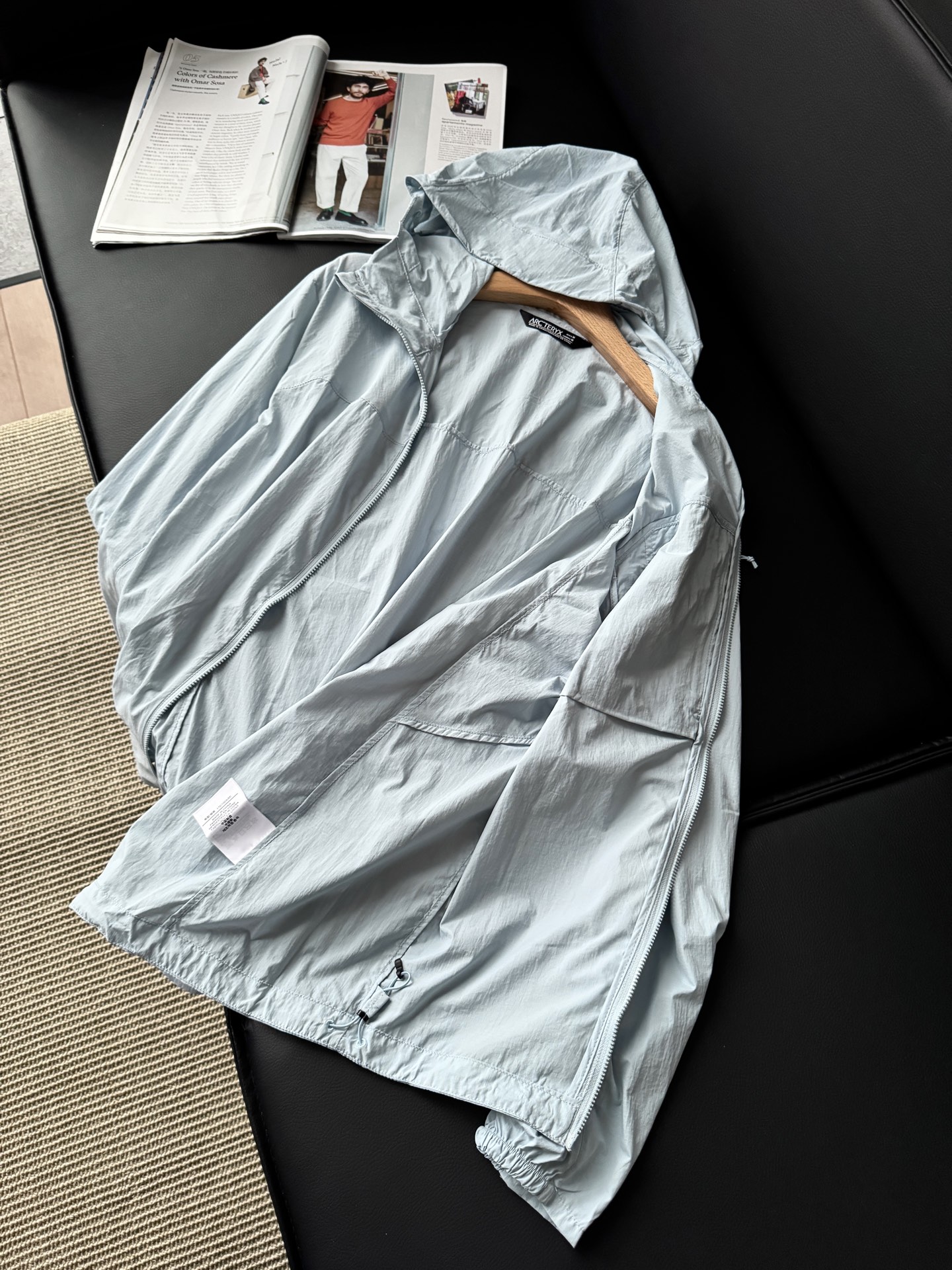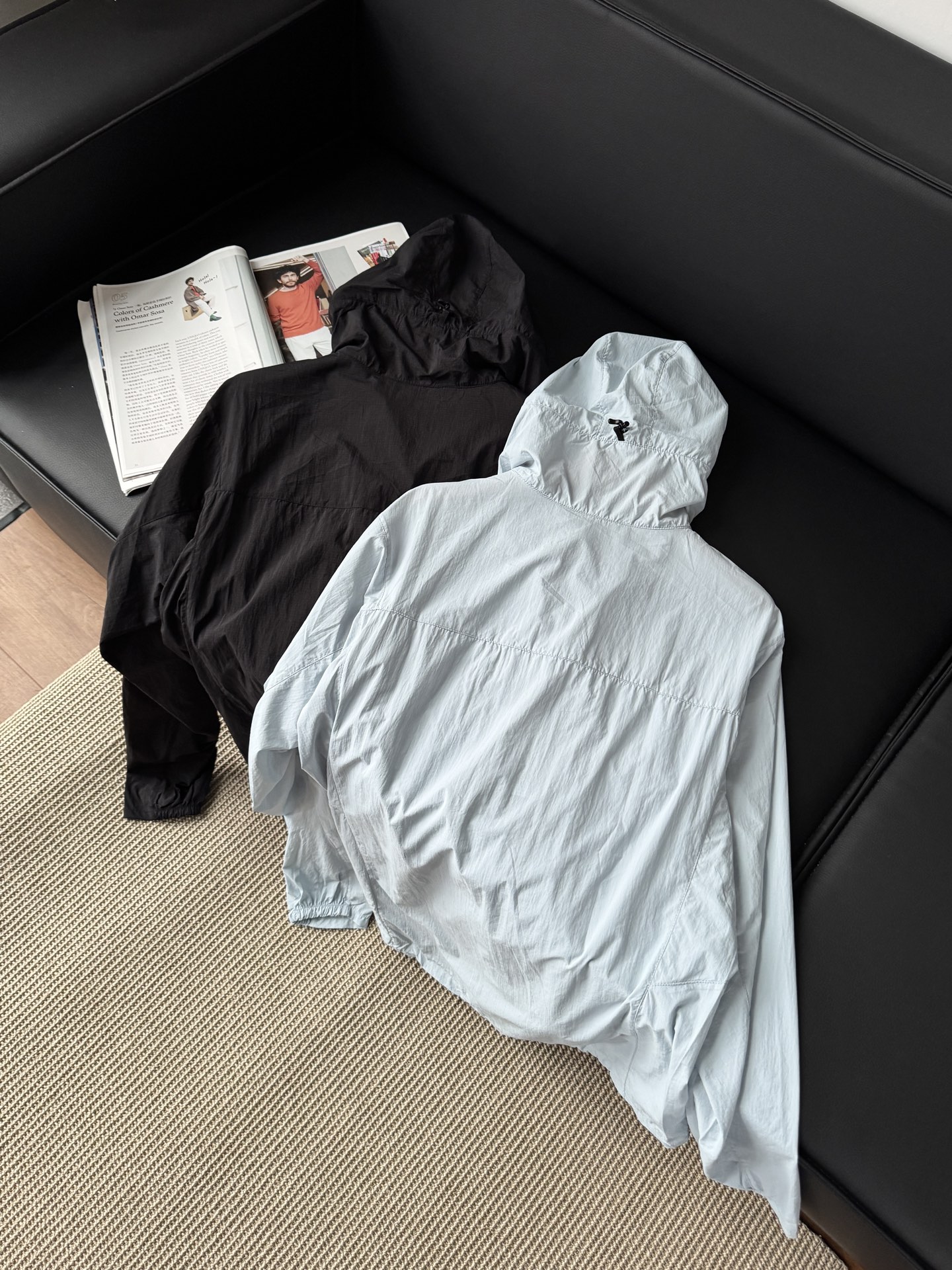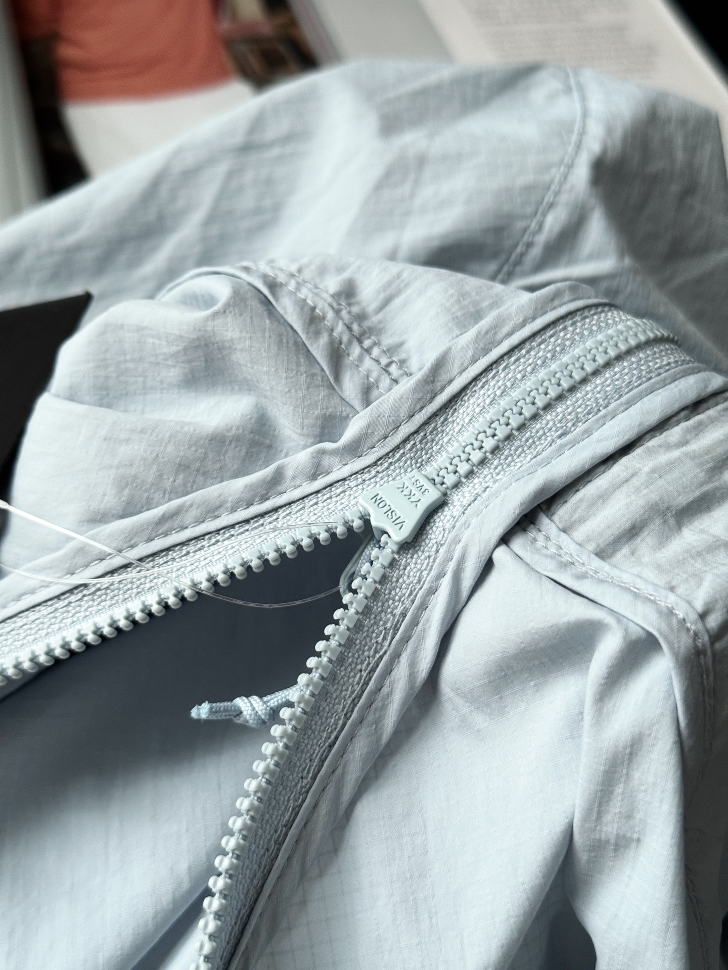 原面料 很经典的防护型防晒衣,UPF50+的防晒值,可以穿情侣款,超级实穿的防晒衣, 日常通勤,休闲运动、或者是户外徒步都OK,Tyono30防撕裂机织面料,表面都有暗格纹结构,轻量、防风、防雨、防撕裂防护性很好,户外小雨不用担心,透气、防潮不挑男女,上身酷飒十足,高级感满满的都市机能风, 胸前单侧做了拉链口袋 袖口,下摆都有收口工艺 下摆内里做有抽绳,可调节收紧半圈弹力袖口 舒适贴合手腕