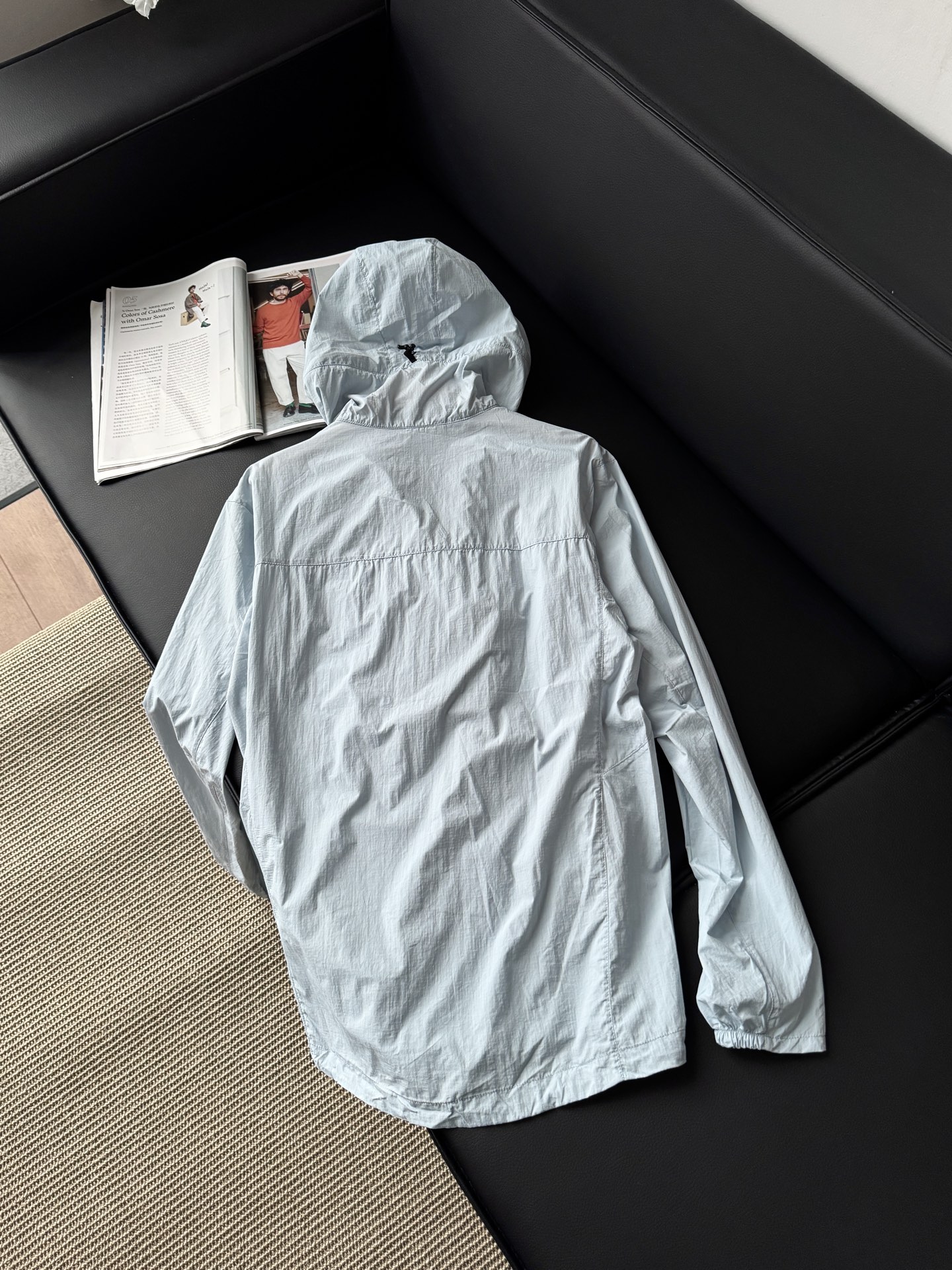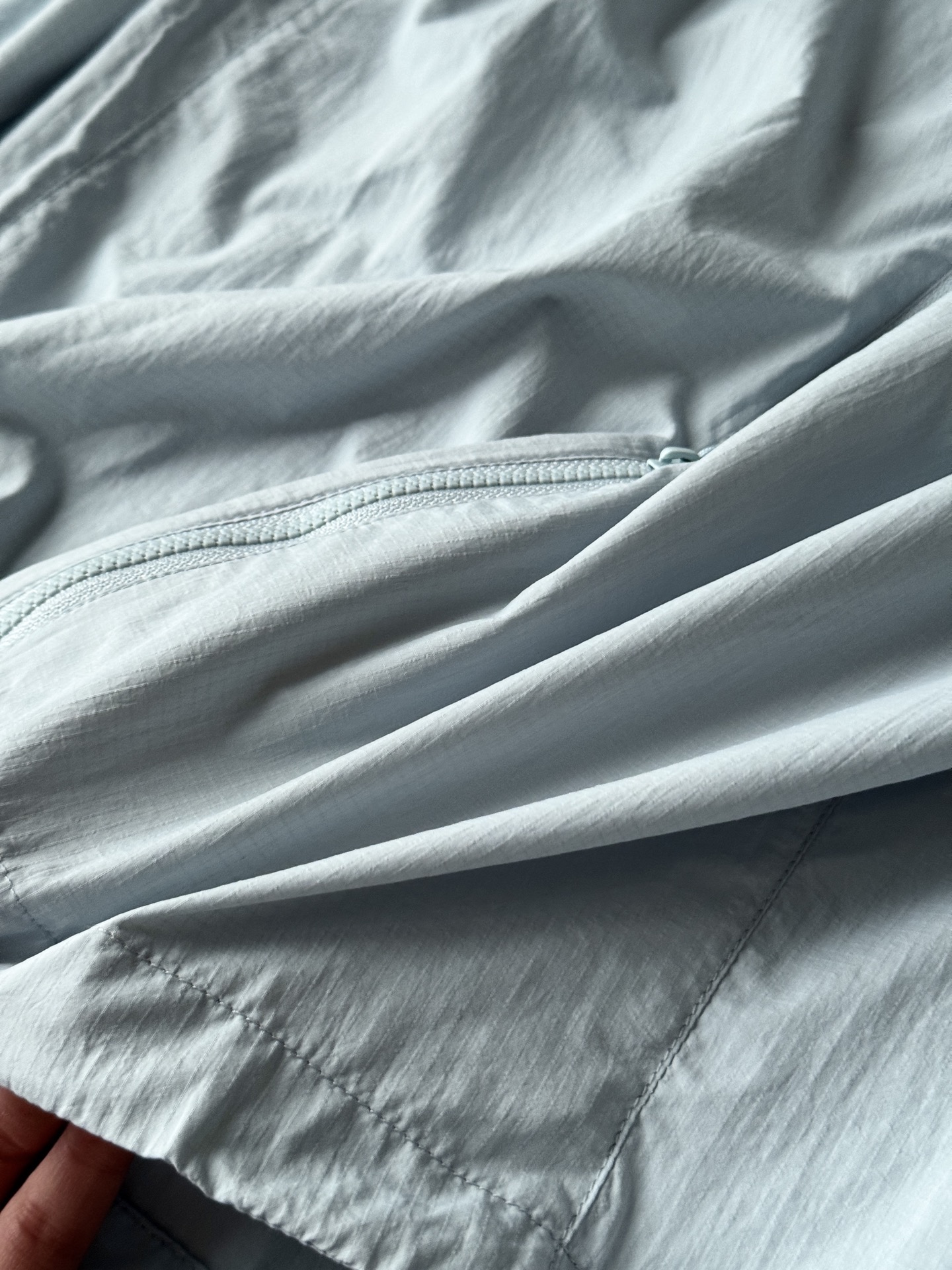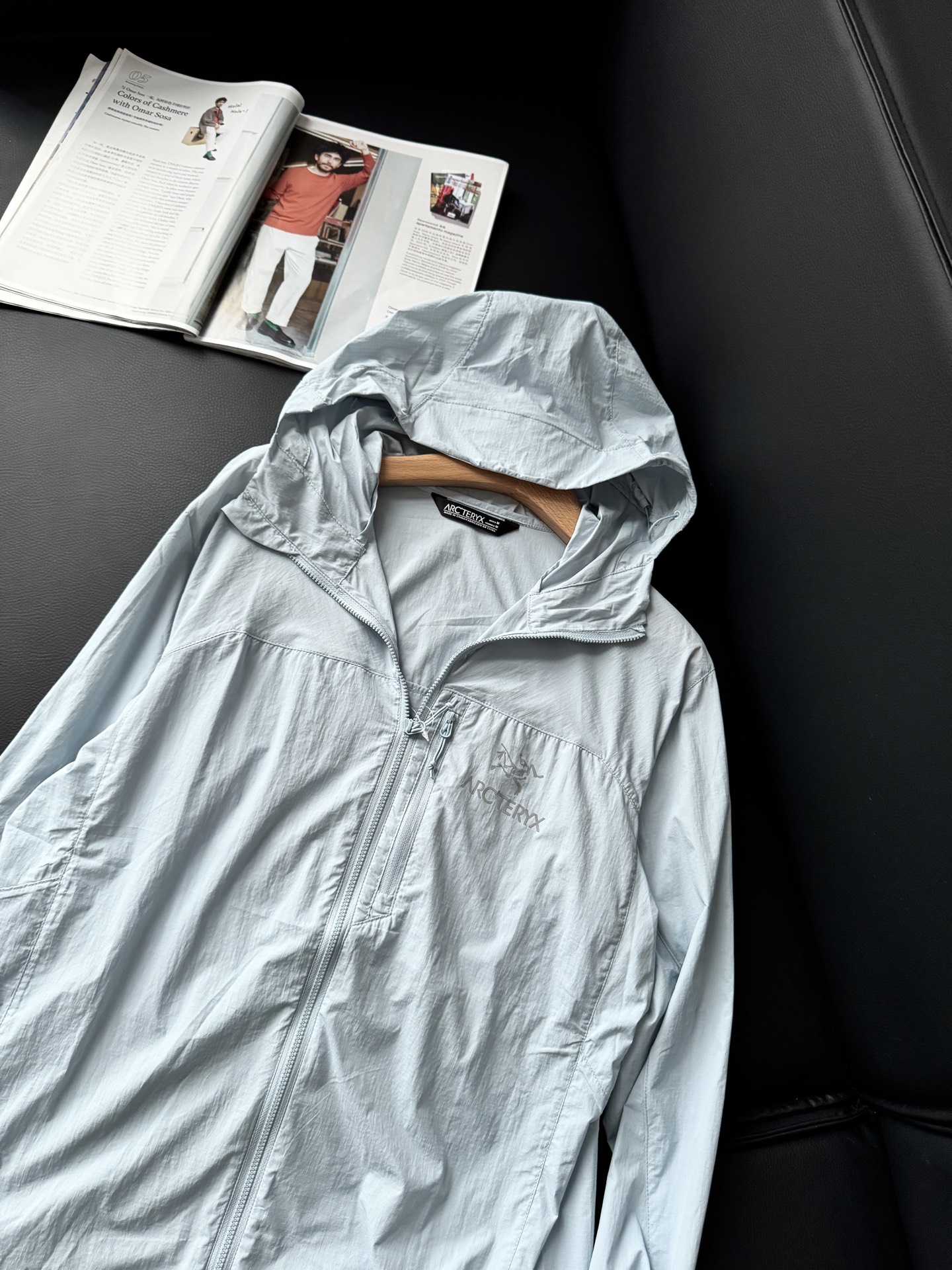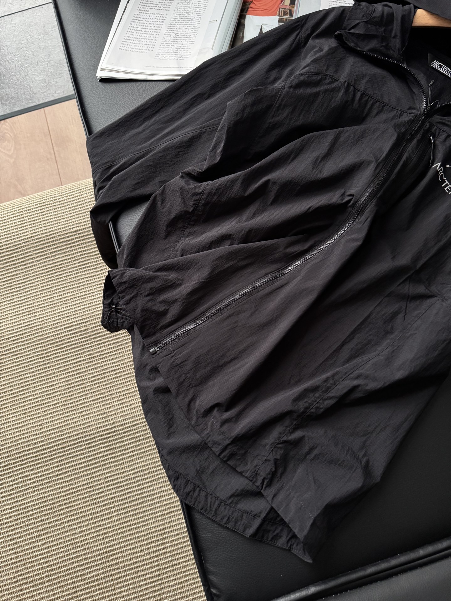 原面料 很经典的防护型防晒衣,UPF50+的防晒值,可以穿情侣款,超级实穿的防晒衣, 日常通勤,休闲运动、或者是户外徒步都OK,Tyono30防撕裂机织面料,表面都有暗格纹结构,轻量、防风、防雨、防撕裂防护性很好,户外小雨不用担心,透气、防潮不挑男女,上身酷飒十足,高级感满满的都市机能风, 胸前单侧做了拉链口袋 袖口,下摆都有收口工艺 下摆内里做有抽绳,可调节收紧半圈弹力袖口 舒适贴合手腕
