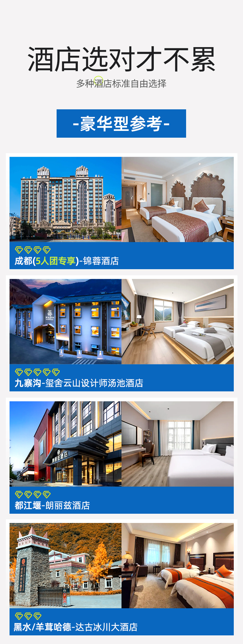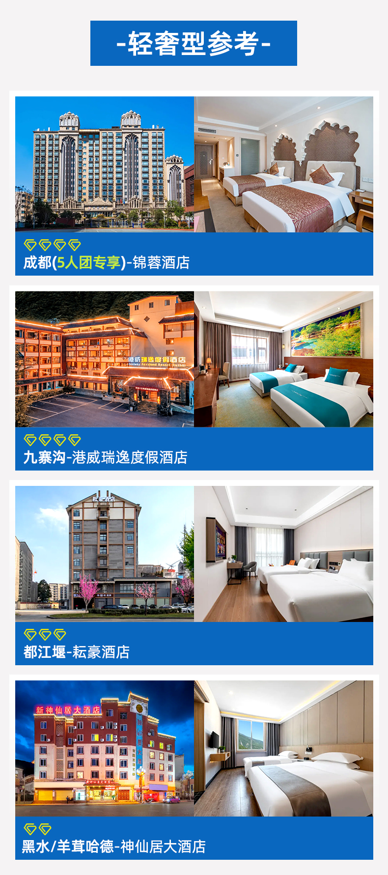 轻奢型:赠4钻成都酒店(成都索菲斯民族大酒店(宽窄巷子抚琴地铁站店)/成都锦蓉酒店(金沙遗址博物馆店)/锦客国际酒店(成都站福宁路地铁站)/成都天邑国际酒店(武侯祠锦里店)/金科圣嘉酒店(武侯祠红牌楼店)/成都熊猫假日酒店(建设路东郊记忆店)/成都港伦凯艺酒店(东郊记忆理工大学店)/扉宿酒店(成都欢乐谷金府地铁站店)或同级)、黑水/羊茸哈德(黑水基若山庄(达古冰川店)/黑水圣地酒店/黑水神仙居大酒店/黑水新区壹号酒店/黑水七彩驿旅民宿或同级 )、九寨沟口(九寨沟宜途品悦别院/九寨沟三墨酒店/朗吉弥藏酒店(九寨沟店)/九寨天澜酒店/九寨沟格尔单白马藏文化主题酒店/璟悦假日酒店(九寨沟景区游客中心店)/林景·山屿FOREST VIEW酒店/九寨沟港威瑞逸度假酒店(九寨千古情店)或同级)、都江堰(耘豪酒店/舒程酒店/蔚徕酒店/古堰南桥酒店/栖悦漫山酒店/原驿·南桥温泉酒店或同级)
