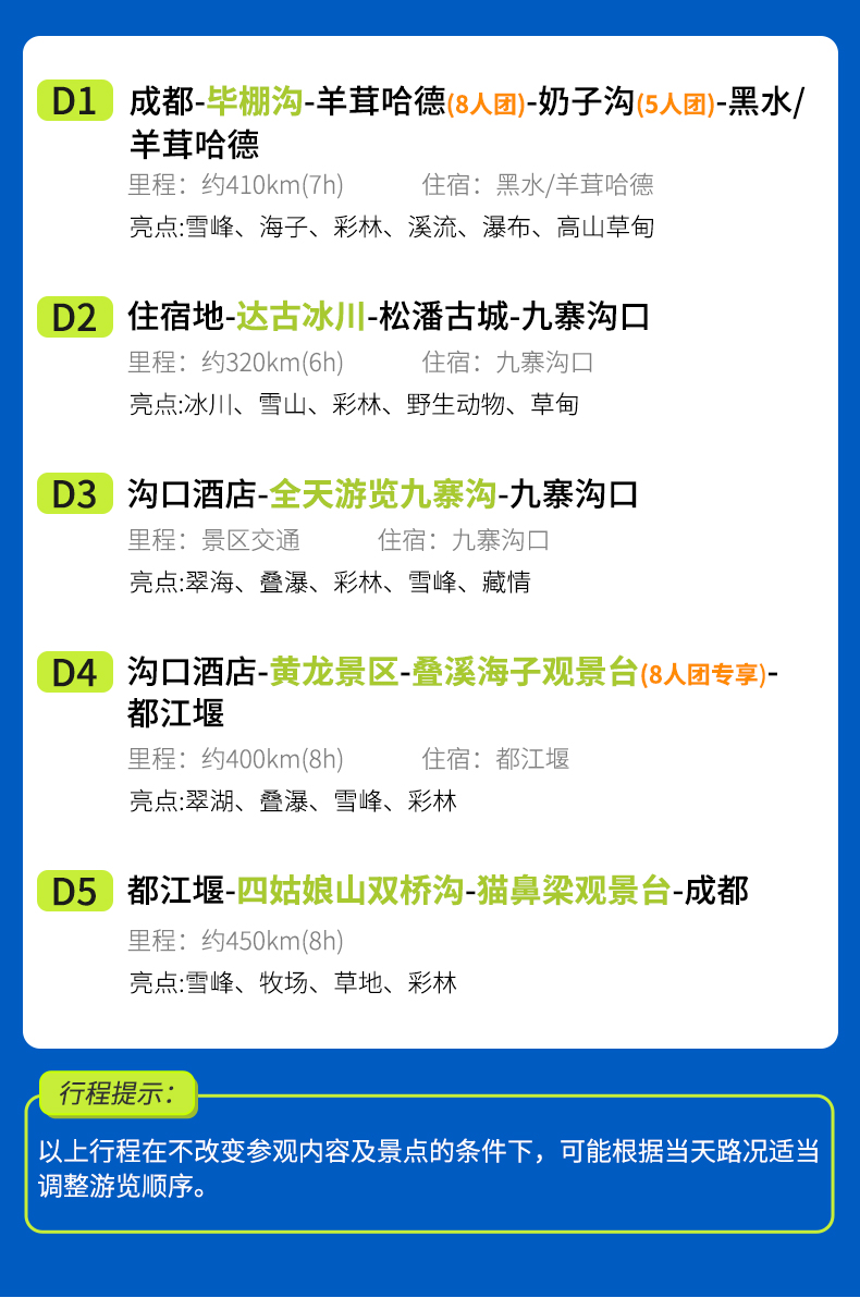 九寨沟5天5/8人小团 保证空座率+赠成都住宿/接机 打卡四姑娘山/毕棚沟/达古冰川/黄龙