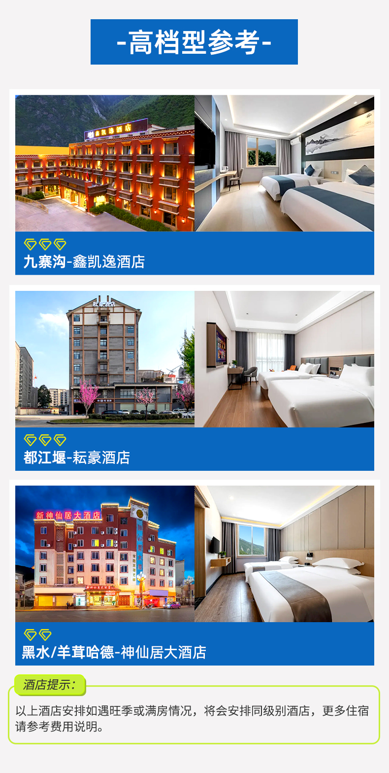 高档型:黑水(泽盖/神仙居大酒店/远山拾梦/新区壹号/碧波大酒店/金龙/冰川林卡酒店或同级)、九寨沟口(九寨阳光/星光大酒店/鑫凯逸/卓美华庭/蓝悦/喜途/益露来国际度假村/百俪度假酒店或同级)、都江堰(格瑞斯/盛逸花园/都府大酒店或同级)