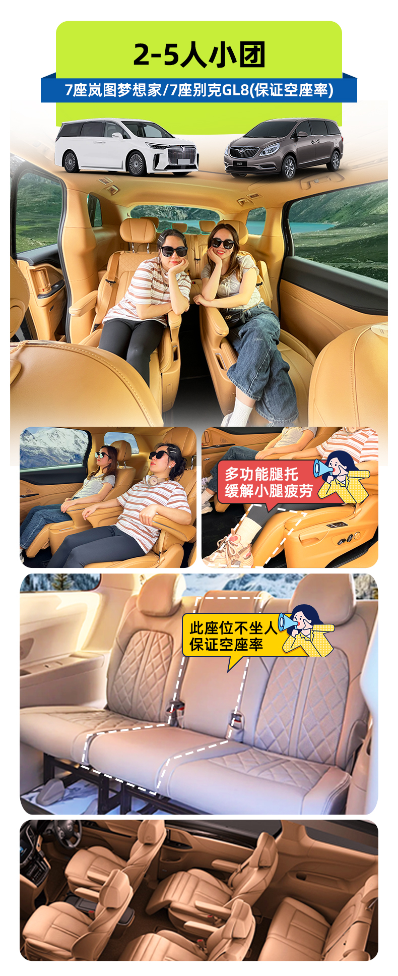 【2-5人团】:安排7座岚图梦想家或7座别克GL8(保证空座率)。