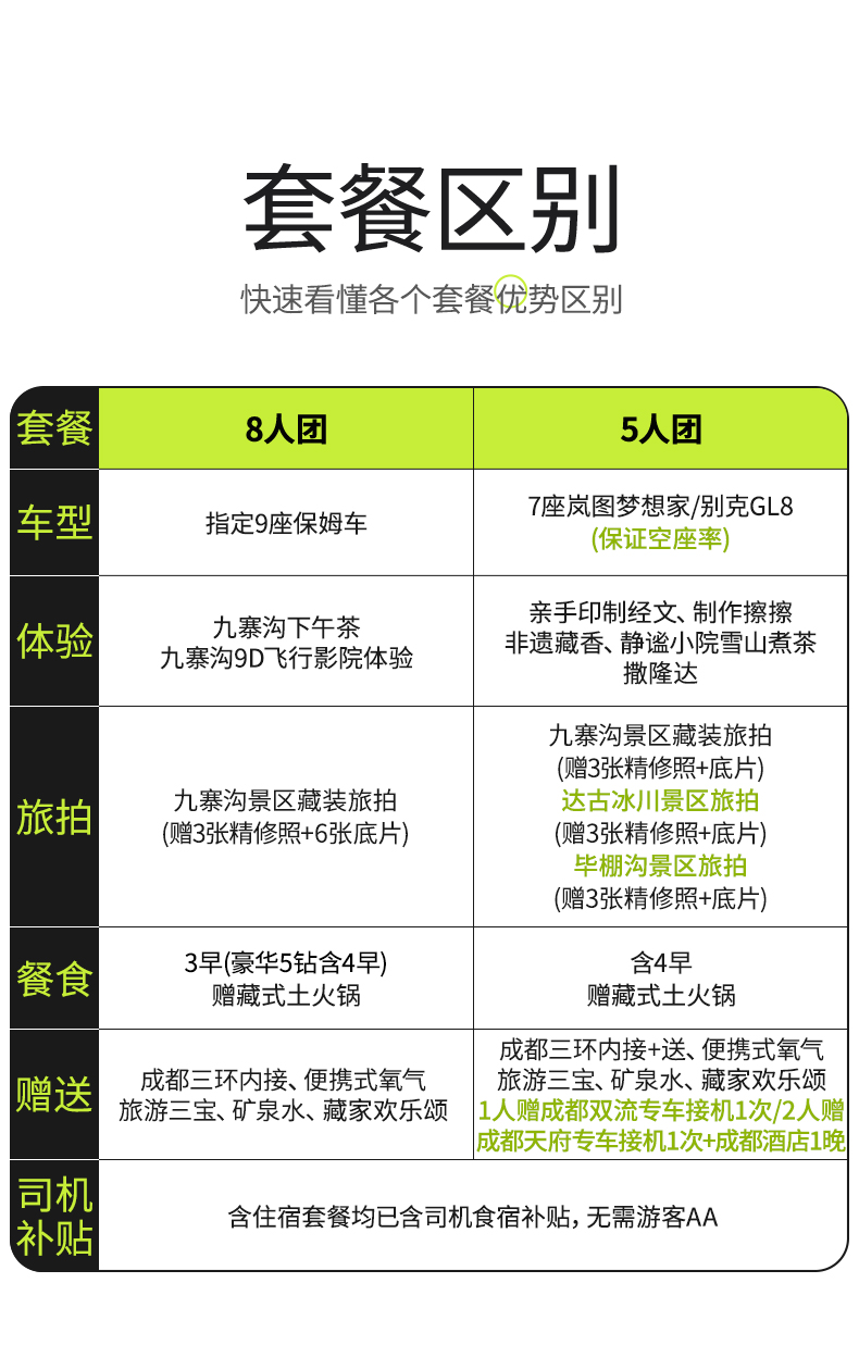 2-5人团 赠三环内上门接+送、便携氧气瓶1瓶/人、旅游三宝、 赠九寨沟景区藏装旅拍(赠3张精修照+底片;提供藏装/汉服使用,无头饰,无化妆)+达古冰川旅拍(赠3张精修+底片,不含妆造)+毕棚沟景区藏服旅拍(赠3张精修+底片,不含妆造)、矿泉水、藏家欢乐颂、手印制经文·制作擦擦·非遗藏香+静谧小院雪山煮茶+撒隆达祈福、1人赠成都双流专车接机1次,2人赠成都天府专车接机1次。