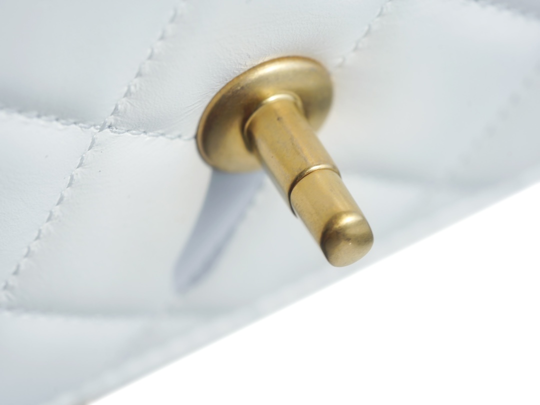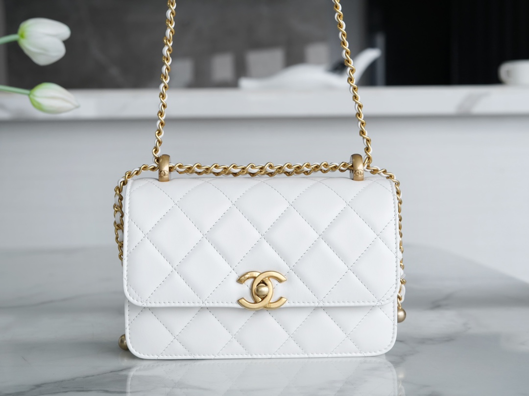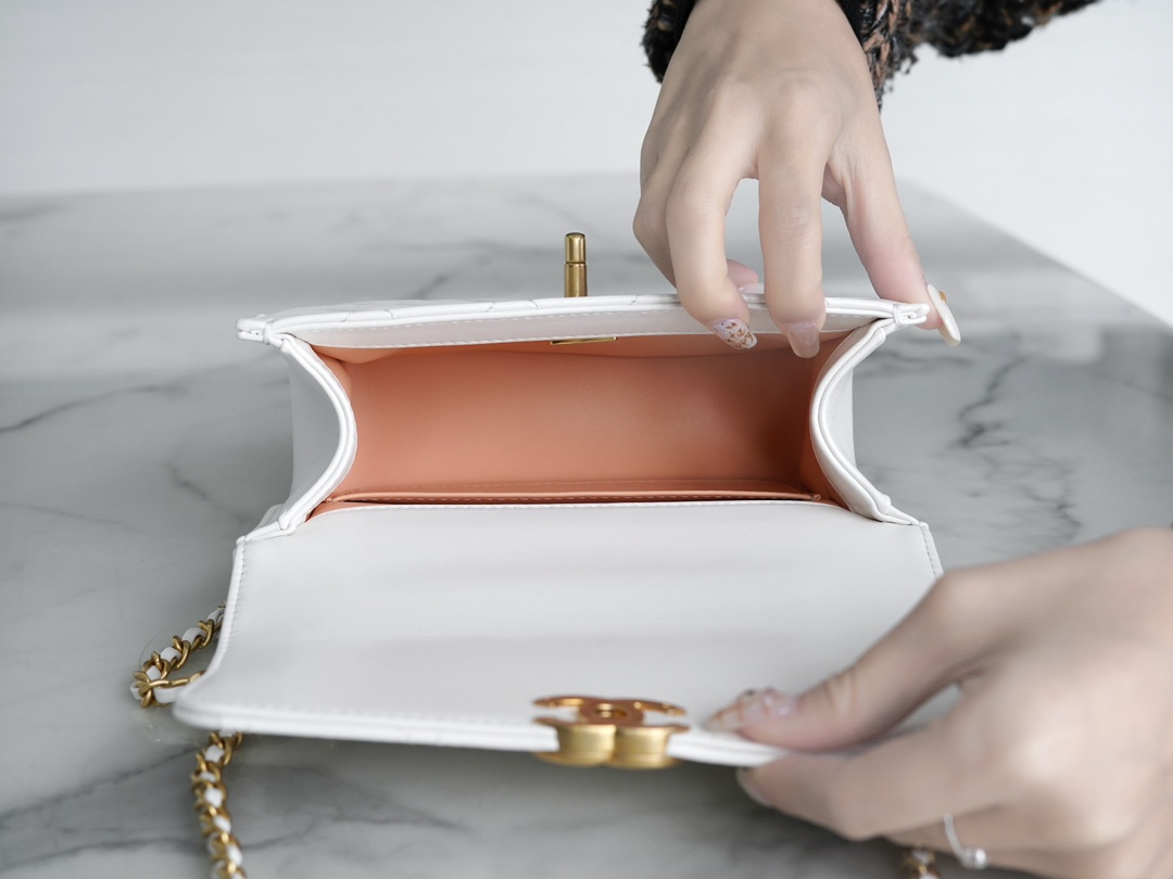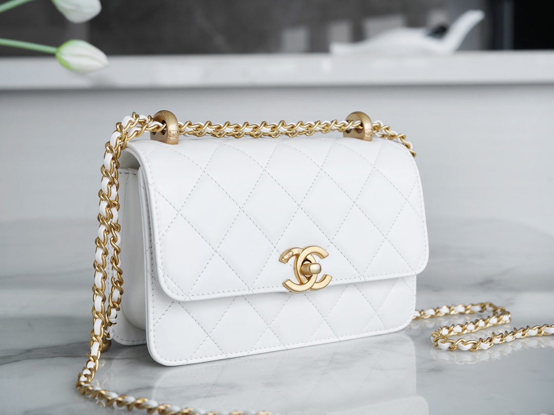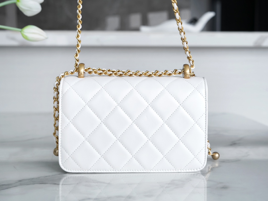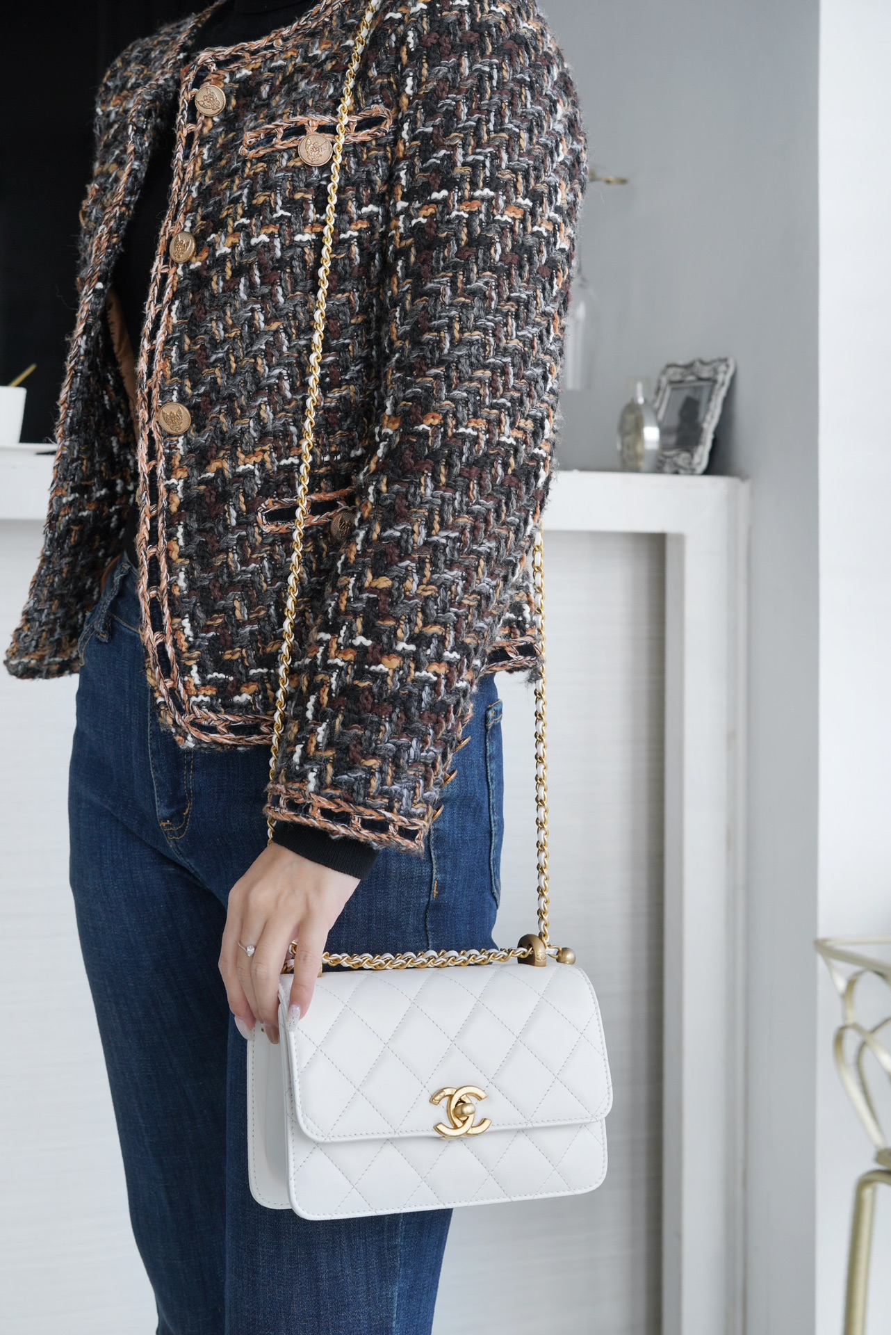 𝐂𝐇𝐀𝐍𝐄𝐋 𝟐𝟒𝐜 双金球𝗰𝗳 𝗺𝗶𝗻𝗶 𝟏𝟗𝐜𝐦 白色🤍 法国𝐇𝐚𝐚𝐬原厂光面小牛皮🐂手感细腻且有光泽感. 做旧五金搭配全新升级黑色内里‼️延续了香奈儿手袋一直以来的美感与实用性,兼顾力量与优雅的设计原则。每一个细节都散发着精致感,低调而高级说的就是Ta没错了~
