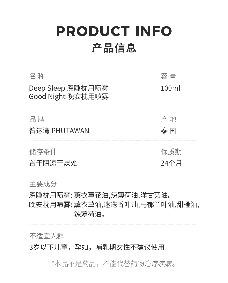 PHUTAWAN普达湾泰国进口晚安深睡枕头精油喷雾睡眠家用喷雾100ml