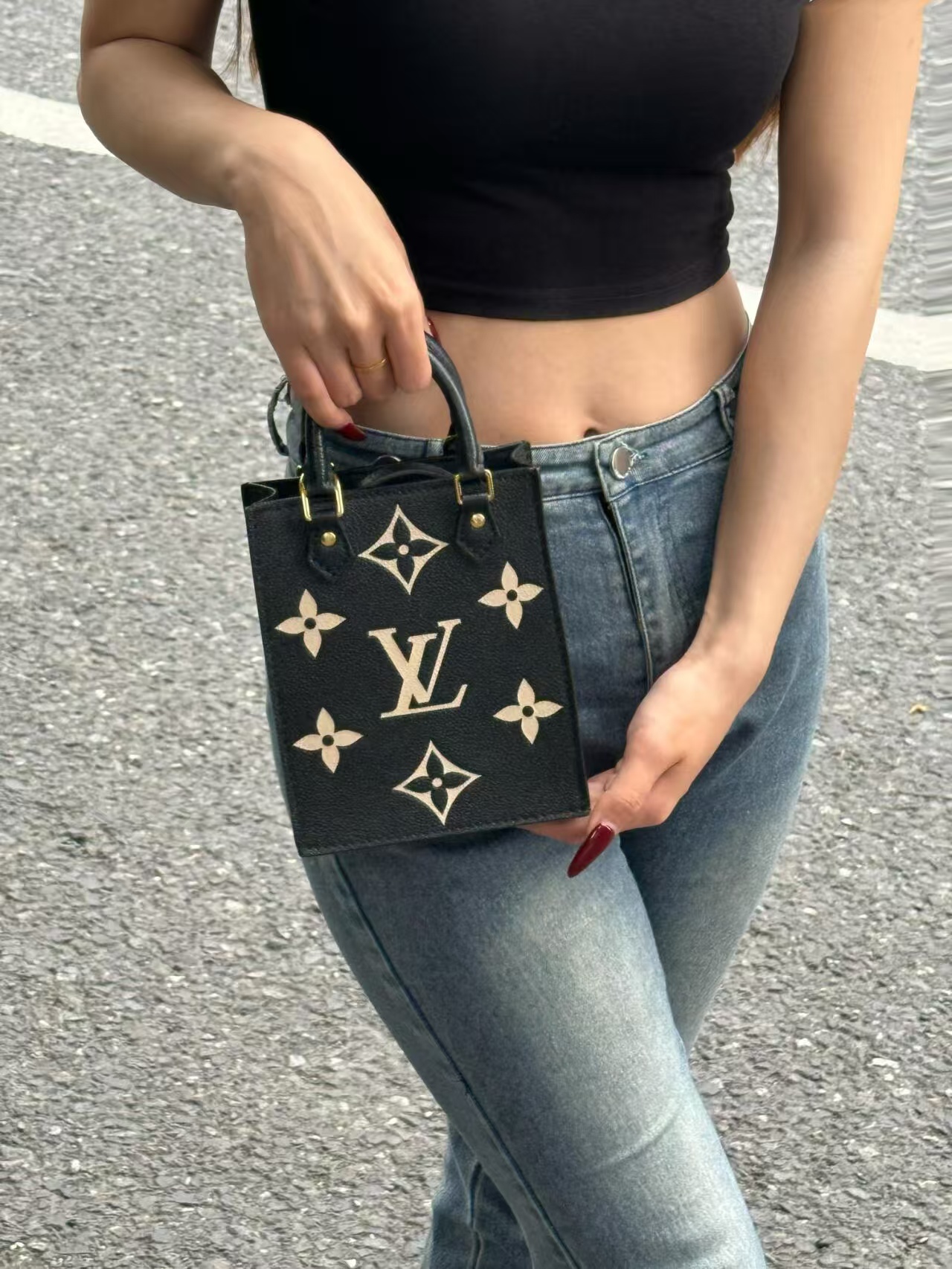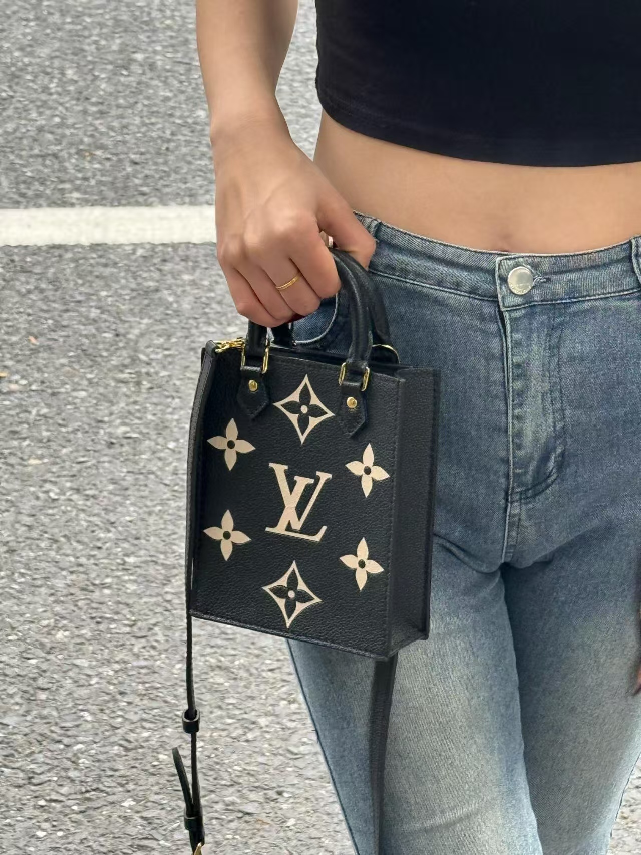 驴家 Petit Sac Plat 经典老花可拆卸 软粒面牛皮 琴谱包托特包购物袋单肩斜挎手提包 迷你 女款 黑色拼米色(JPH)