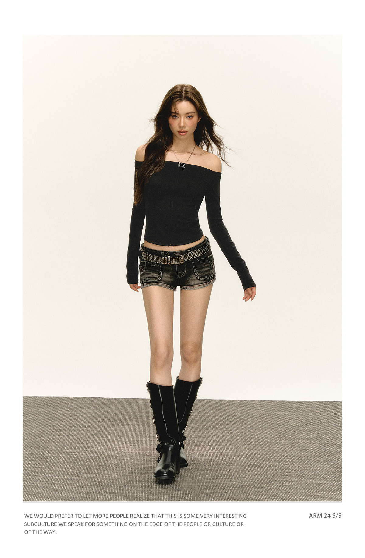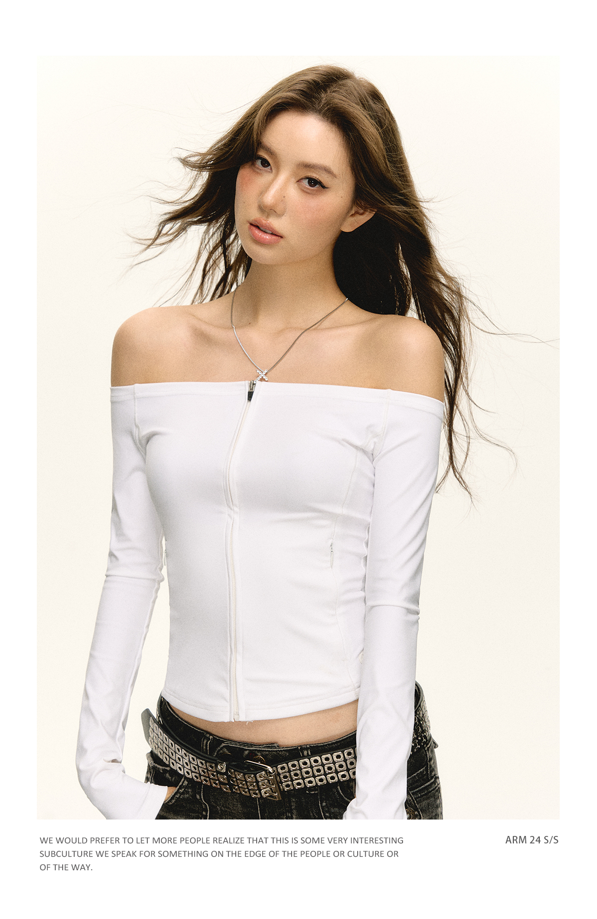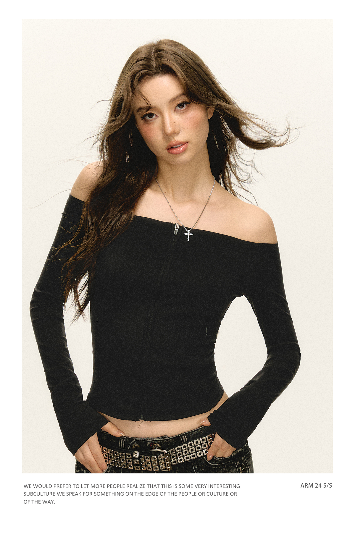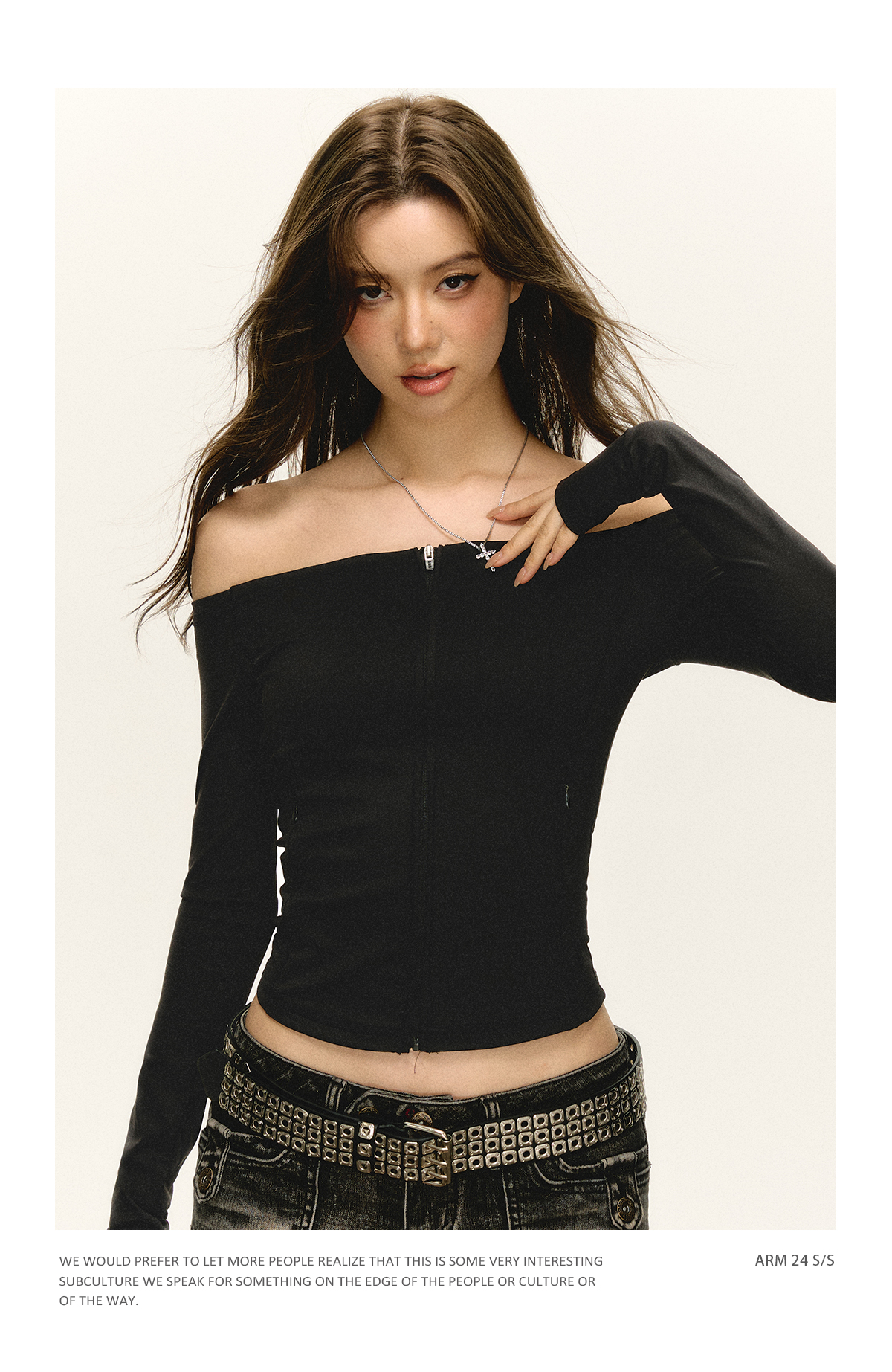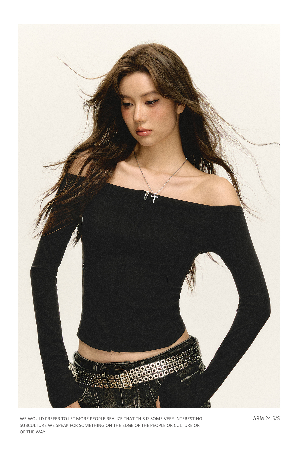 Ariseism 美式复古设计感露肩长袖开衫t恤女春季新款修身打底上衣