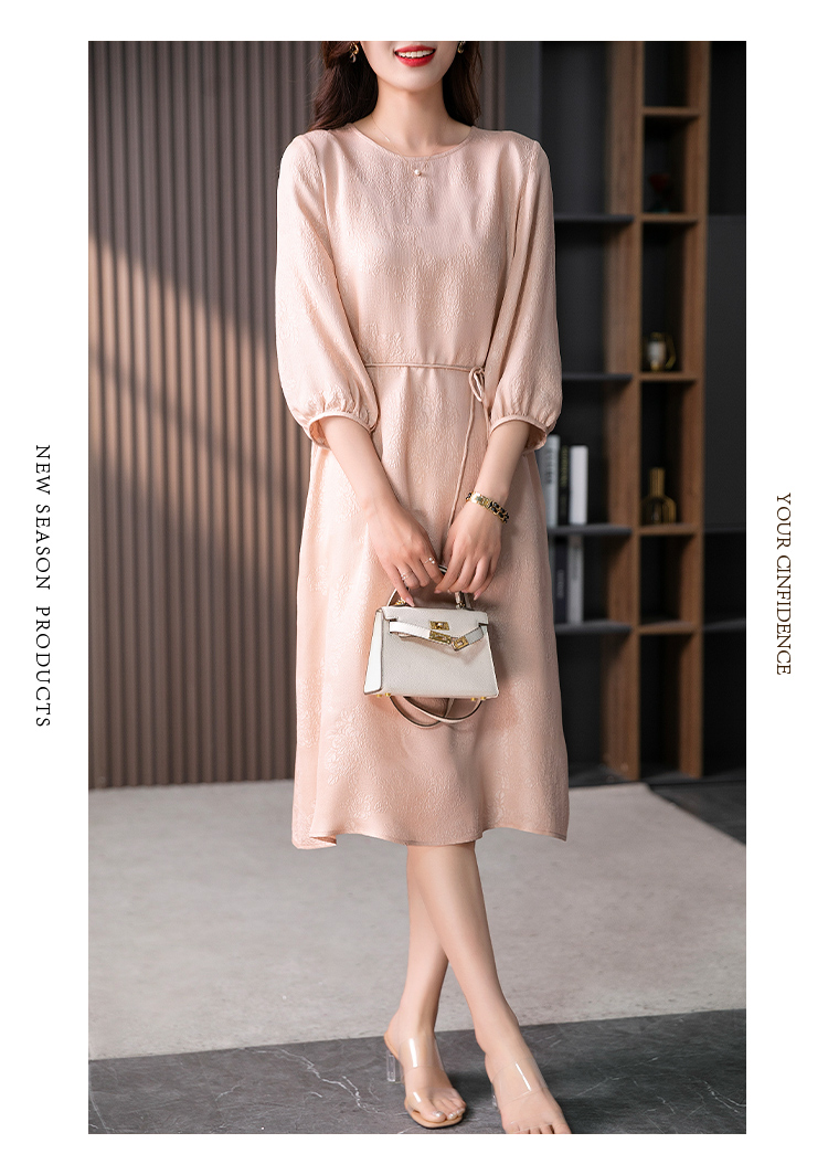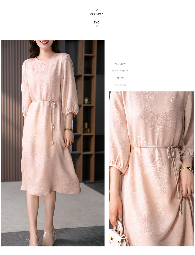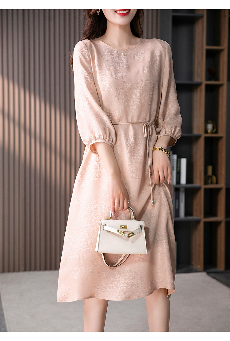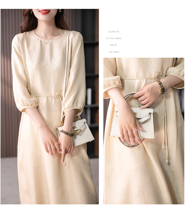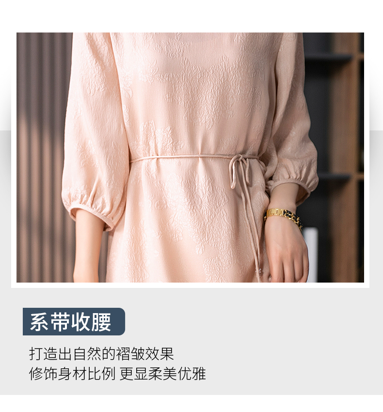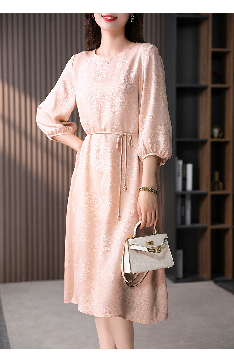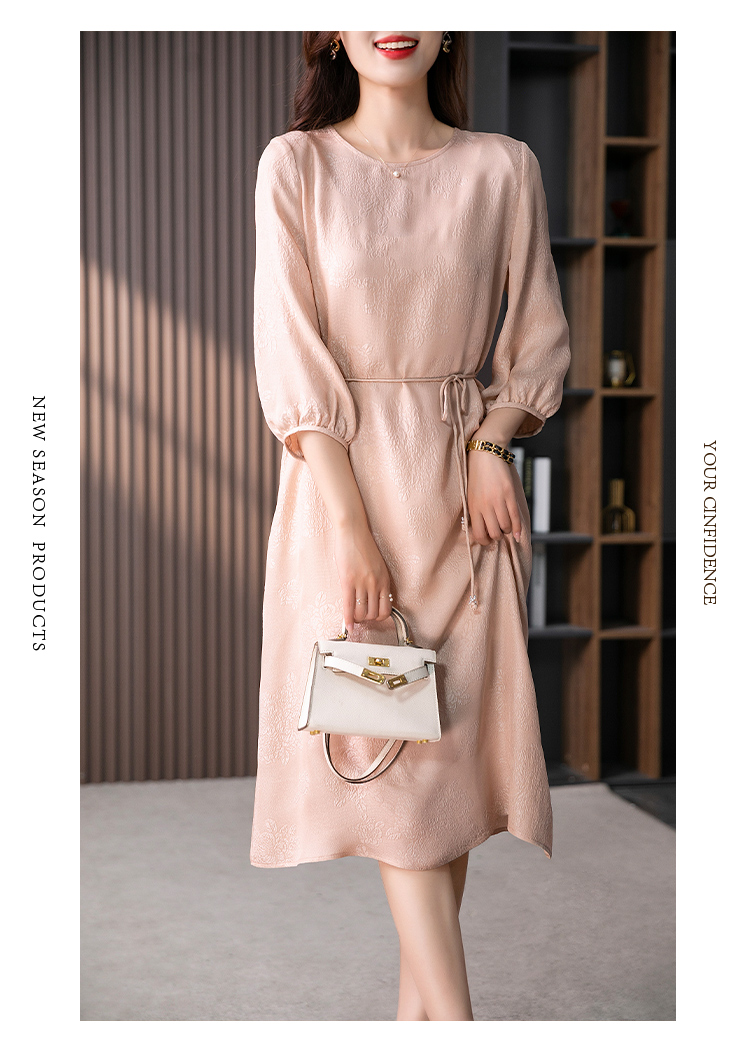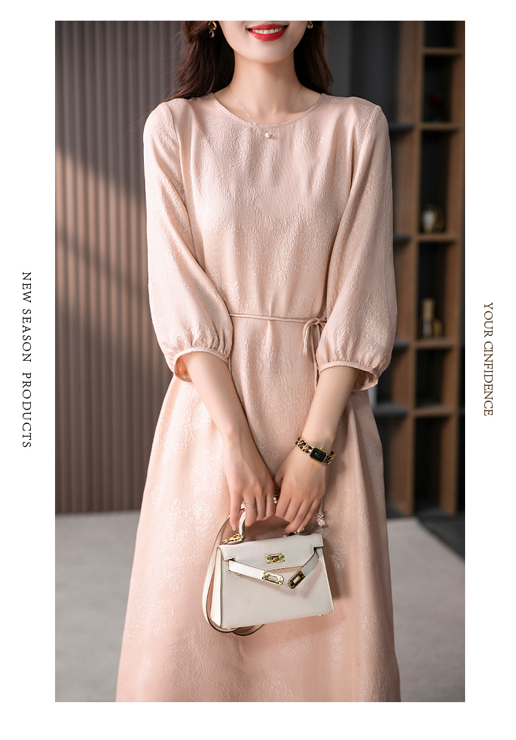 YX【定制10天】设计感提花真丝连衣裙女夏2023新款灯笼袖桑蚕丝系带中长裙子