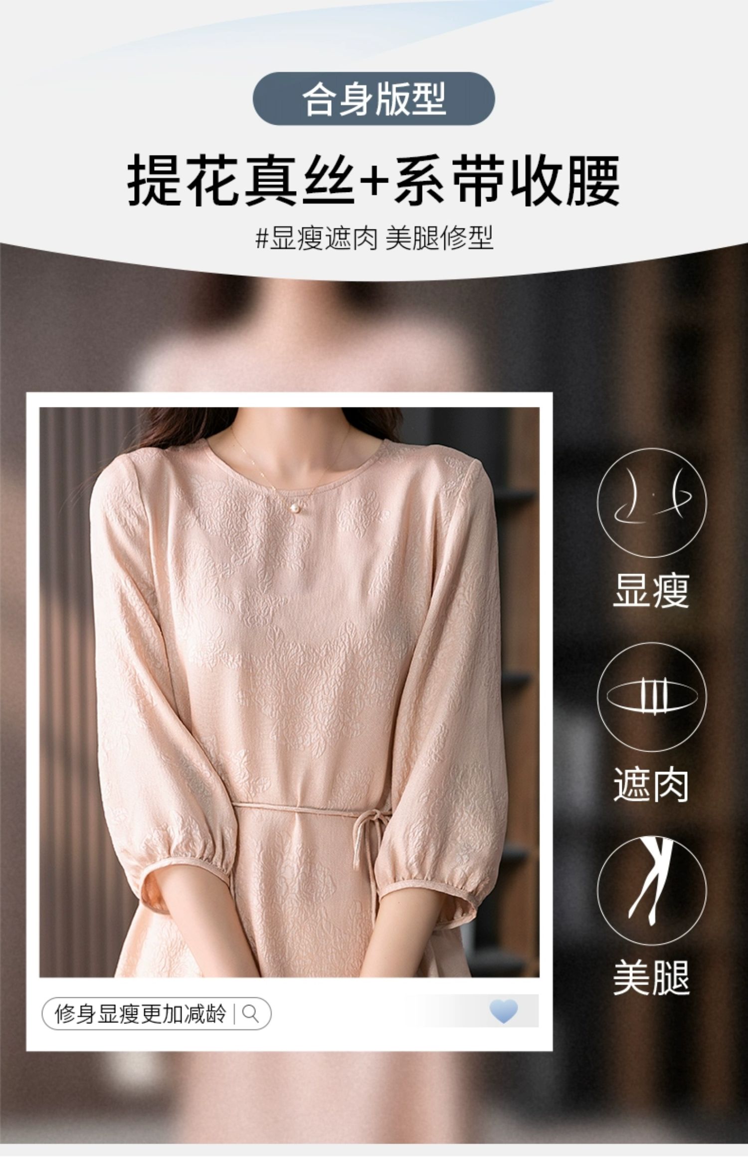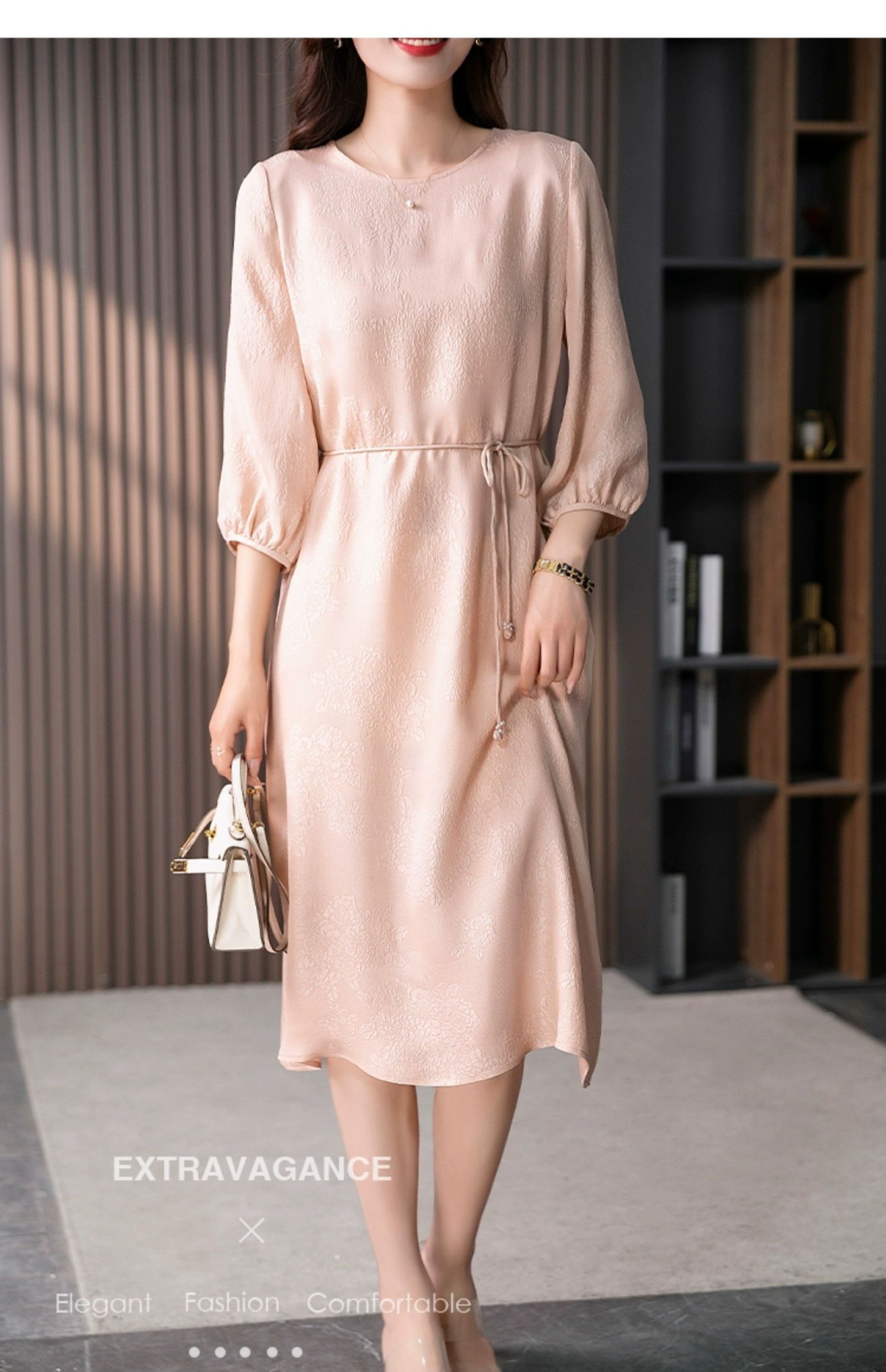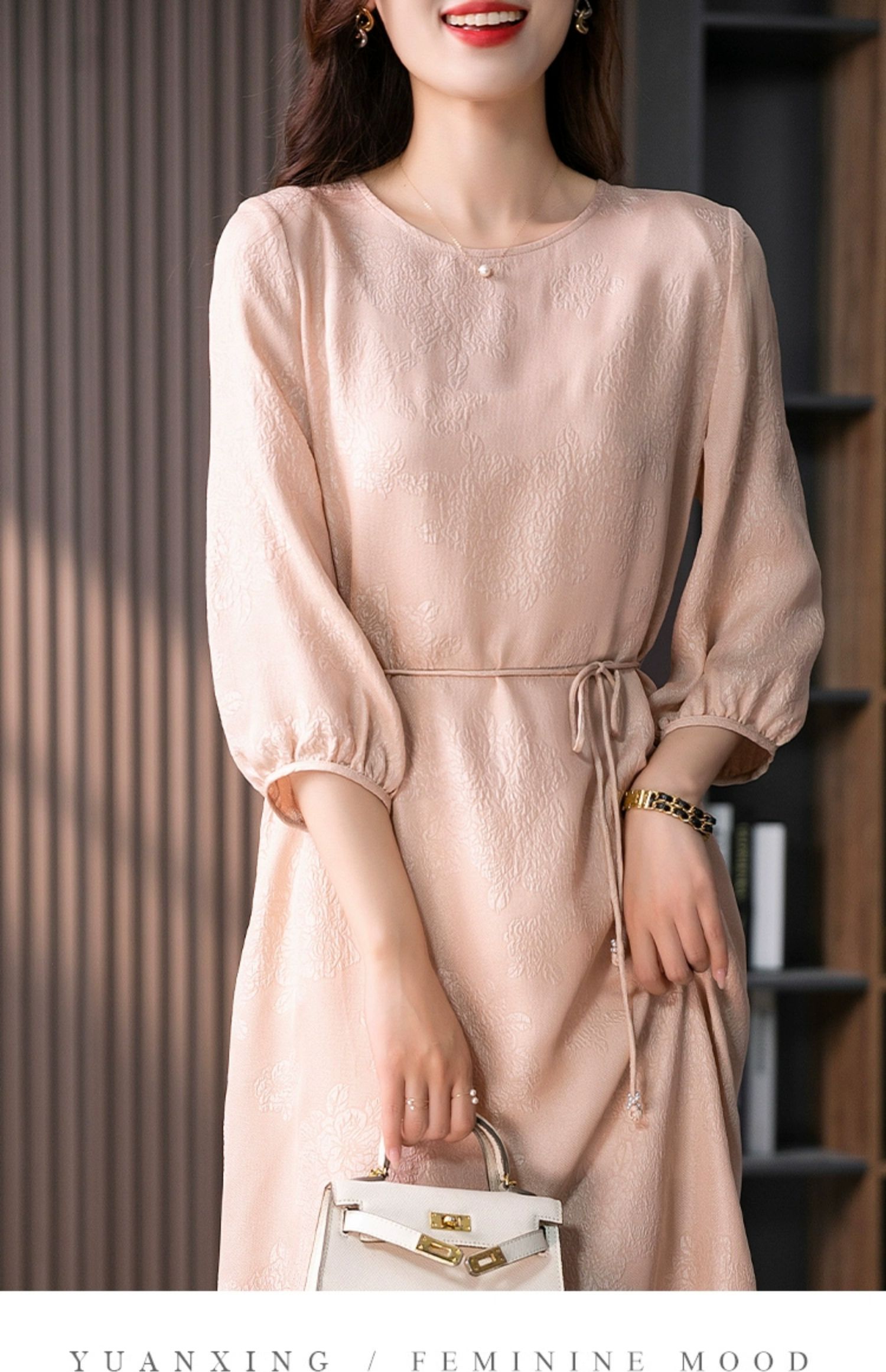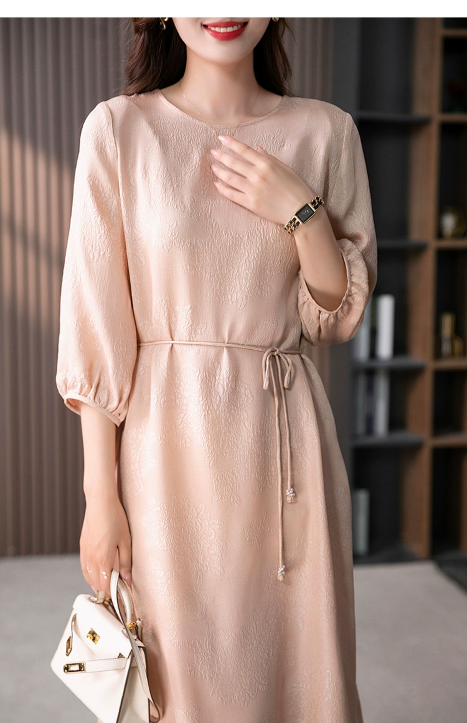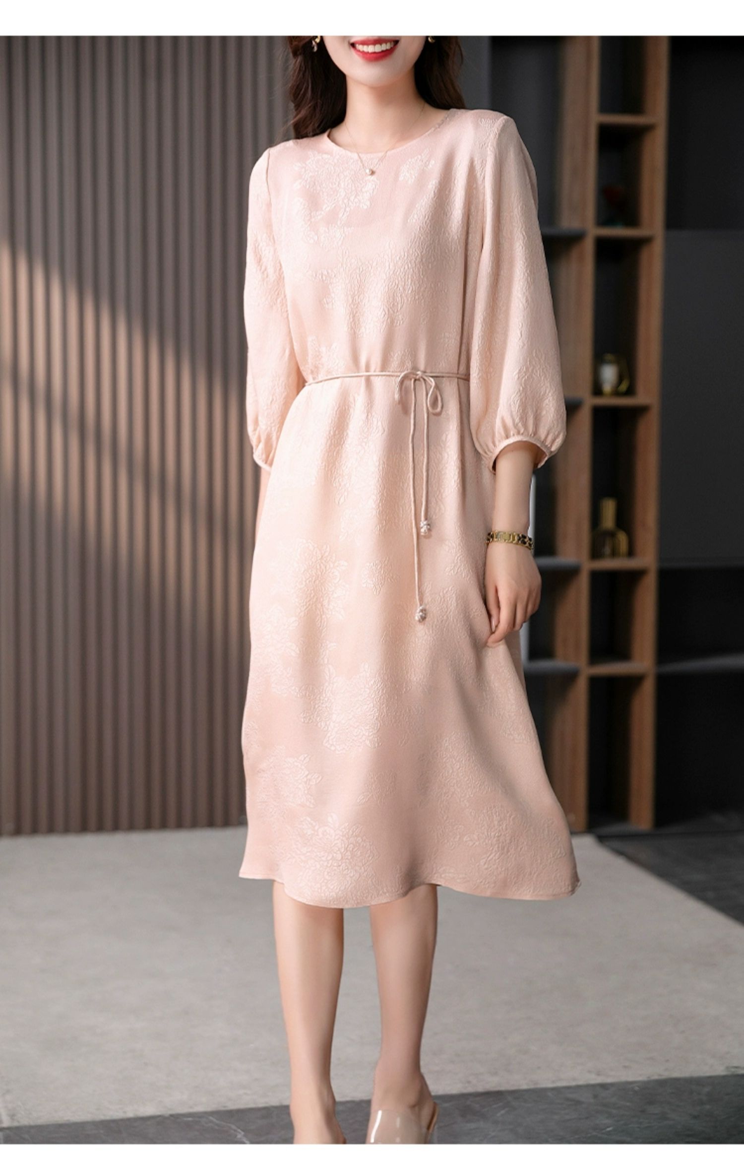 YX【定制10天】设计感提花真丝连衣裙女夏2023新款灯笼袖桑蚕丝系带中长裙子