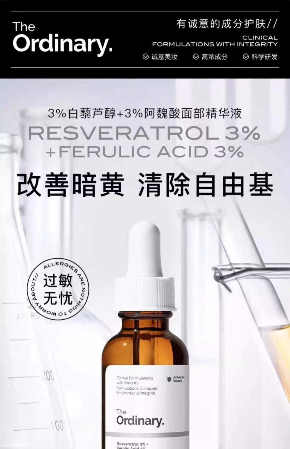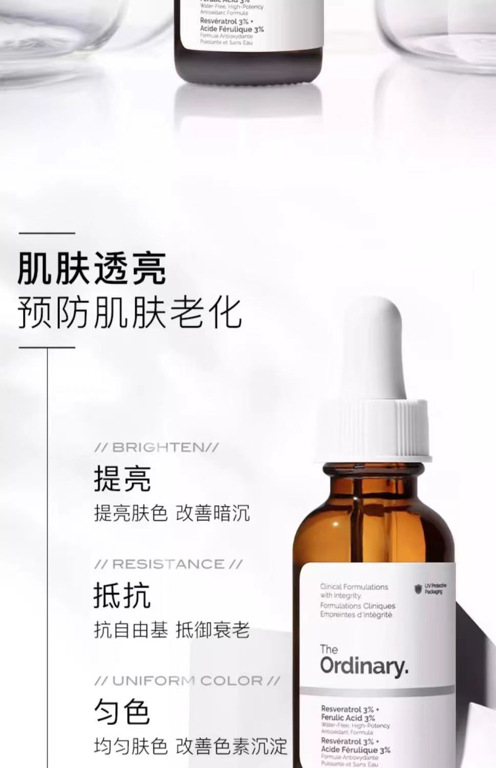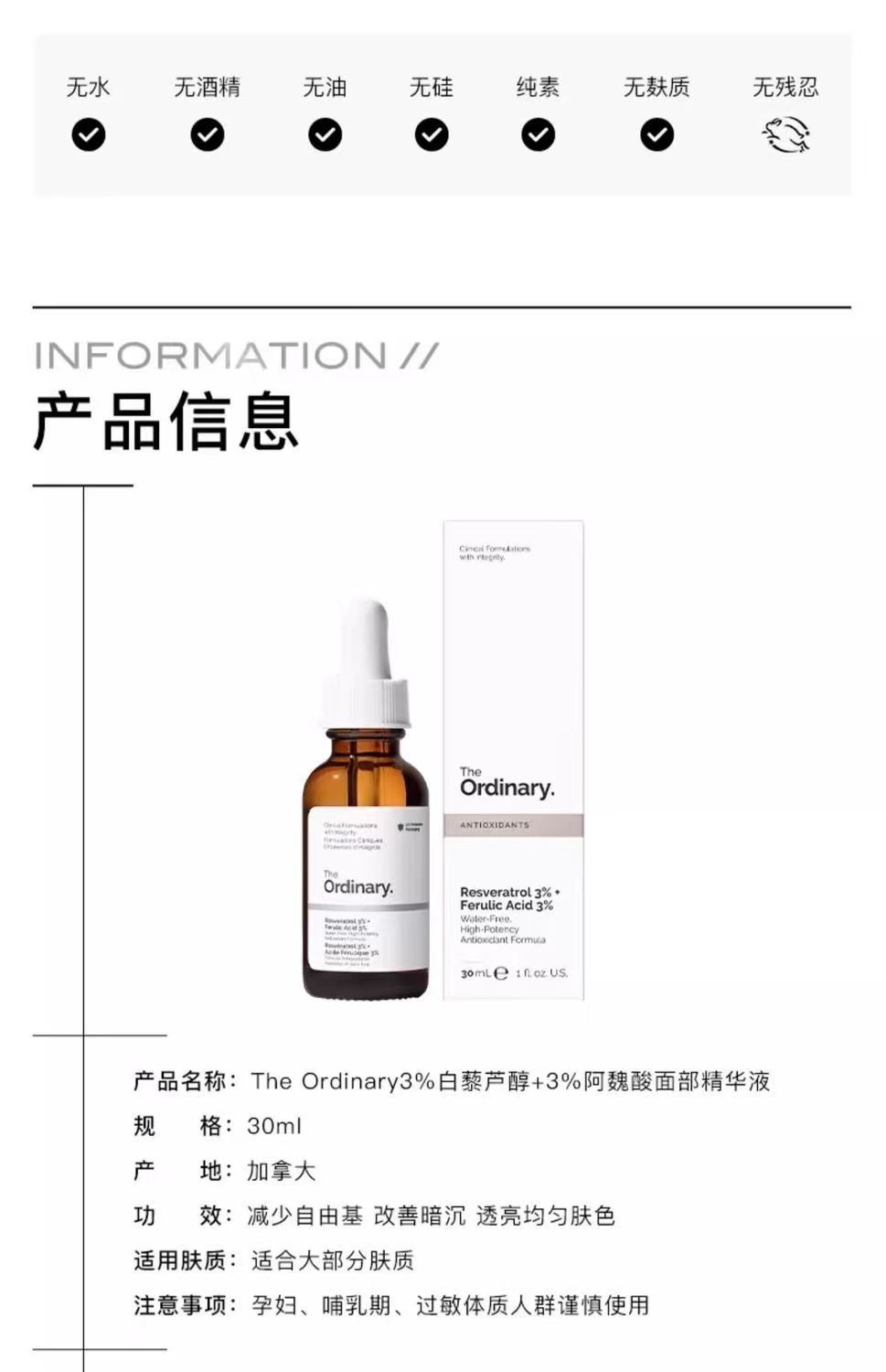 The Ordinary 3%白藜芦醇+3%阿魏酸抗氧化精华30ml 补水保湿提亮肤色