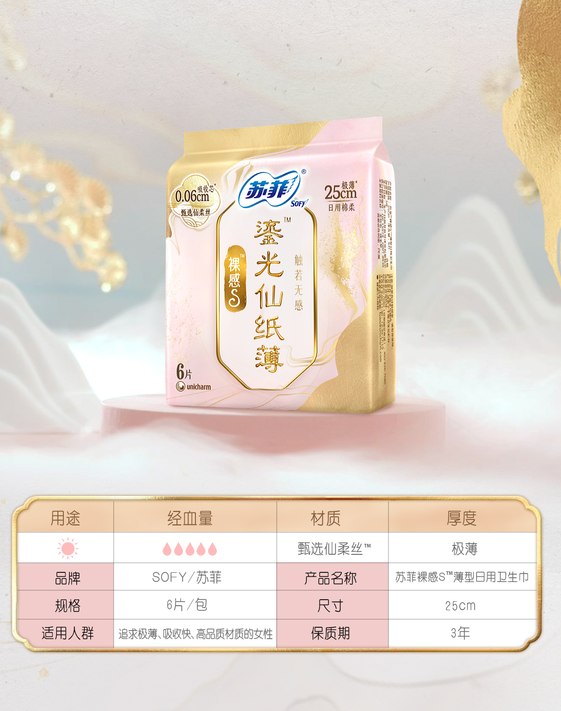[七彩鲜生]苏菲裸感S鎏光仙纸薄250mm*2*3袋【俊发城次日自提】