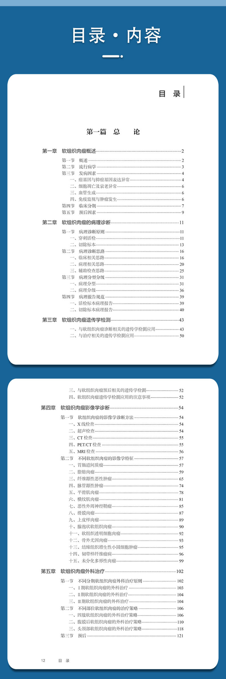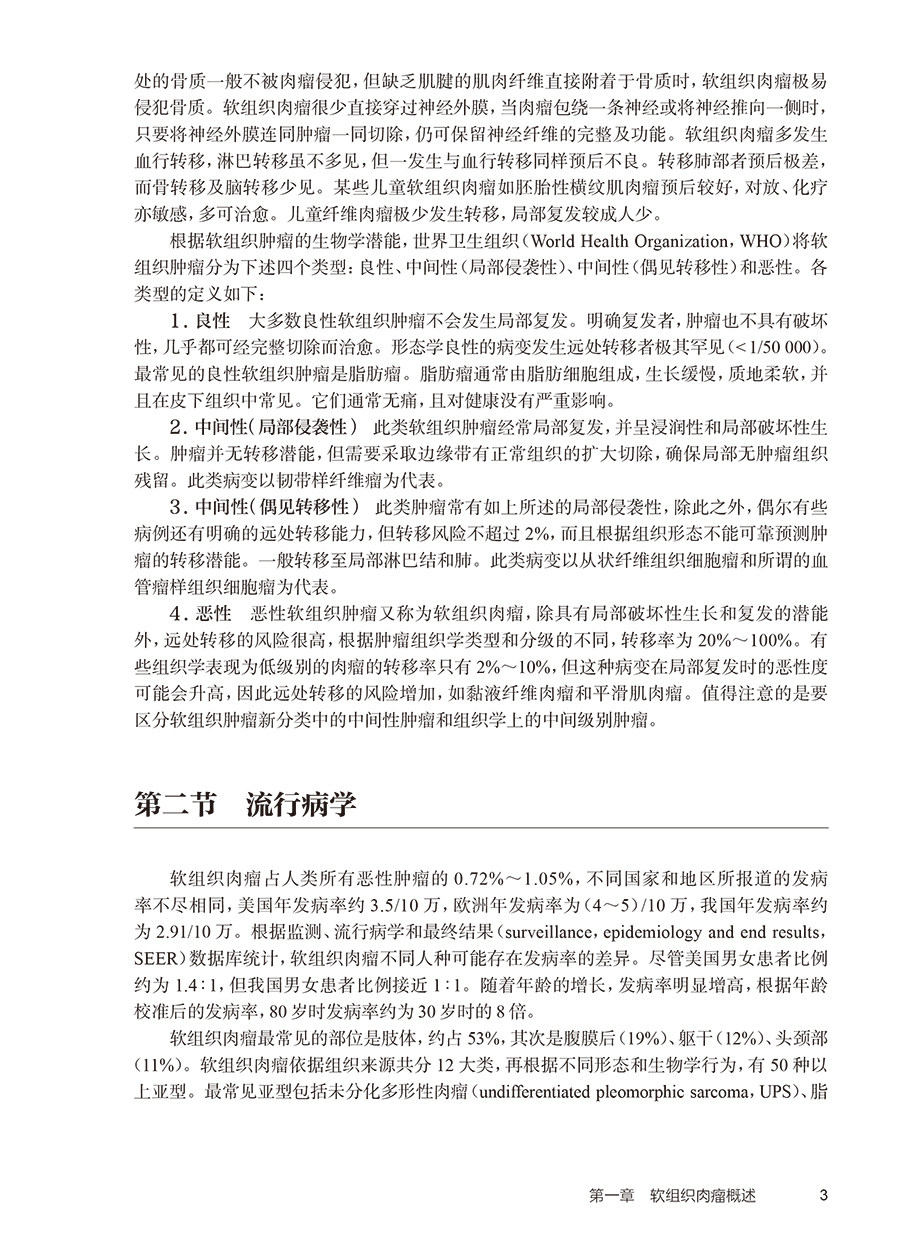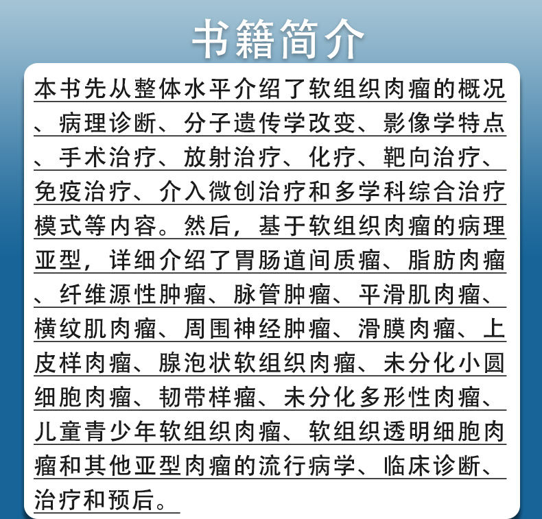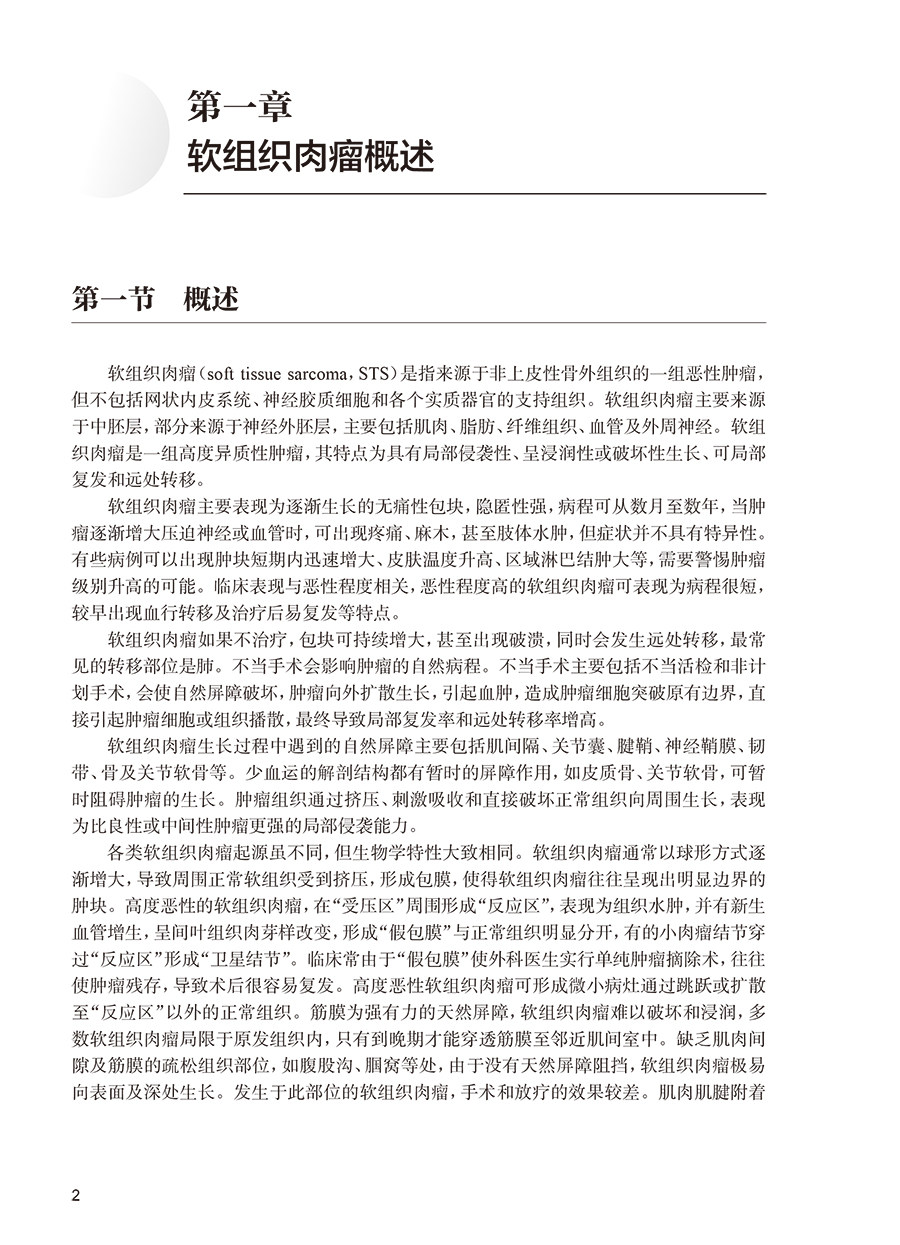本书先从整体水平介绍了软组织肉瘤的概况、病理诊断、分子遗传学改变、影像学特点、手术治疗、放射治疗、化疗、靶向治疗、免疫治疗、介入微创治疗和多学科综合治疗模式等内容。然后,基于软组织肉瘤的病理亚型,详细介绍了胃肠道间质瘤、脂肪肉瘤、纤维源性肿瘤、脉管肿瘤、平滑肌肉瘤、横纹肌肉瘤、周围神经肿瘤、滑膜肉瘤、上皮样肉瘤、腺泡状软组织肉瘤、未分化小圆细胞肉瘤、韧带样瘤、未分化多形性肉瘤、儿童青少年软组织肉瘤、软组织透明细胞肉瘤和其他亚型肉瘤的流行病学、临床诊断、治疗和预后。