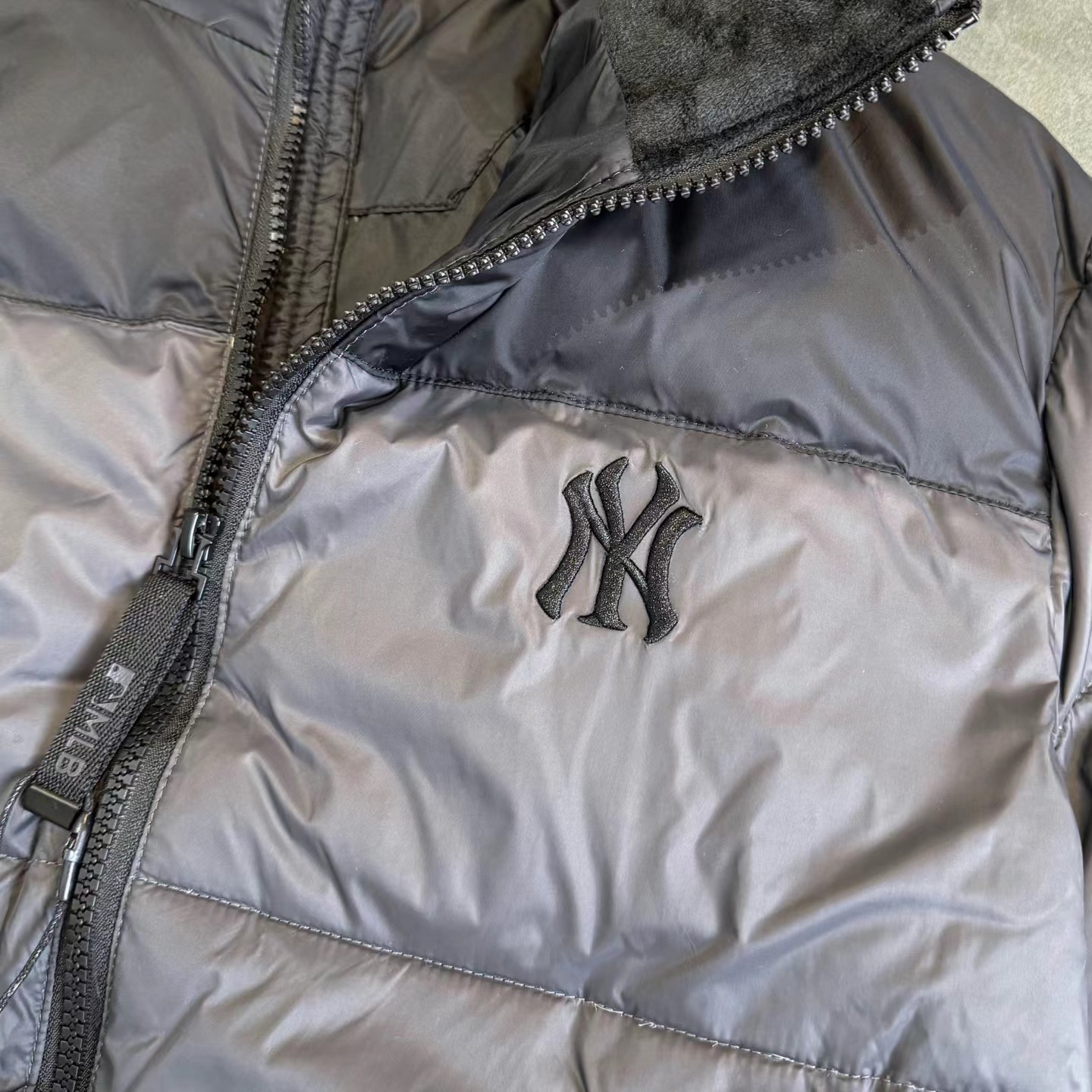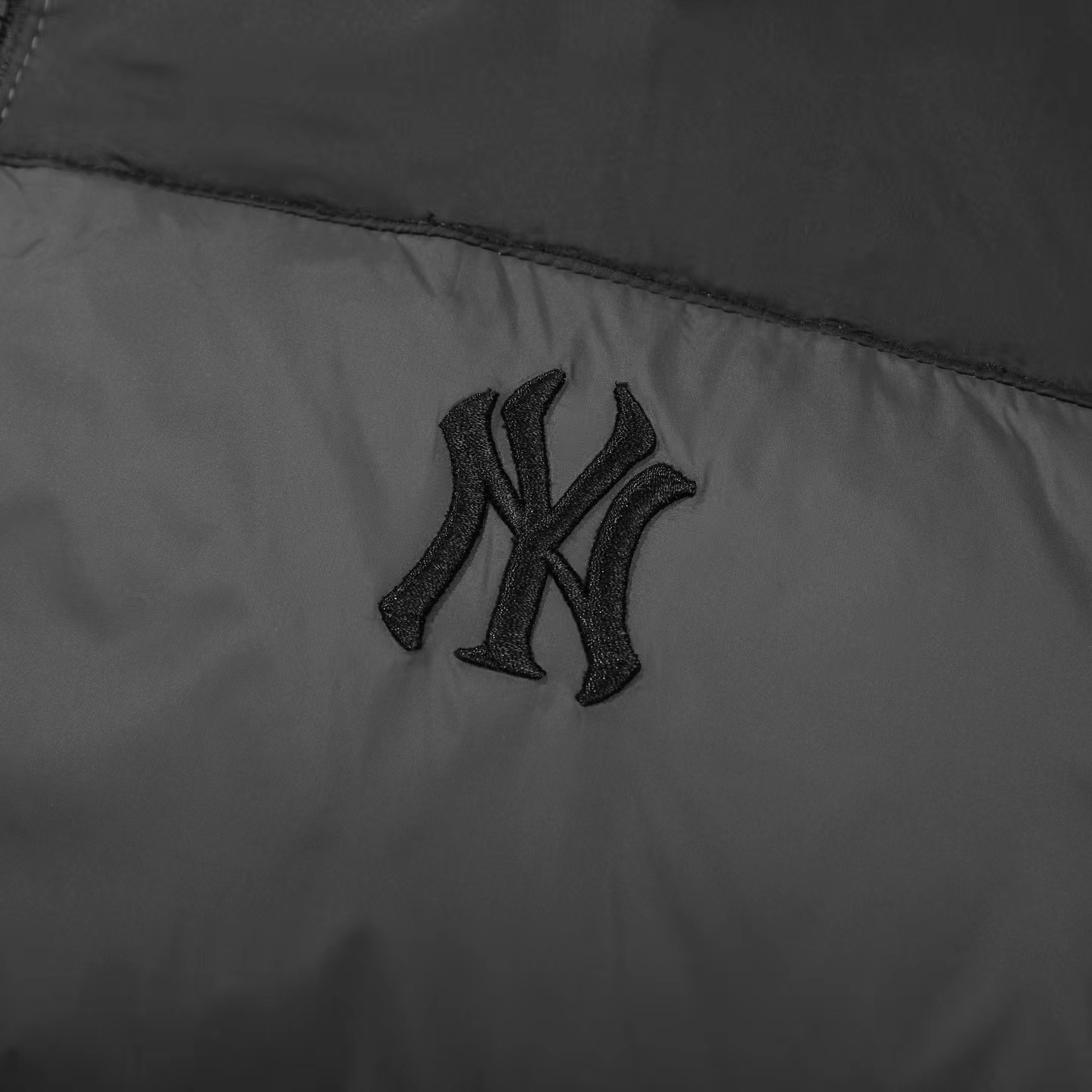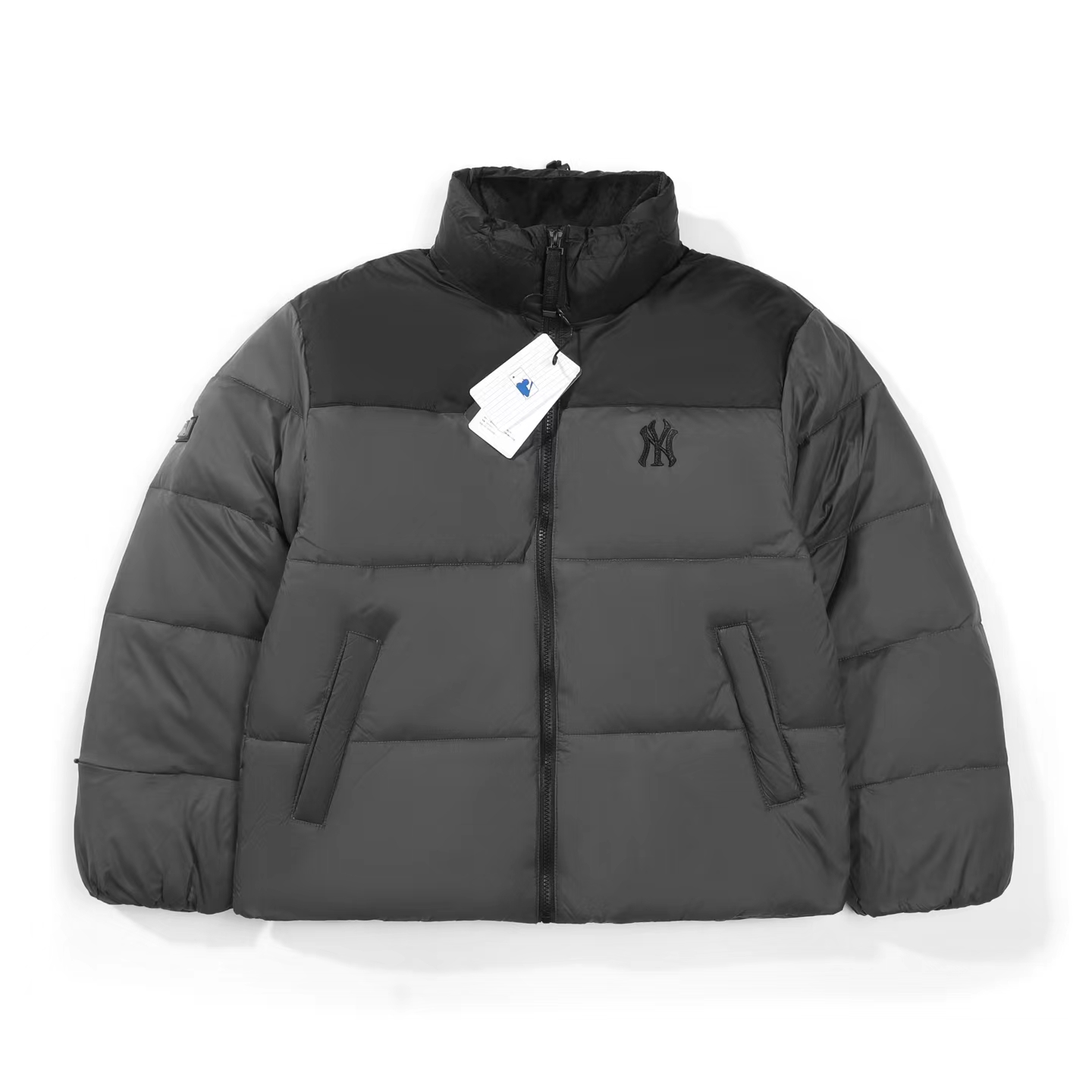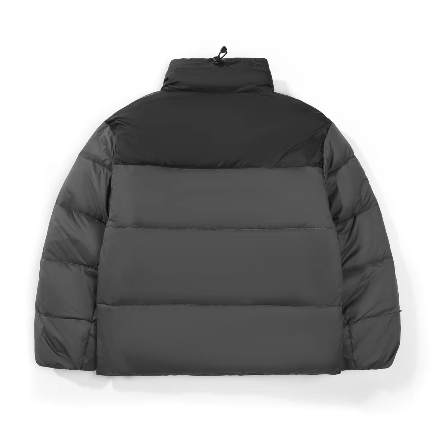 刺绣小logo图案宽松拉链长袖几何图案灰黑拼色立领羽绒服 男女同款 面料采用20D尼丝纺贴(烫金膜)三层涂层工艺让面料挺而细腻。