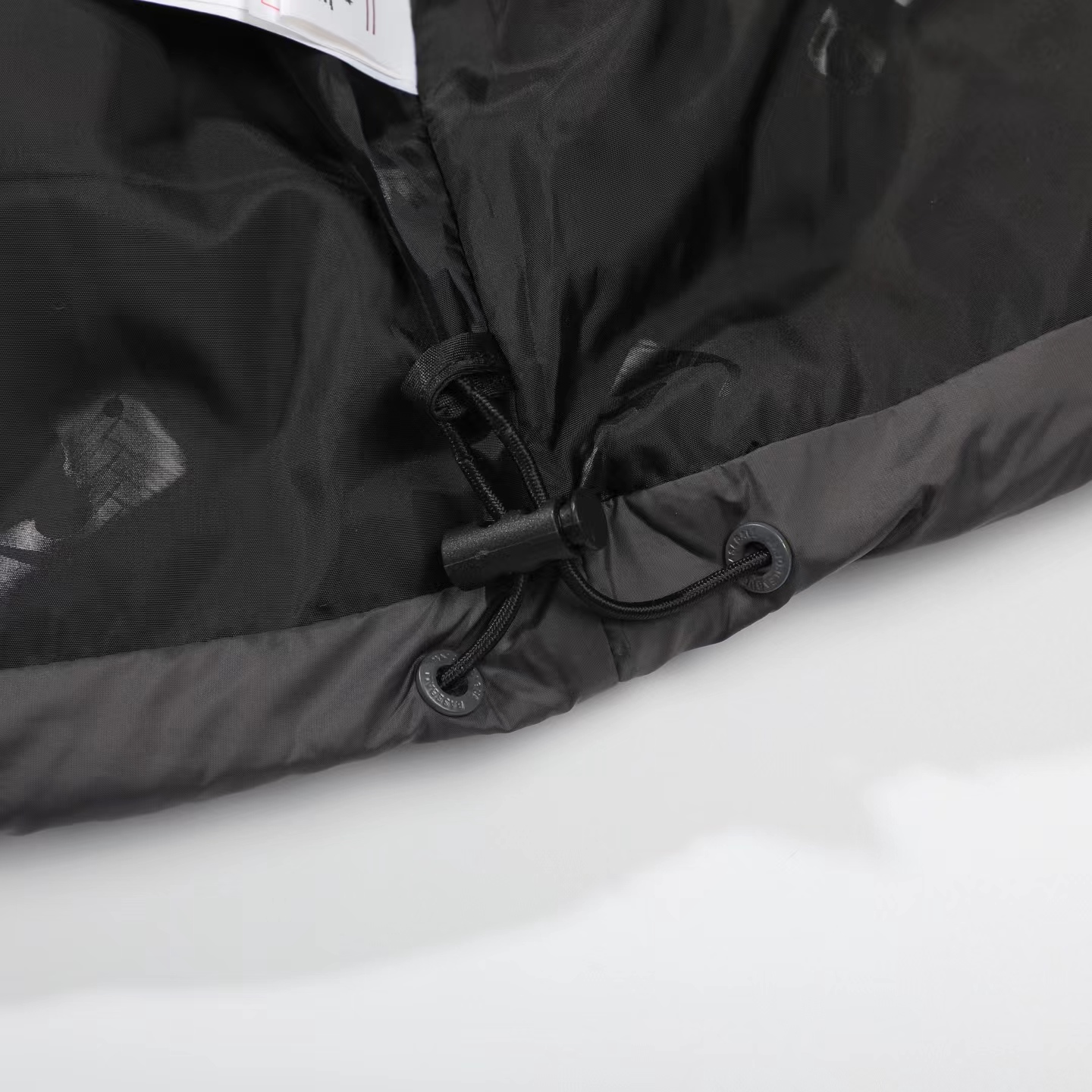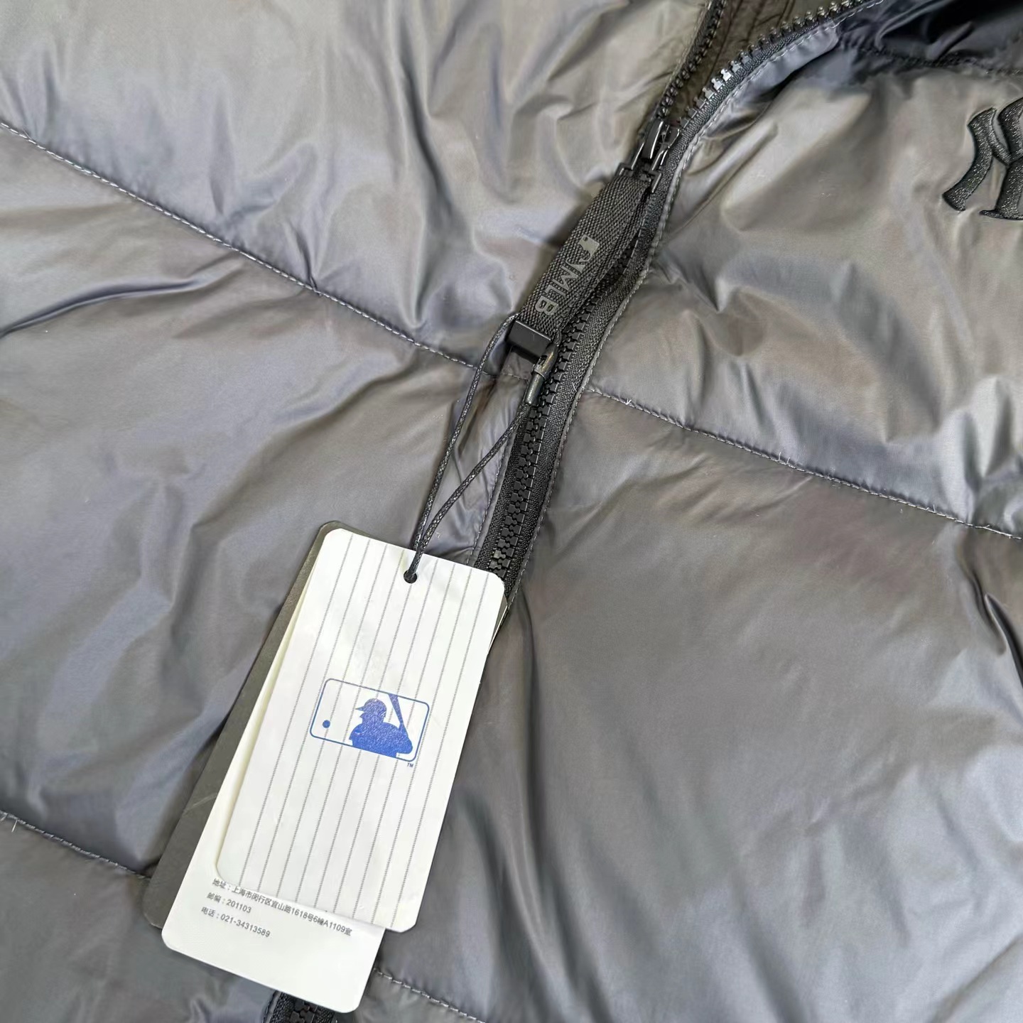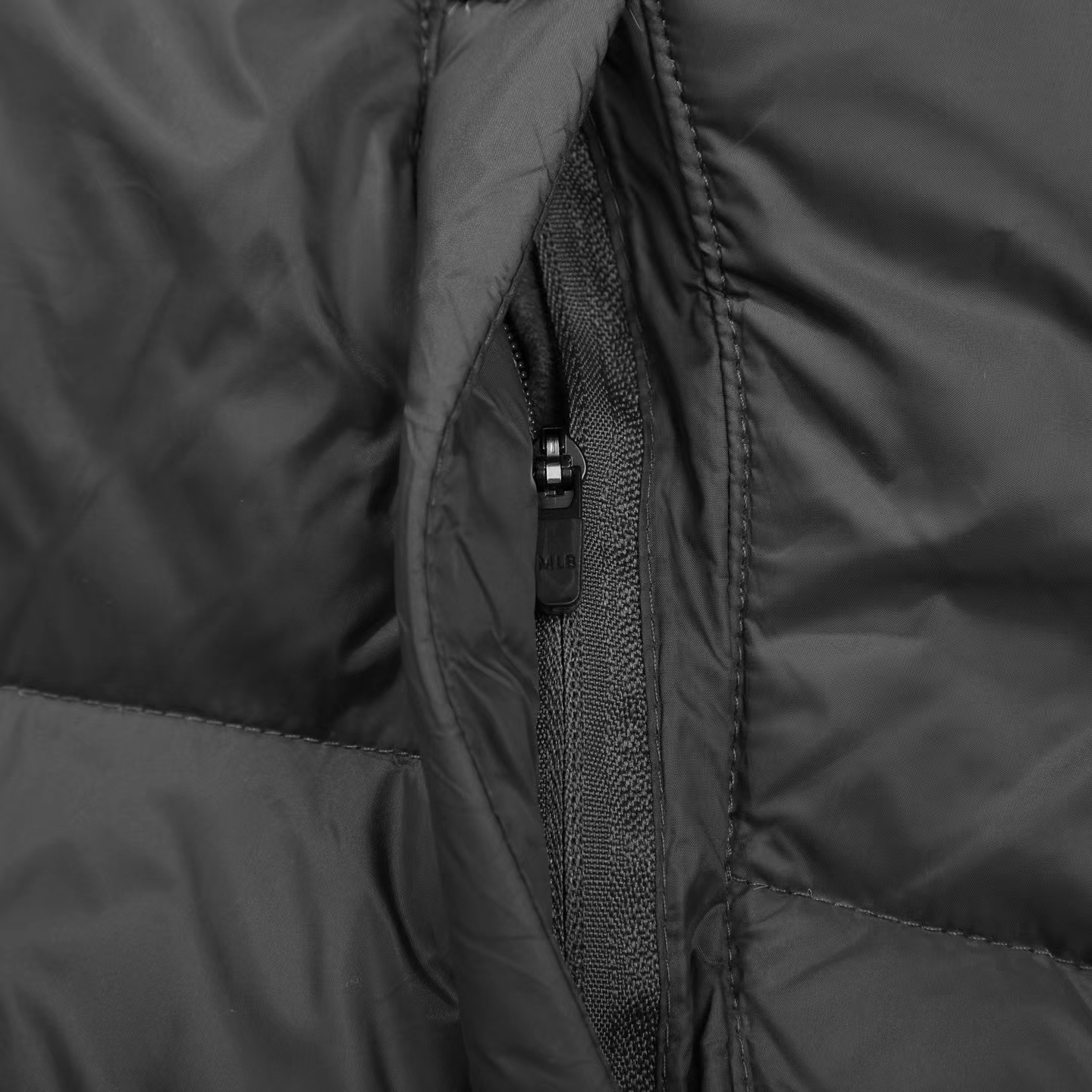 刺绣小logo图案宽松拉链长袖几何图案灰黑拼色立领羽绒服 男女同款 面料采用20D尼丝纺贴(烫金膜)三层涂层工艺让面料挺而细腻。