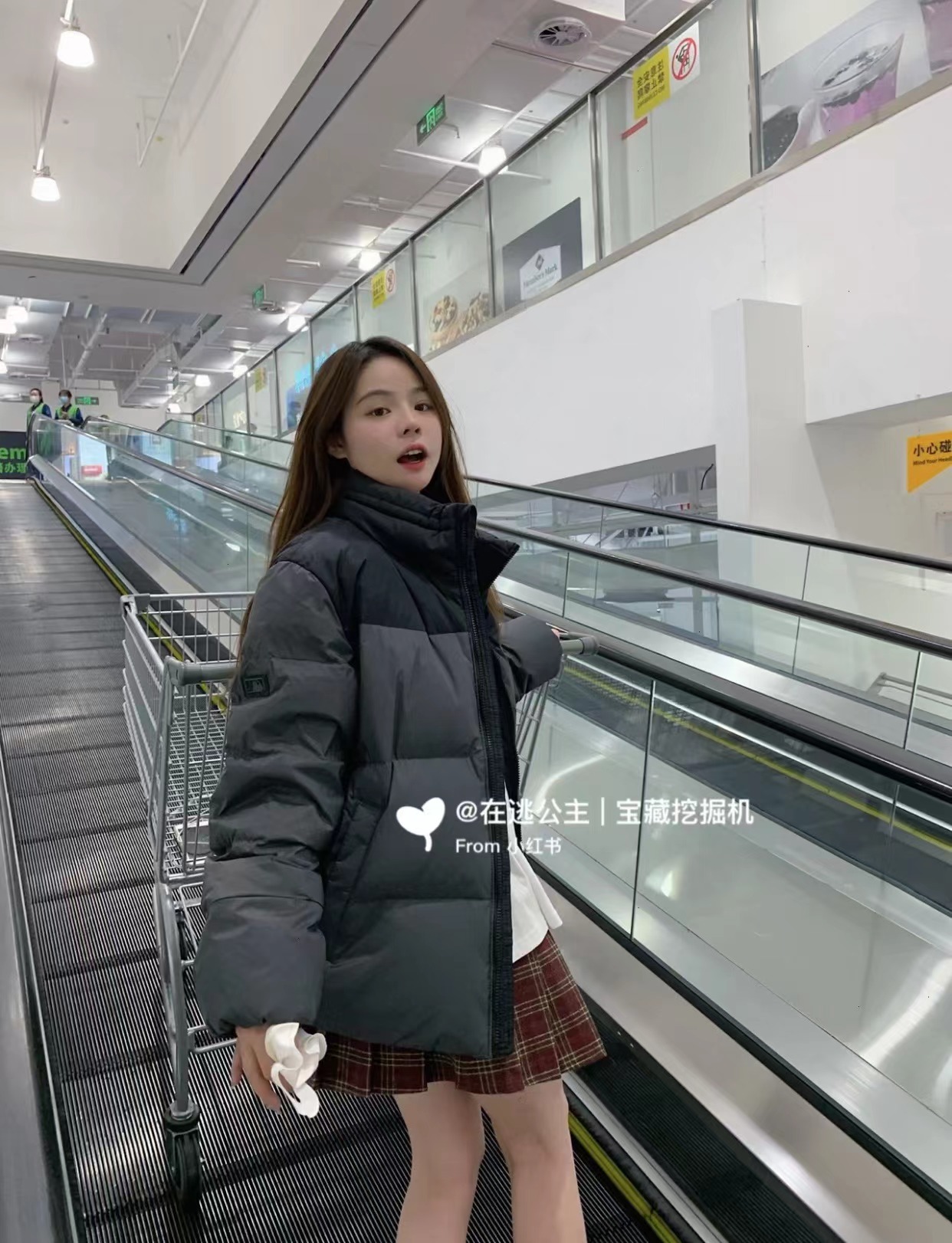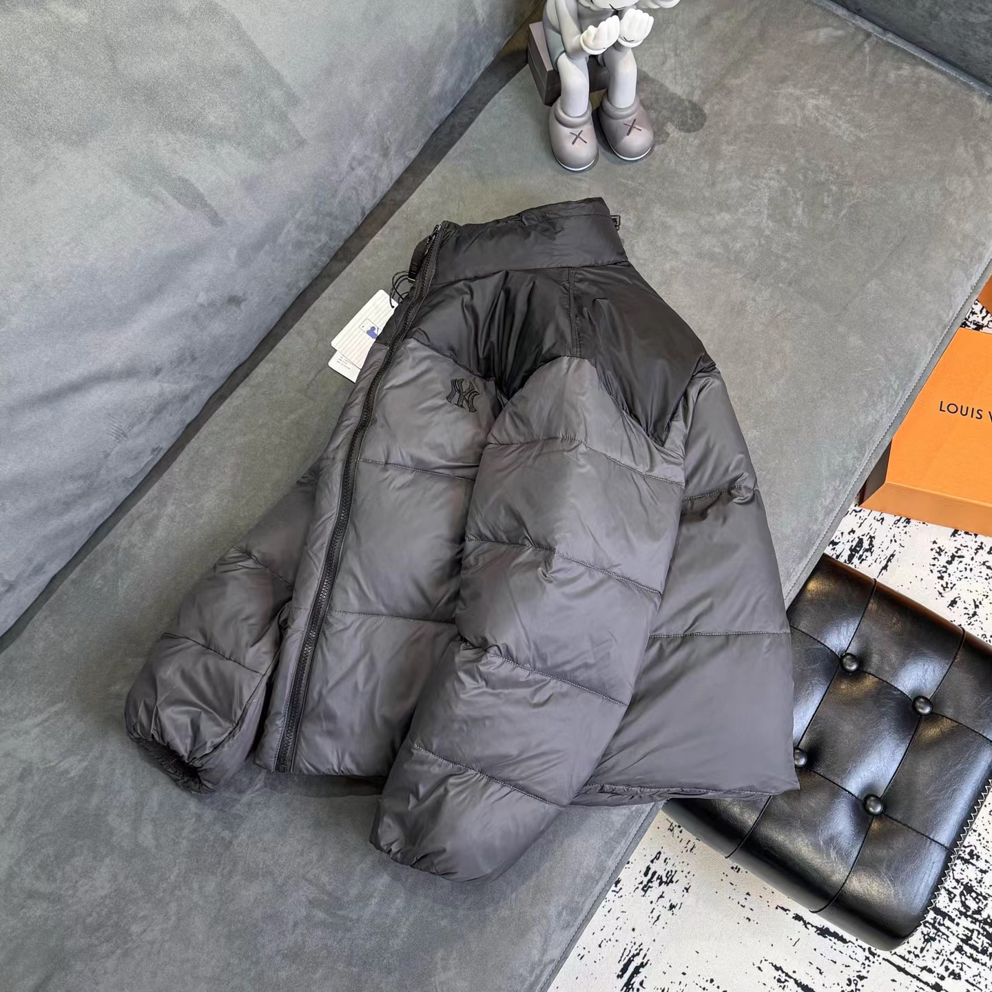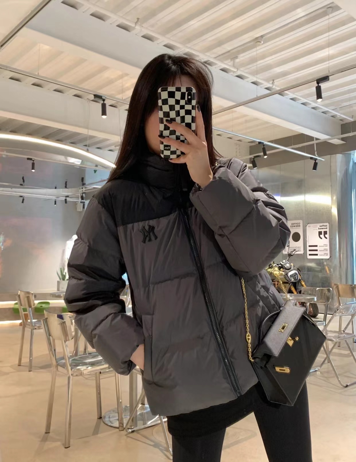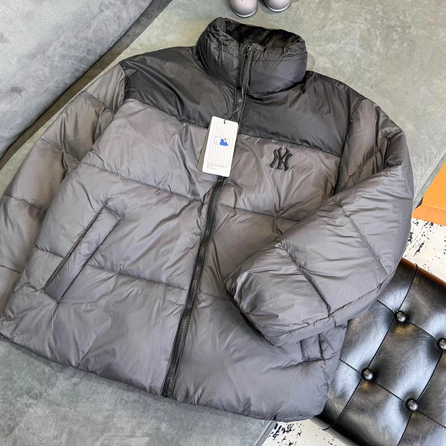 D120865刺绣小logo图案宽松拉链长袖几何图案灰黑拼色立领羽绒服