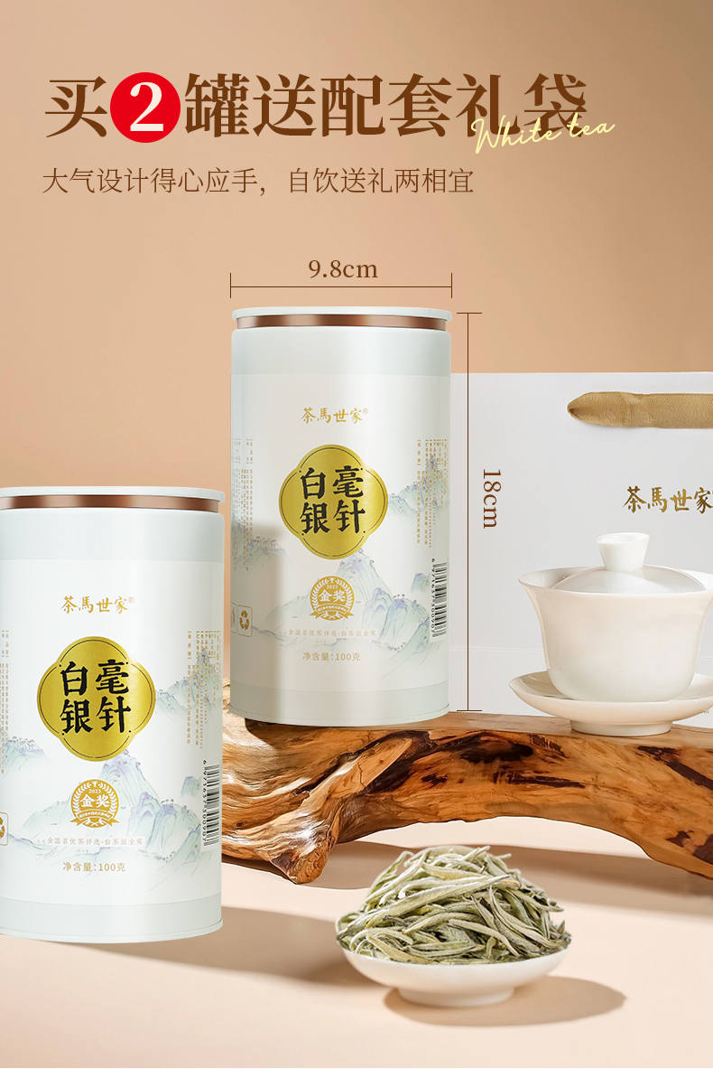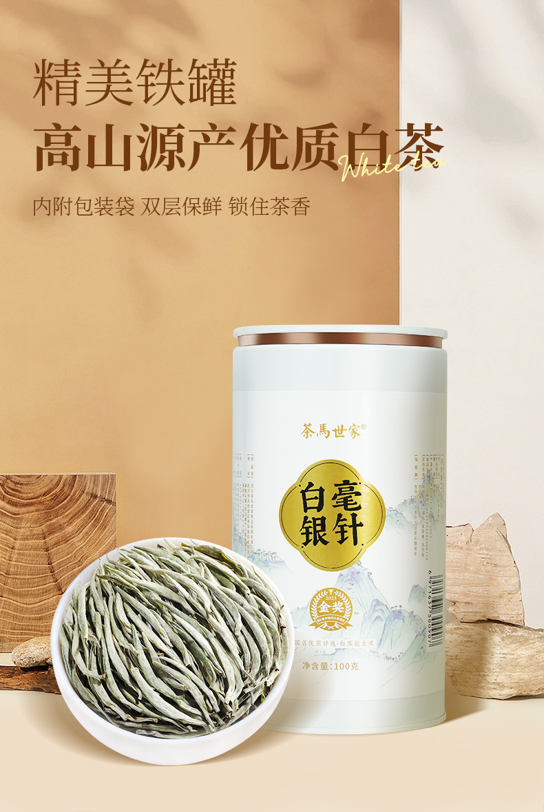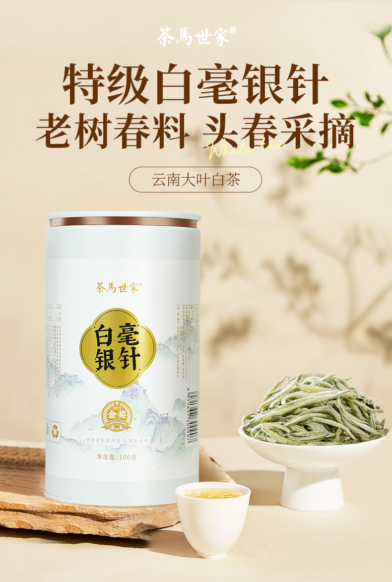 茶马世家白毫银针金奖 特级头采云南老树花果香白茶 罐装100克