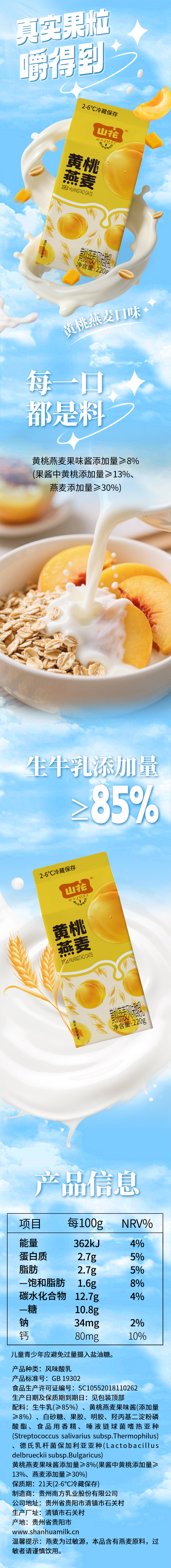 山花屋顶盒黄桃燕麦酸奶220g*6盒2-6℃冷藏