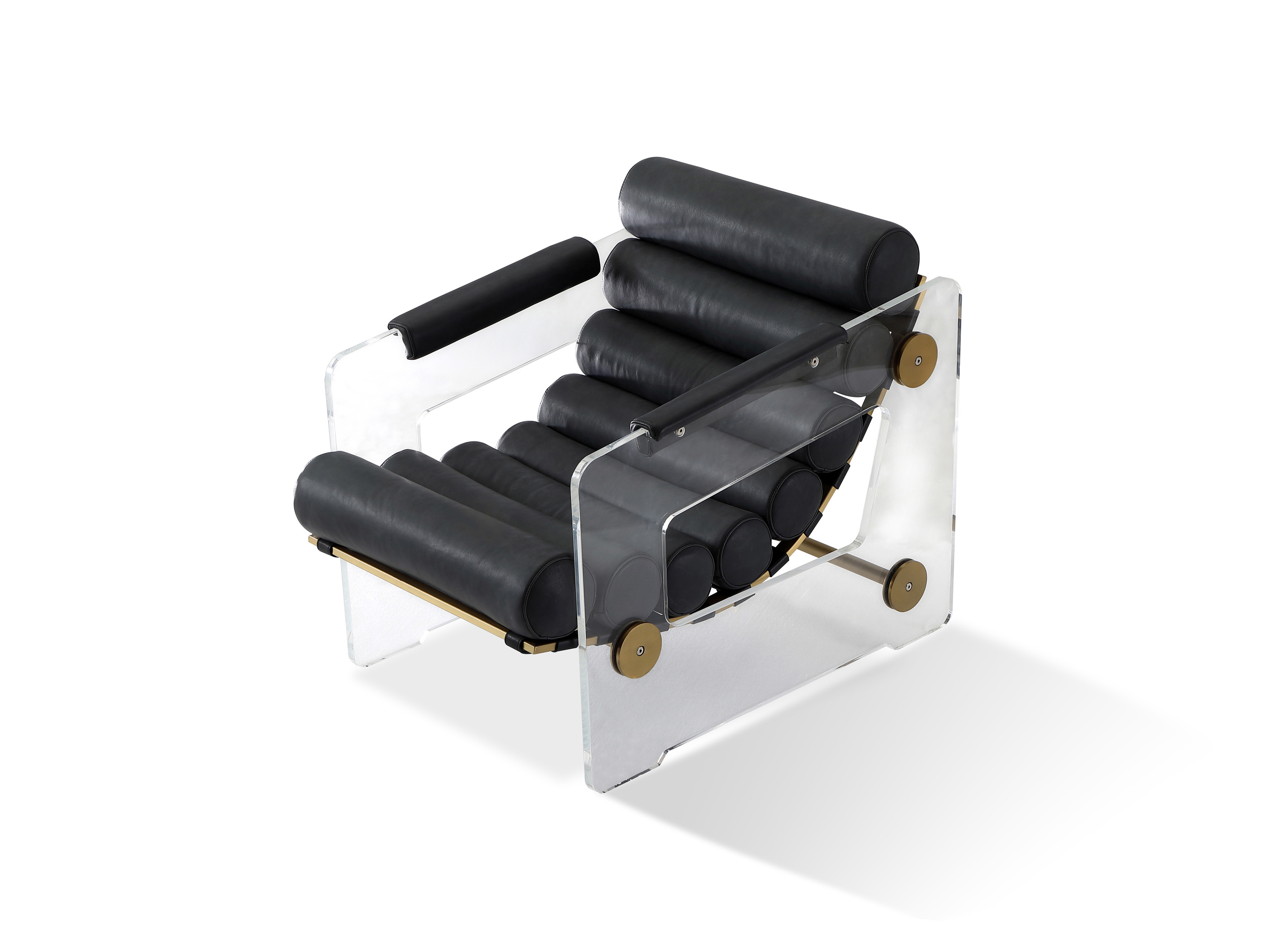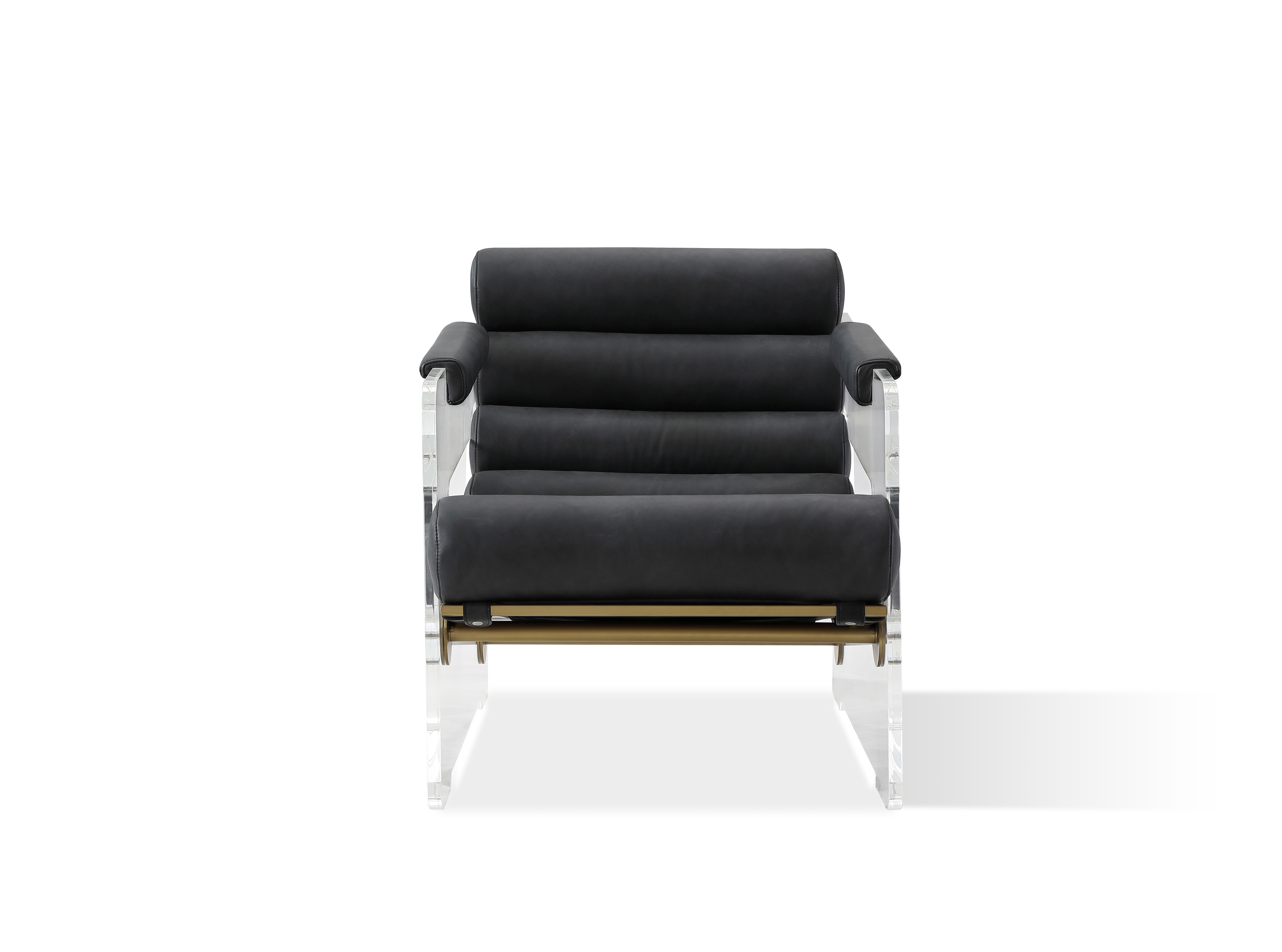 主材:牛皮圣淘沙黑色+香港金拉丝不锈钢拉丝架+后撑管+透明亚克力扶手