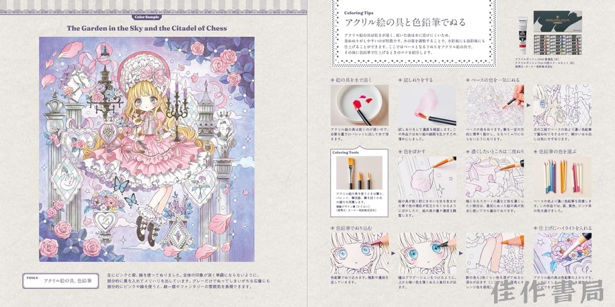 This is a coloring book by London Sirosaki, an illustrator who works on doll illustrations and costume designs. This book features 30 artworks drawn from the slightly dark and mysterious world of Gothic and Lolita girls, cute animals, Halloween and more. The coloring pages are perforated so you can tear them out. At the end of the book, in addition to five color sample pages so that those who are new to coloring can use them as a reference for color schemes and methods, tips for how to use colored pencils and acrylic paints are introduced.