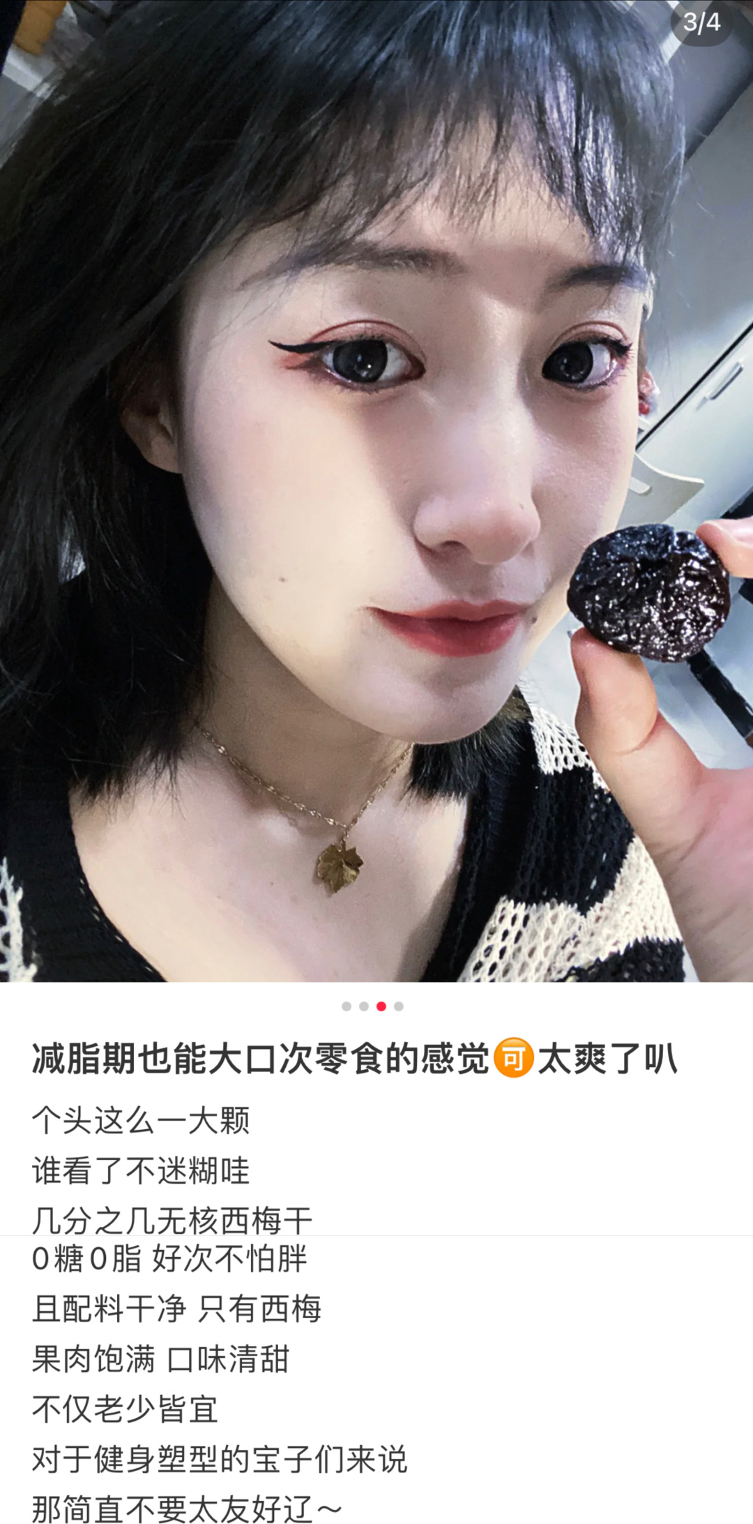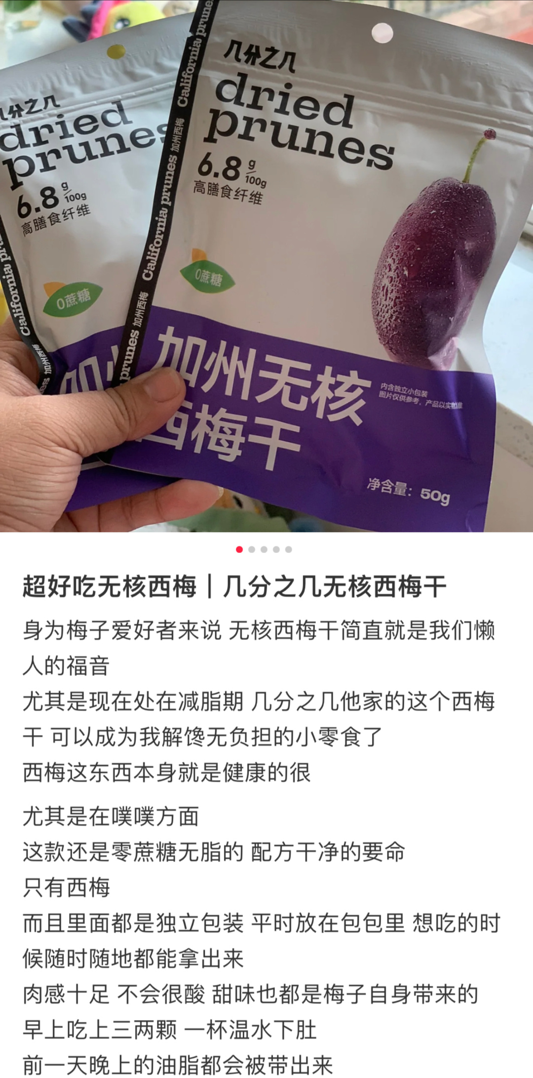 很多果干在制作时都会加入大量的糖和调味料,使得钠含量超标,并不适合给孩子吃。但几分之几西梅干,配料表真是干干净净,只有西梅,钠含量和脂肪都是0,膳食纤维6.8g/100g,算得上是健康小零食了,同时,因为0蔗糖,减脂期也完全没问题,还能帮助促进肠道蠕动,尤其适合便便困难户!