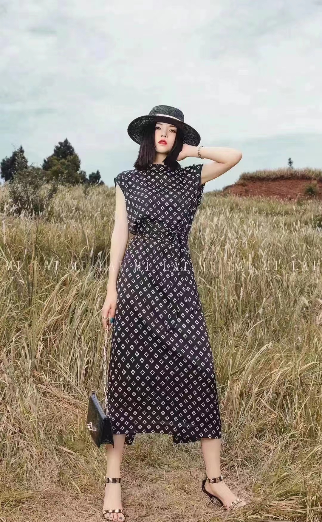 SZ2S86_漆黑色_连衣裙_夏季_领无袖几何印花系带收腰长款_高级女装_BERNIEELEN 伯妮斯茵