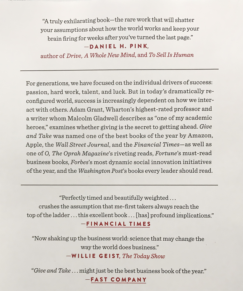 “Give and Takejust might be the most important book of this young century. As insightful and entertaining as Malcolm Gladwell at his best, this book has profound implications for how we manage our careers, deal with our friends and relatives, raise our children, and design our institutions. This gem is a joy to read, and it shatters the myth that greed is the path to success.” — Robert Sutton, author ofThe No Asshole Rule and Good Boss, Bad Boss
