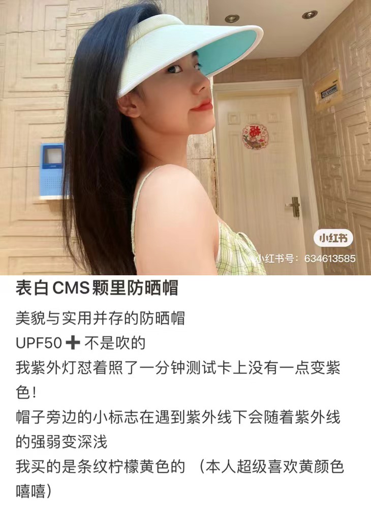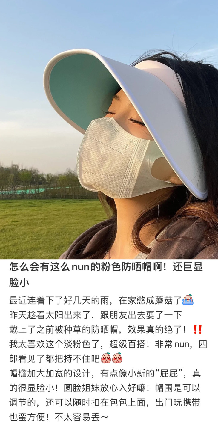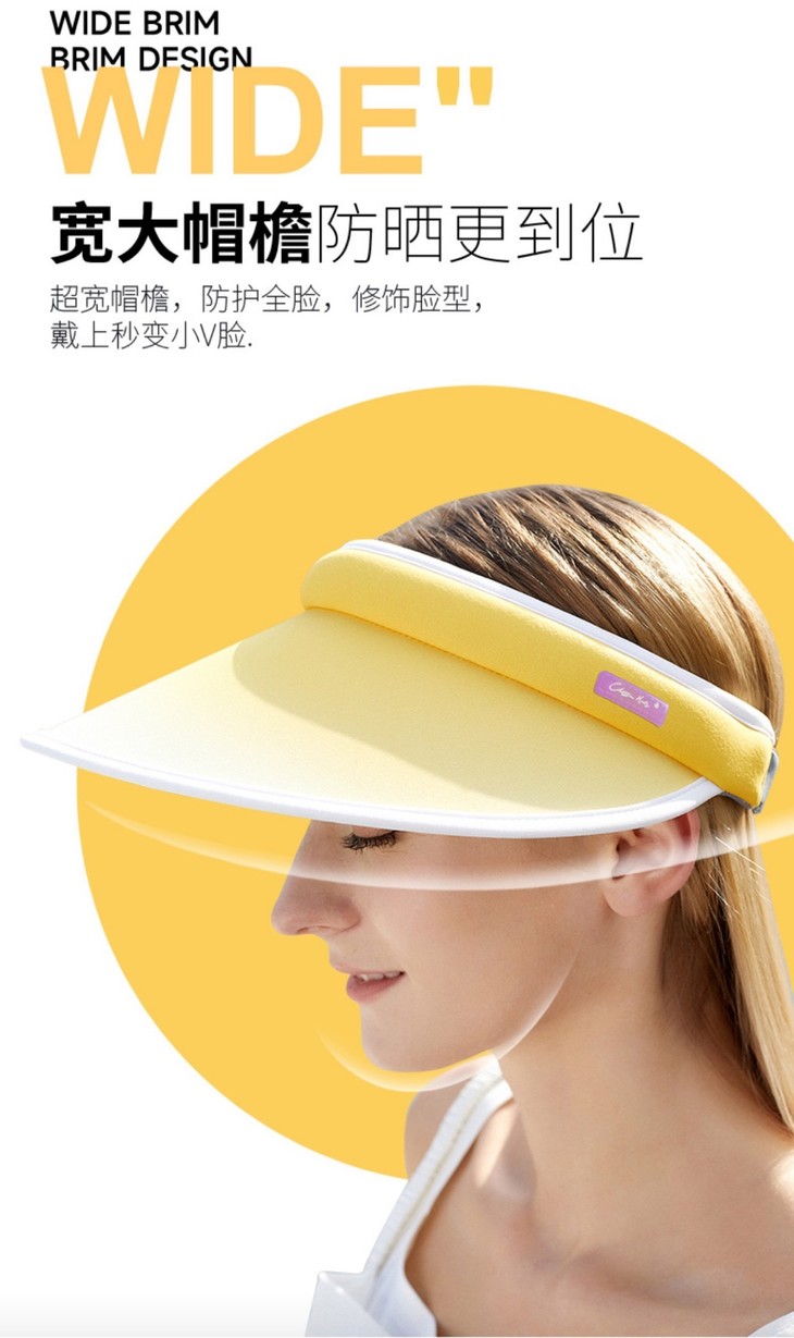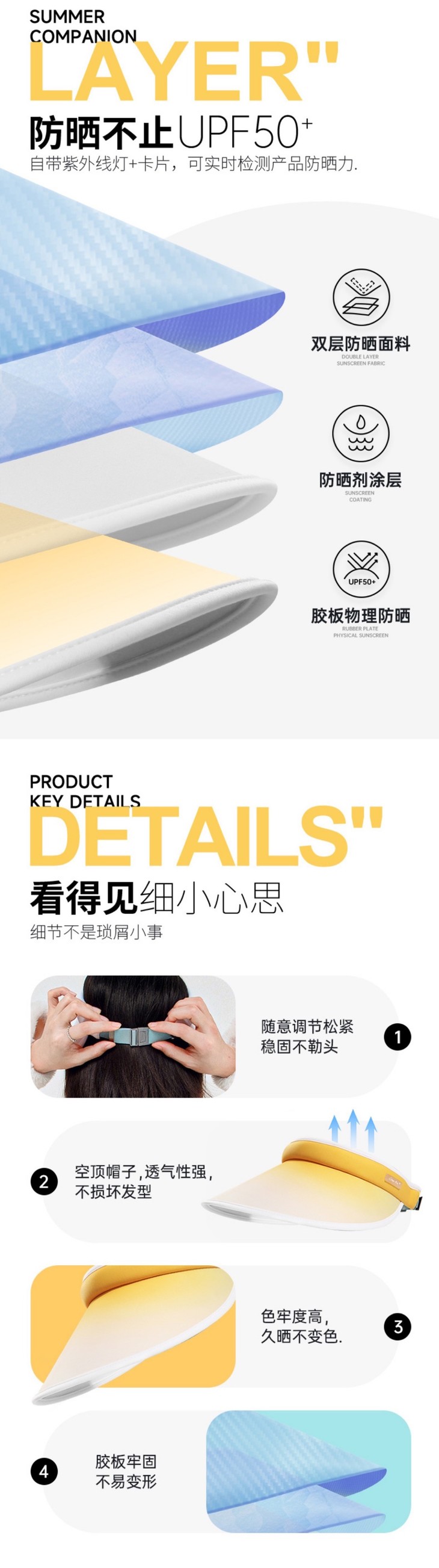 防晒帽的宽大的帽檐有32cm—37.5cm左右,既不遮挡视线同时又能很好的抵抗紫外线,还可以修饰脸型,帽子后面的插扣可随意调节松紧,戴取都方便,轻松做到了稳固又不勒头,还能适合各种头型,空顶的设计也不容易弄乱美美发型。防晒帽帽檐还有一个小小的胶章,它会根据紫外线的强度而改变颜色,紫外线强度越大,胶章颜色越深,拿在手上都能提醒自己要好好防晒咯。进入室内不想戴了,随手别在包上就可,很是方便。