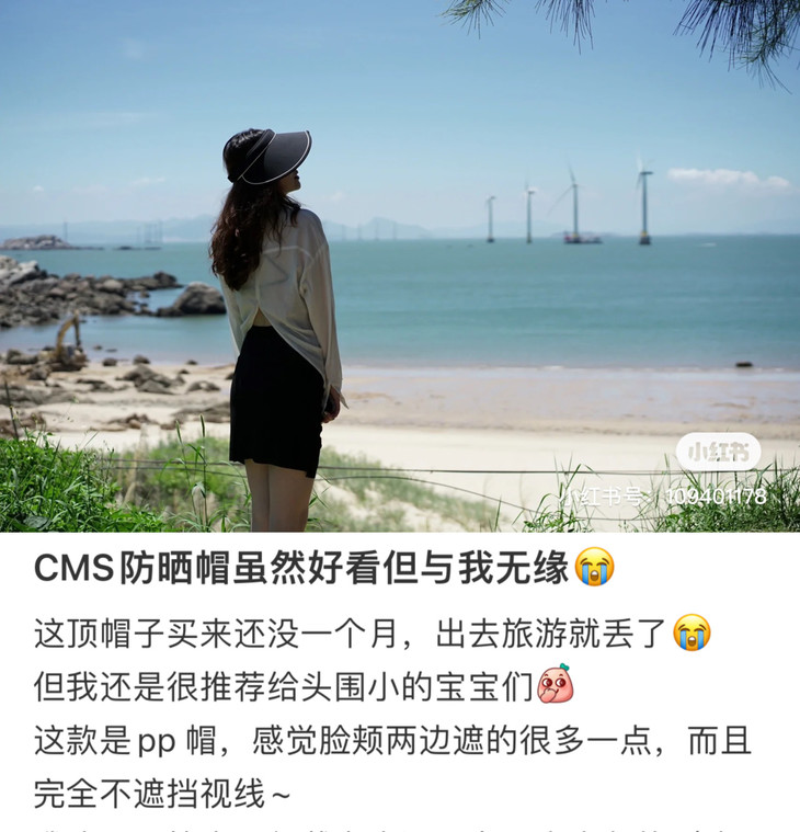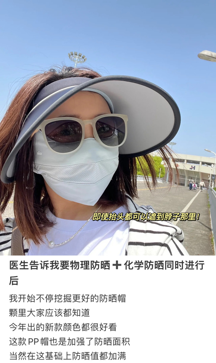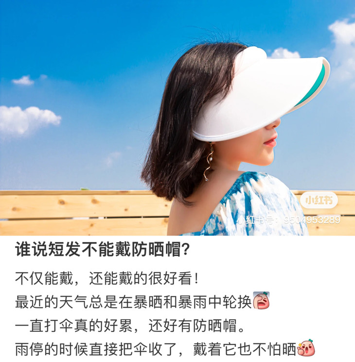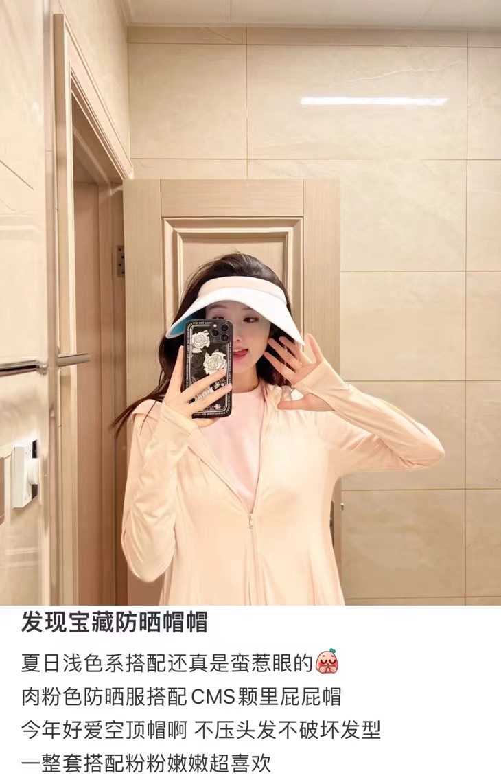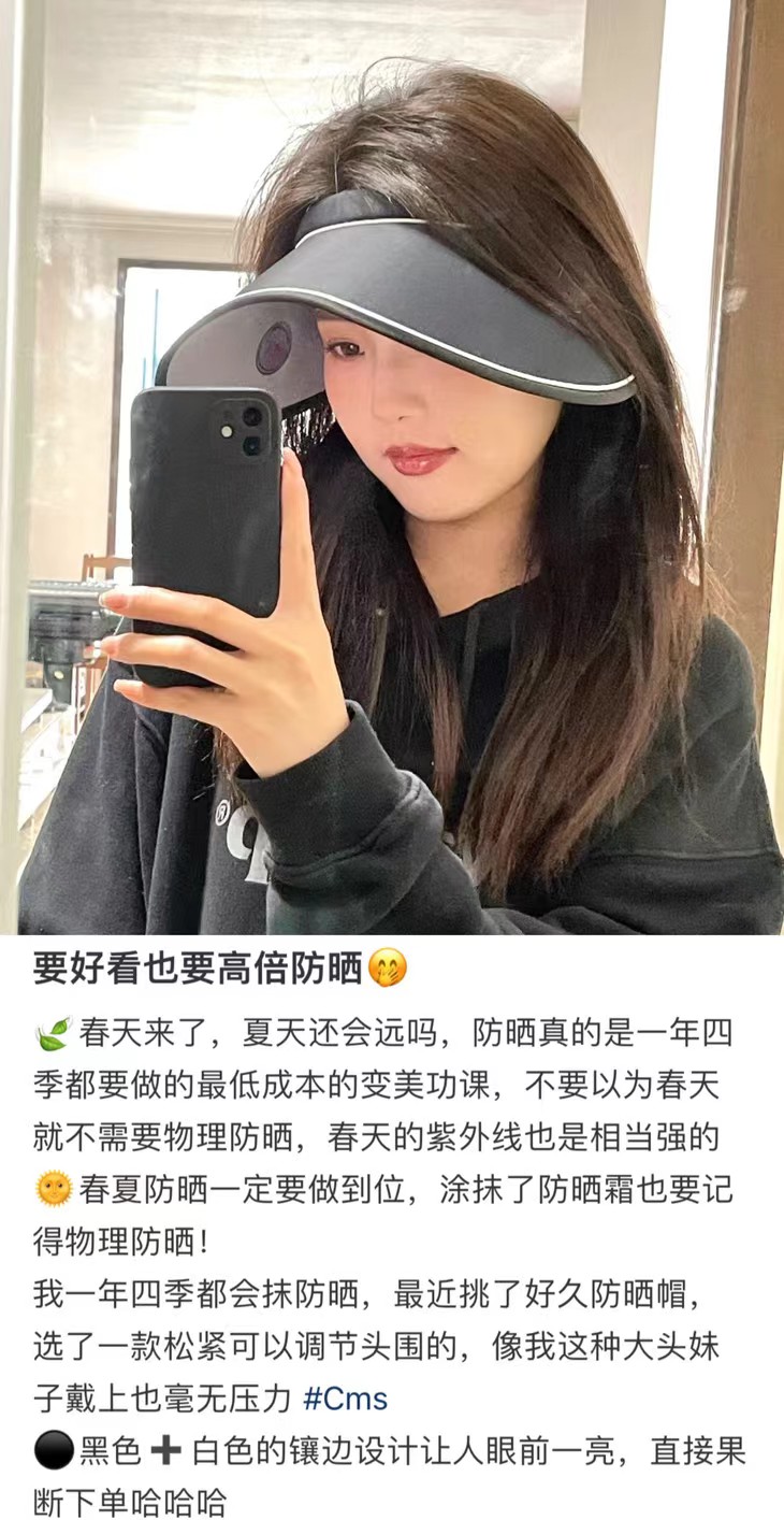 防晒帽的宽大的帽檐有32cm—37.5cm左右,既不遮挡视线同时又能很好的抵抗紫外线,还可以修饰脸型,帽子后面的插扣可随意调节松紧,戴取都方便,轻松做到了稳固又不勒头,还能适合各种头型,空顶的设计也不容易弄乱美美发型。防晒帽帽檐还有一个小小的胶章,它会根据紫外线的强度而改变颜色,紫外线强度越大,胶章颜色越深,拿在手上都能提醒自己要好好防晒咯。进入室内不想戴了,随手别在包上就可,很是方便。