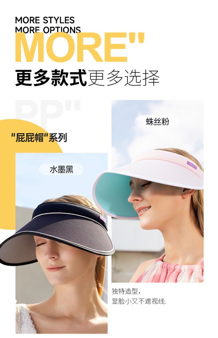 这次有三个系列,包括屁屁系列、云空系列和盐系条纹系列。屁屁系列的帽檐最宽,有水墨黑和珠丝粉2色可选;云空系列则有四色,其中长春花蓝、芝士黄为渐变色,麦秆黄、暗夜黑为纯色,非常亮眼;盐系条纹则有莲雾粉和柠檬黄,亮眼的色彩搭配上纵向条纹,很有质感,大家可以根据自己日常的服饰来挑选搭配哦!