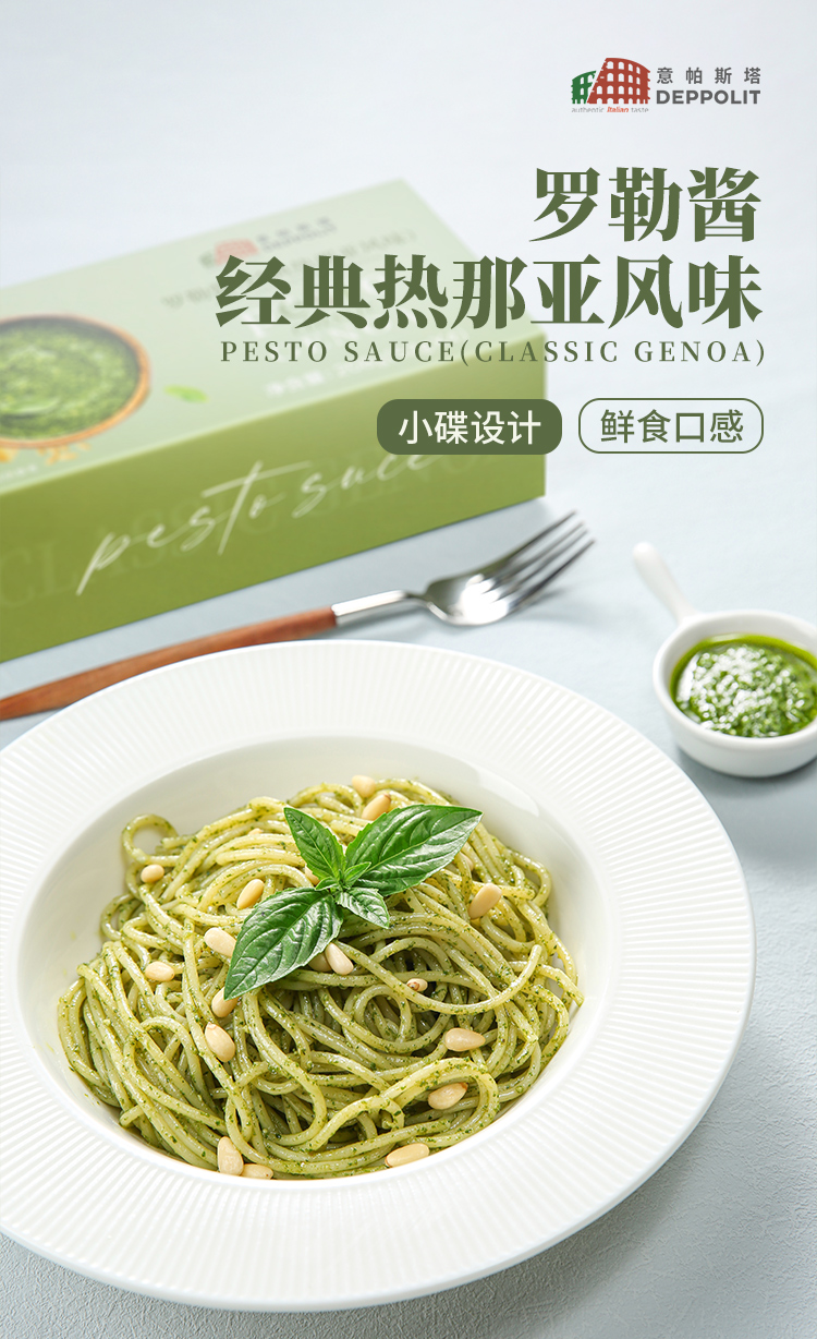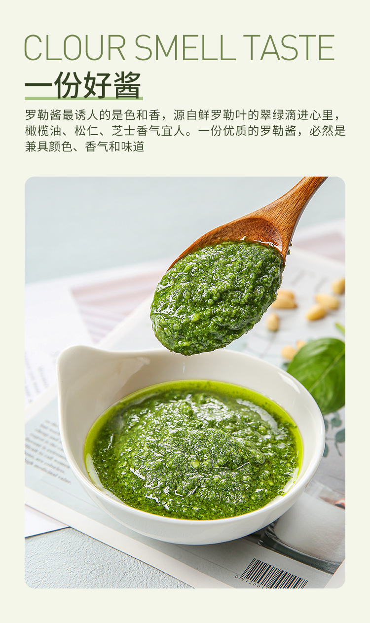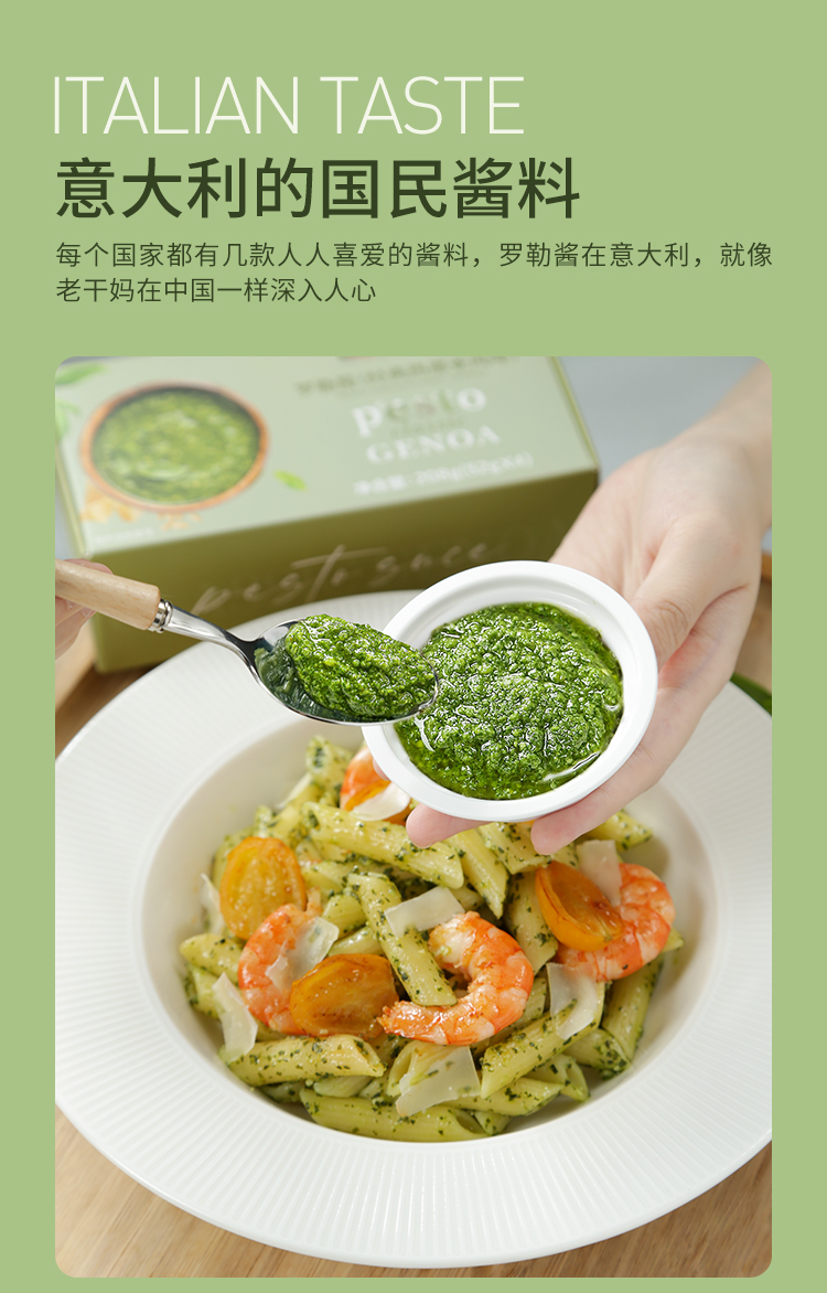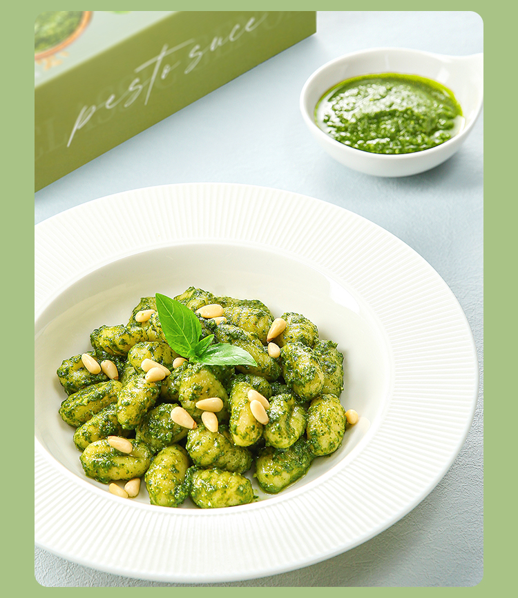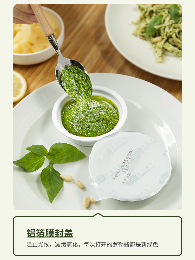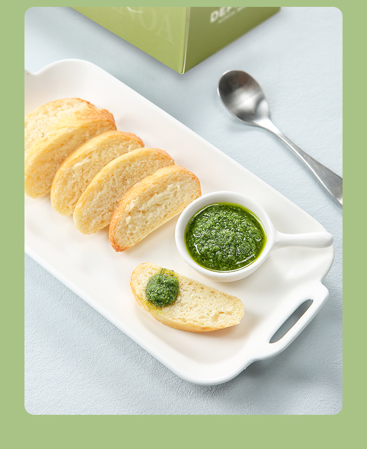意帕斯塔罗勒酱,香气四溢,口感鲜美,相比市面上其他罗勒酱,用料更加考究。不像普通酱使用的葵花籽油,而是甄选特级初榨橄榄油让酱料更加香浓的同时也更为健康;再加上格拉纳帕达诺奶酪和佩科里诺两种奶酪的加入,也使得口感更加丰富醇厚;更是搭配足量松仁,增加坚果口感,香气更甚!无添加剂,无色素,创新冷冻工艺,保持了酱酱嫩绿的颜色,为我们带来地道风味,实现罗勒酱自由!