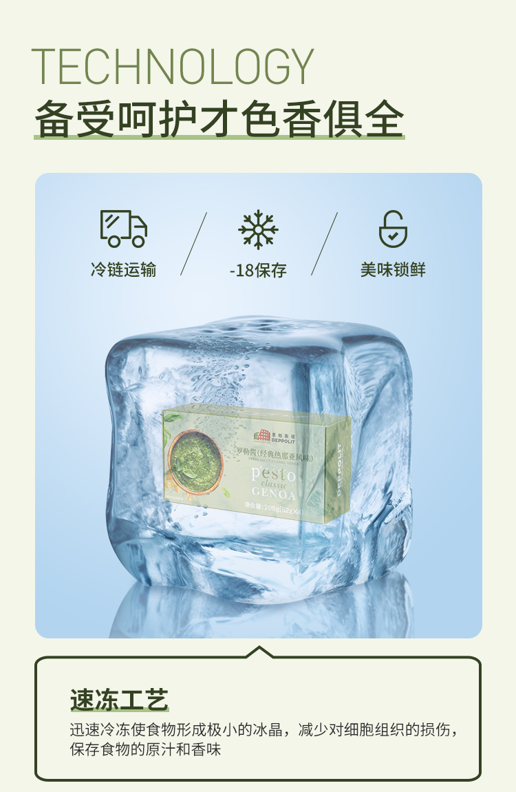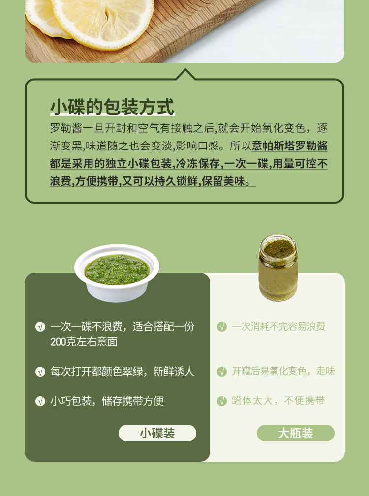 罗勒酱是冷冻保鲜的小包装设计,52克一份,做一份意面,刚刚好,不用担心浪费,吃之前从冷冻室拿出来,放温水里泡个十分钟,稍稍搅拌就好,每次吃到都像新鲜做的一样!而且颜色巨美,鲜鲜嫩嫩的绿色,让人食指大动,随便搭都极好吃,罗勒香松子香与双重芝士香,一口一个大满足!