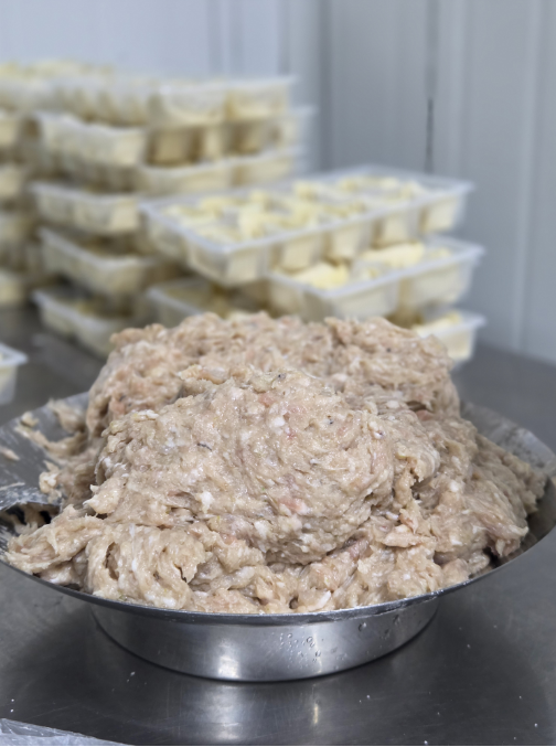 纯刀鱼肉会没有黏性,所以配以少量五花肉糜再加上虾仁提鲜。