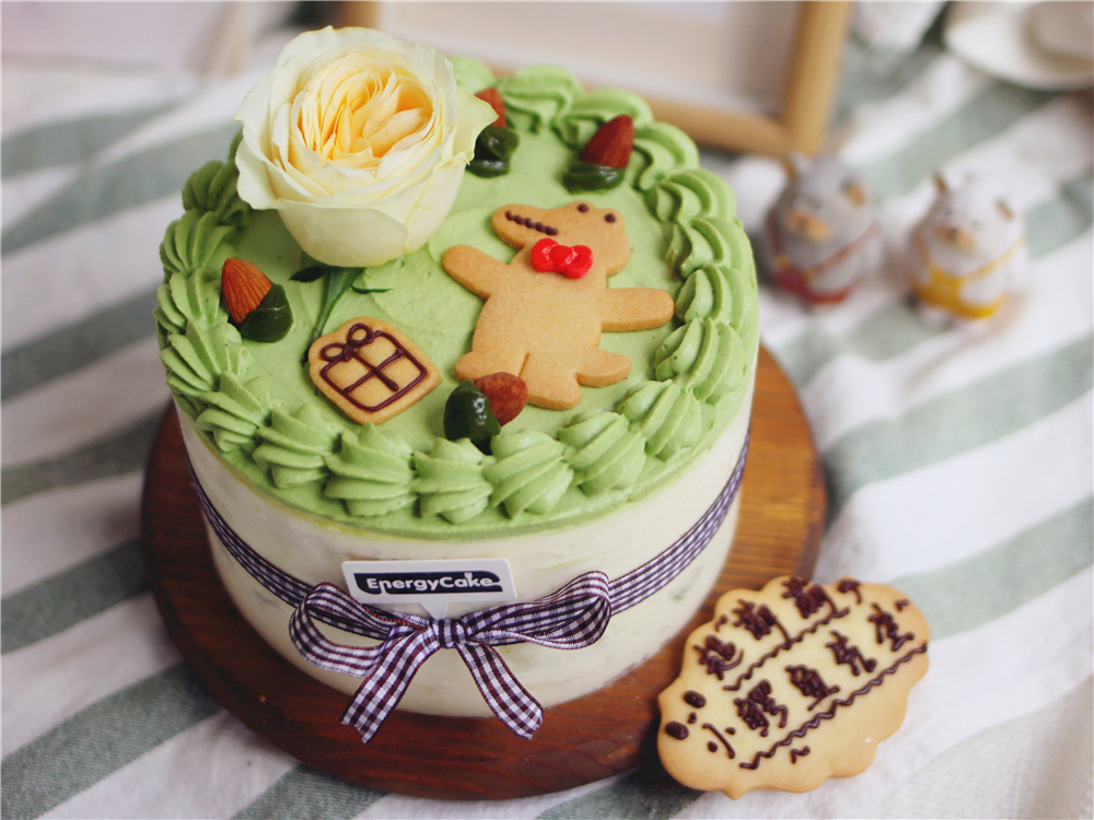 表层是抹茶奶油、手作饼干、奶油杯玫瑰