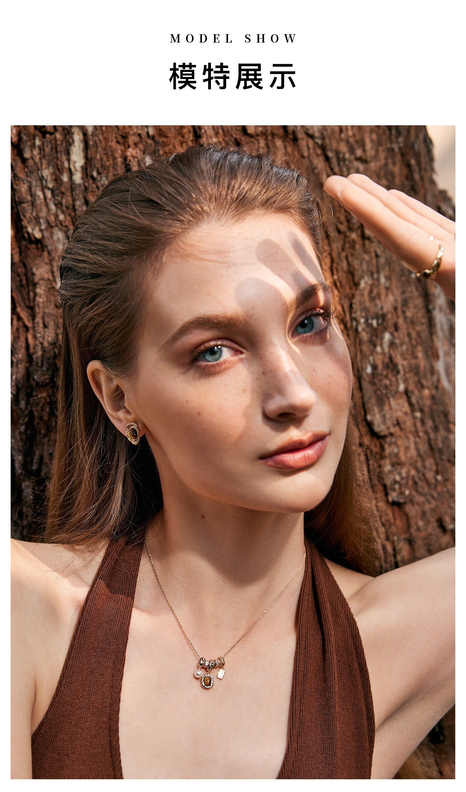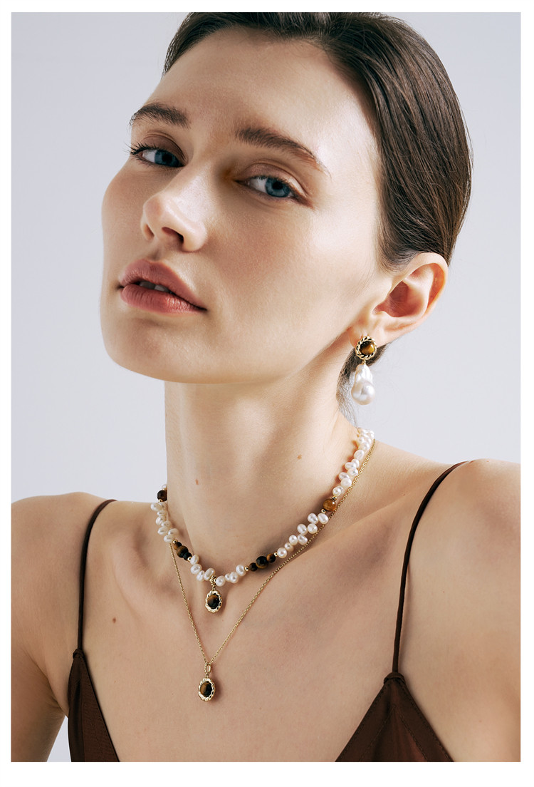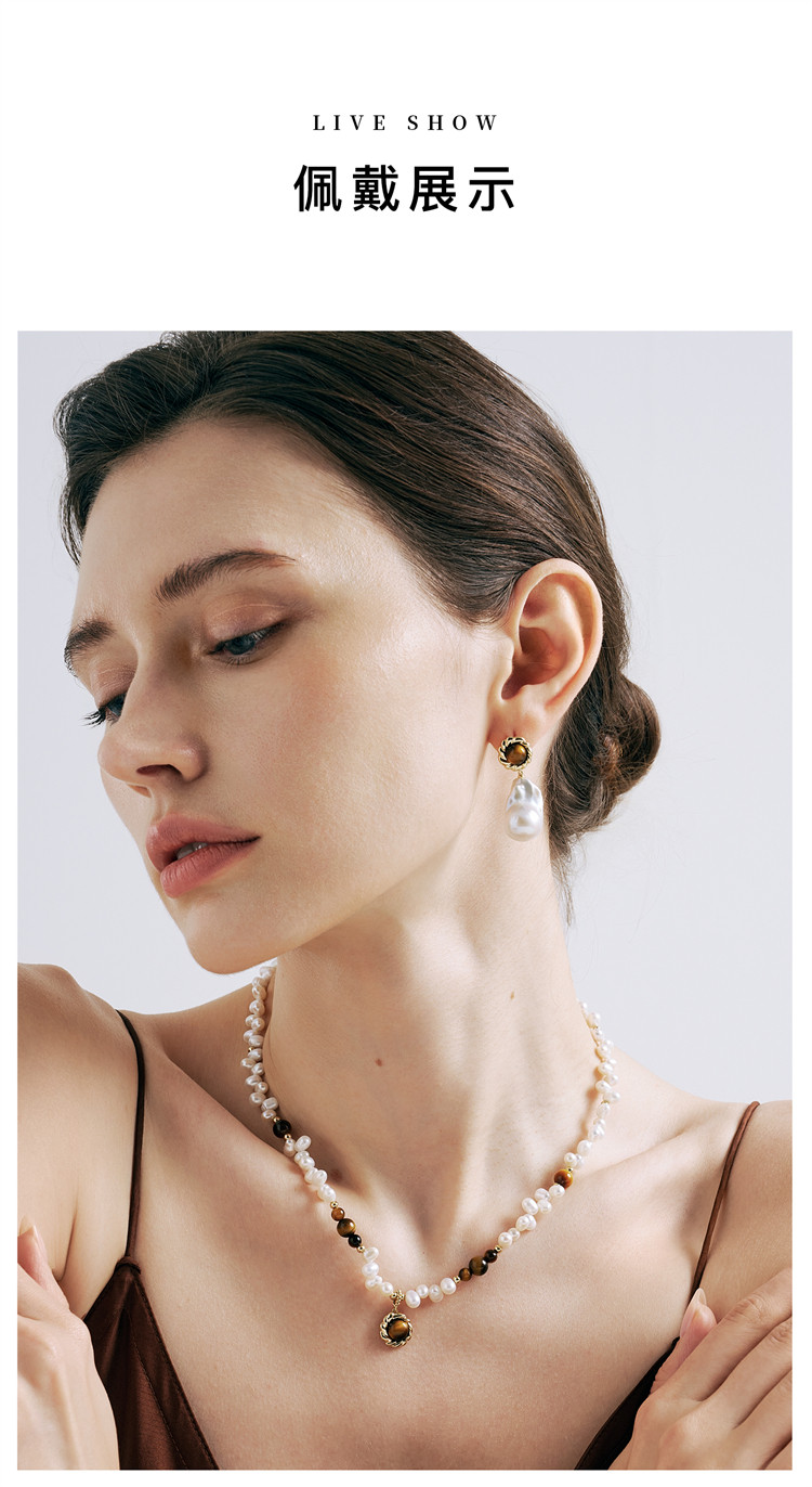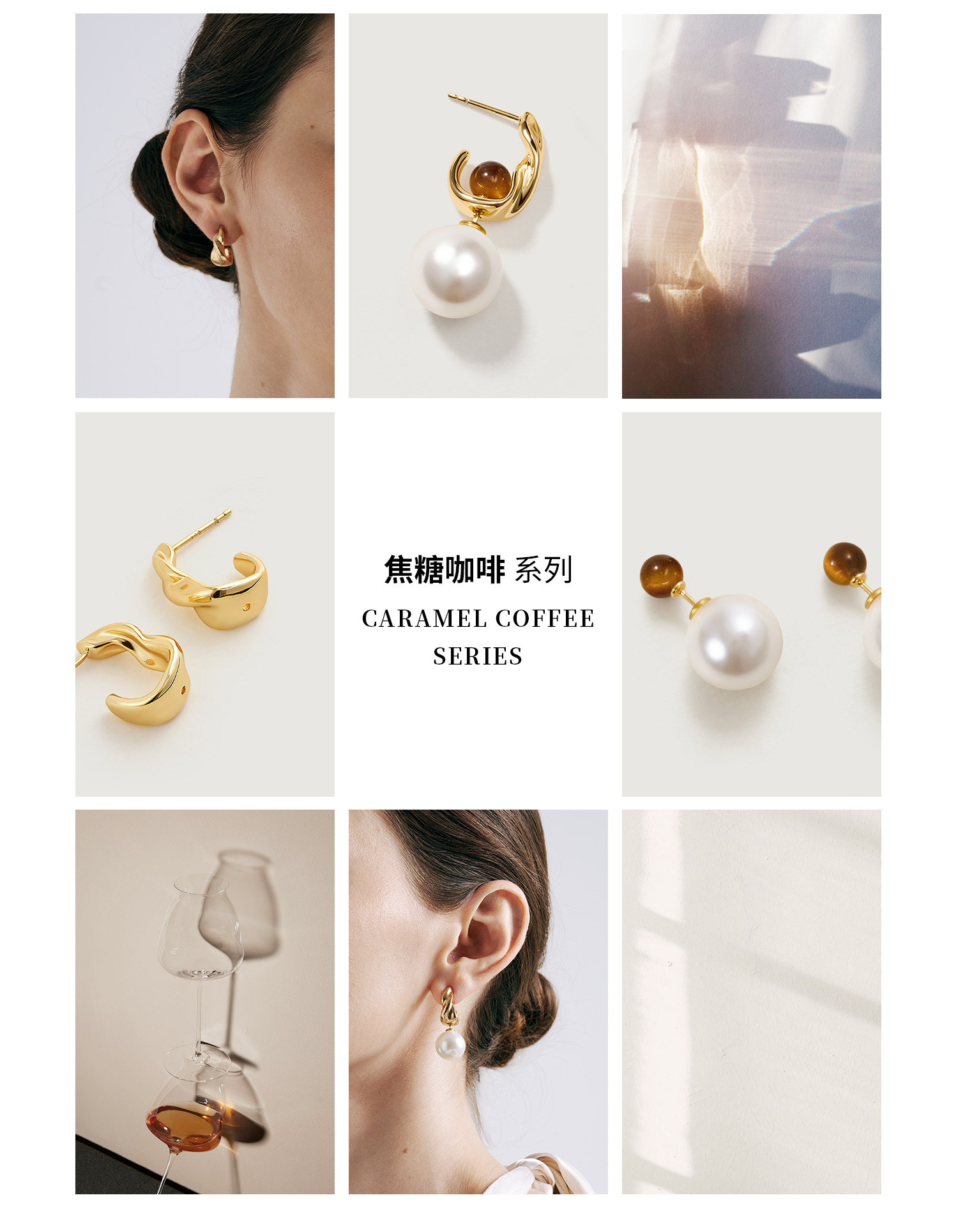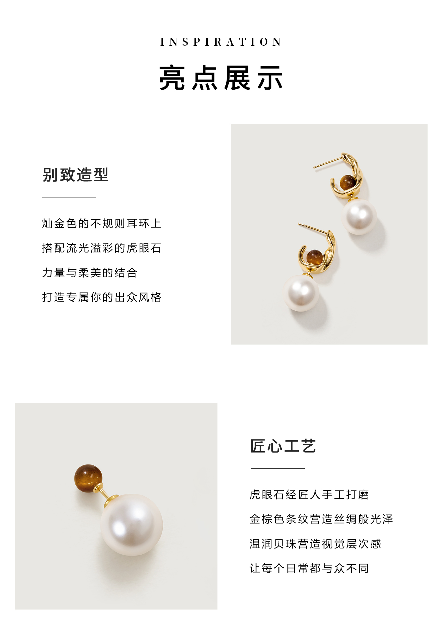 “明星同款 圣诞节礼物”安铂洛利 焦糖咖啡系列 蛇形虎眼石开口戒指/虎眼石贝珠耳钉/珍珠吊坠项链