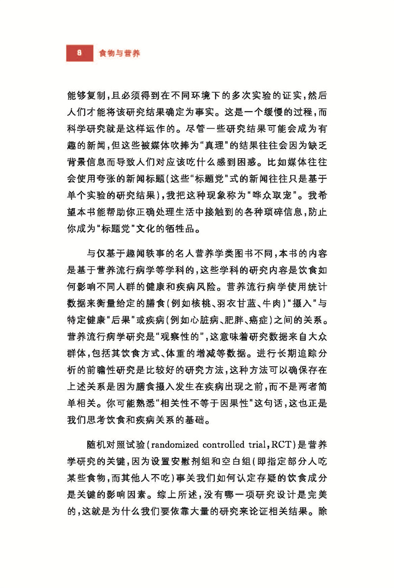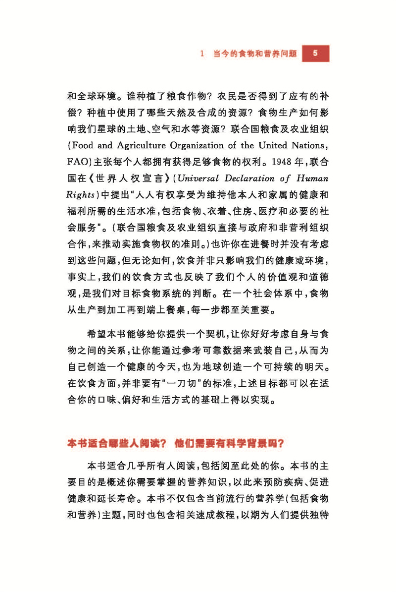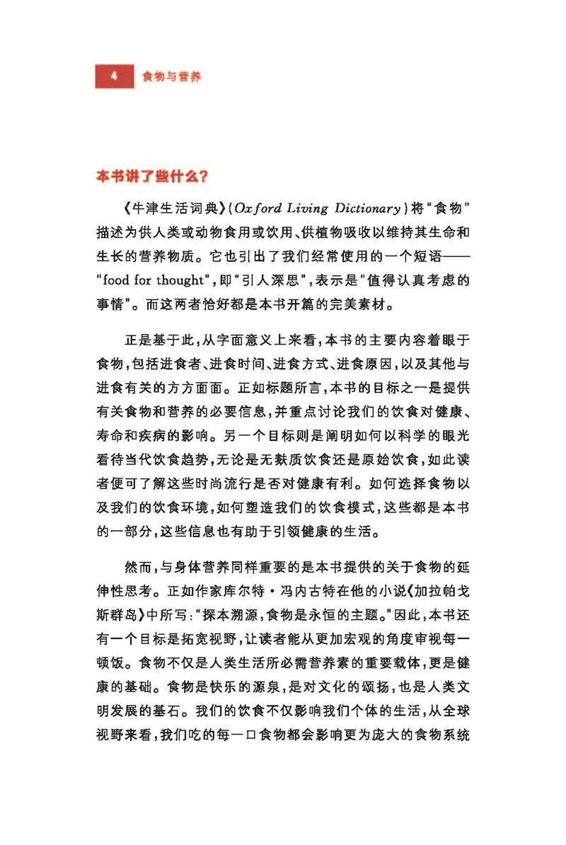 ②前沿性。在物质大丰富的今天,食物获取变得容易,如何吃得健康、保持营养均衡成为大众关心的议题。网络上关于关于健康饮食的信息真假难辨,本书系统、全面、客观地梳理了与食物和营养相关的问题,回应大众关切的热点议题,值得一读。