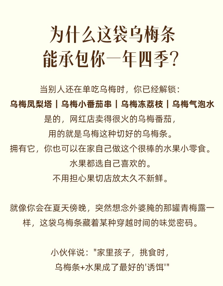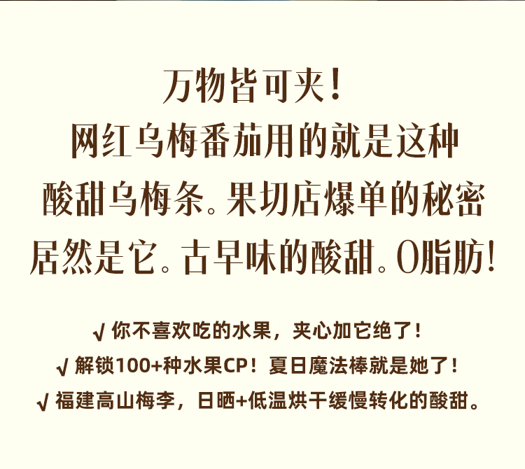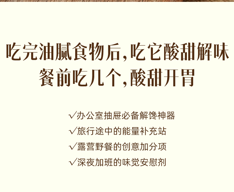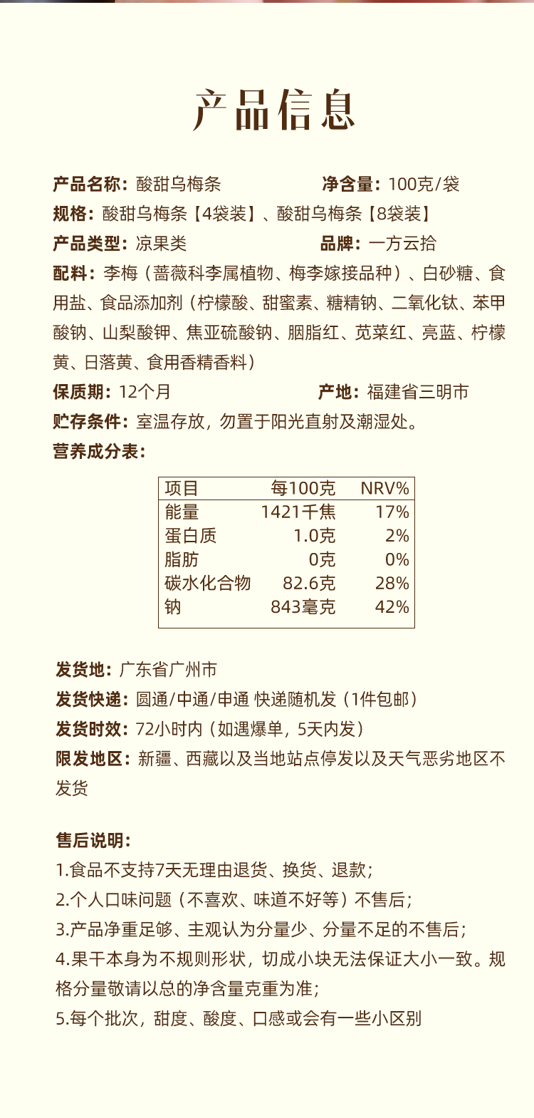 【品名】一方云拾酸甜乌梅条 【规格】 100g/袋(每份35-40条左右,净重为准,个数仅作为参考,不作为售后标准) 【保质期】12个月 【储存方法】请置于阴凉干燥处,避免阳光直射 【产地】福建 【发货地】广东 【发货快递】圆通,中通,申通 【不发货区域】新疆,西藏,港澳台地区不发 【发货时效】48小时,节假日顺延 |