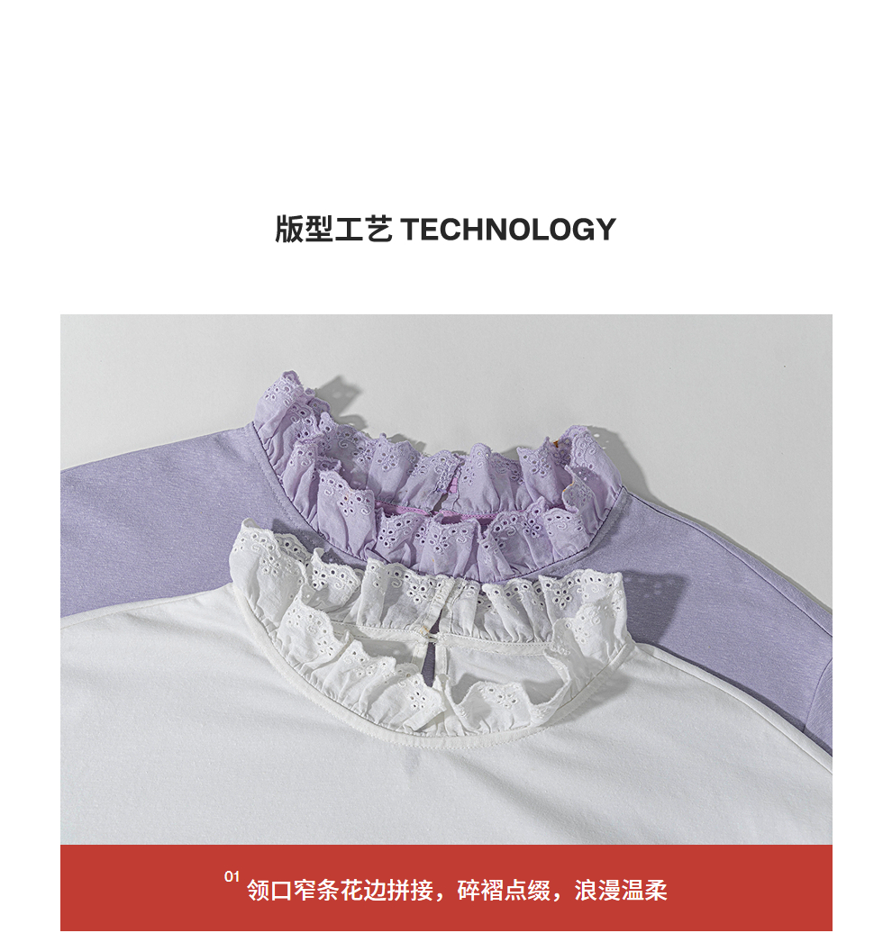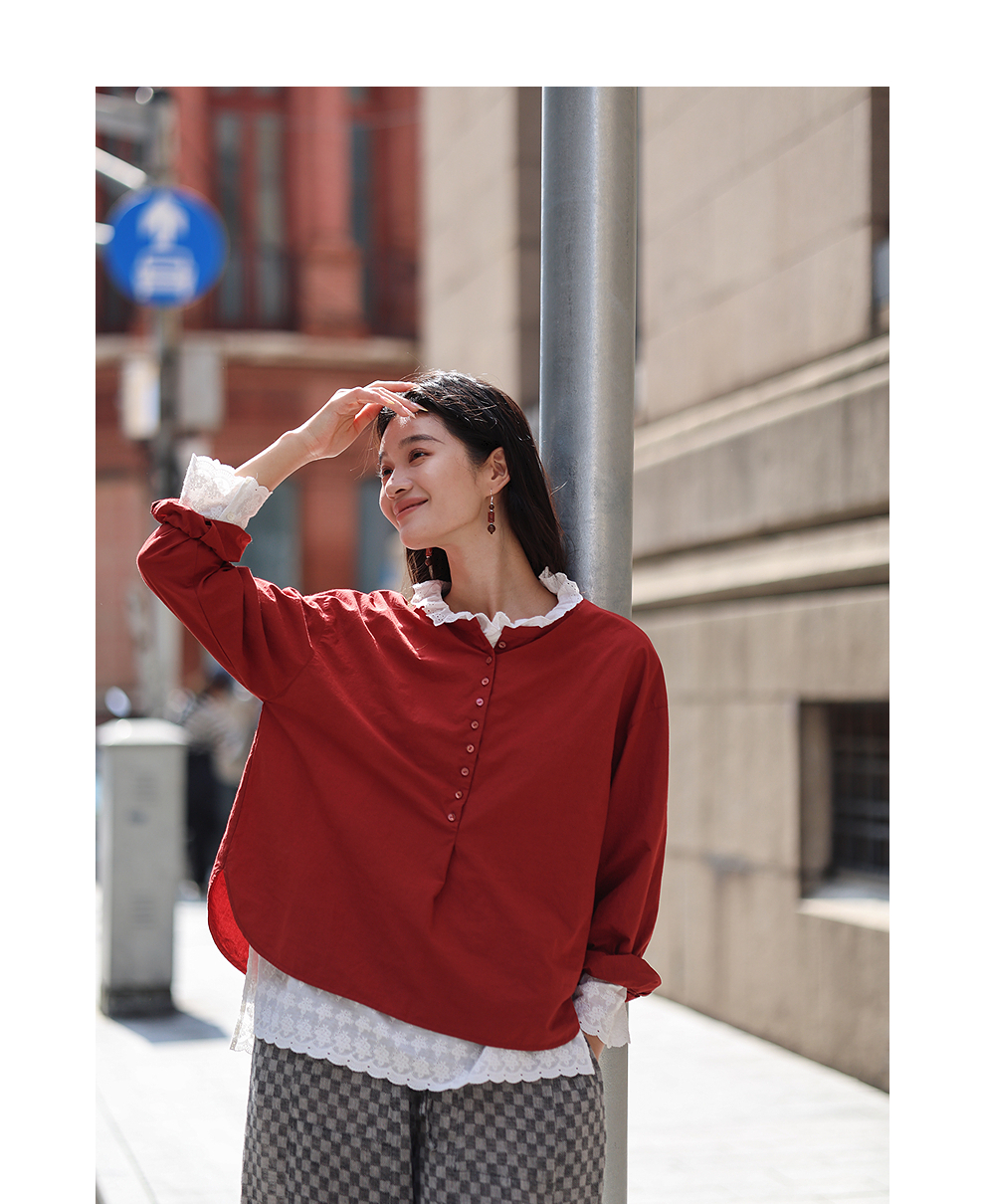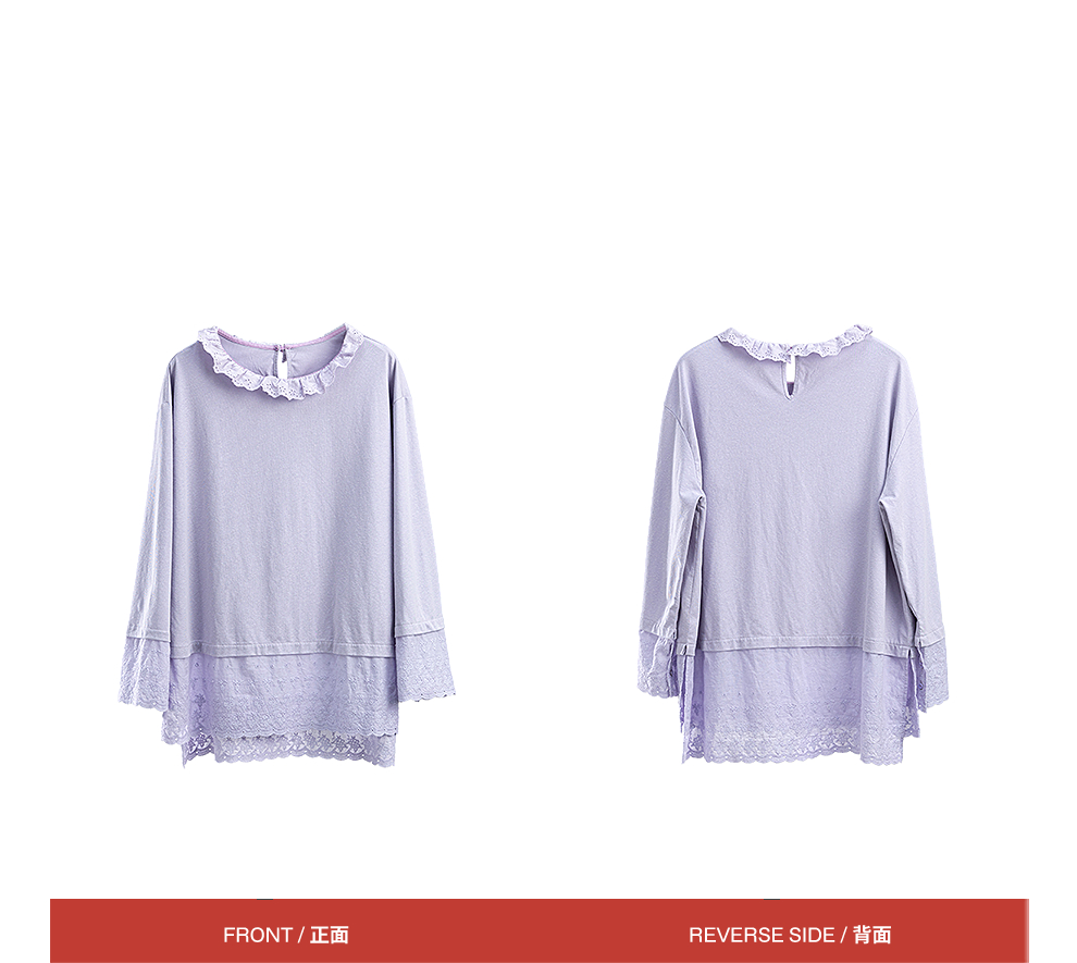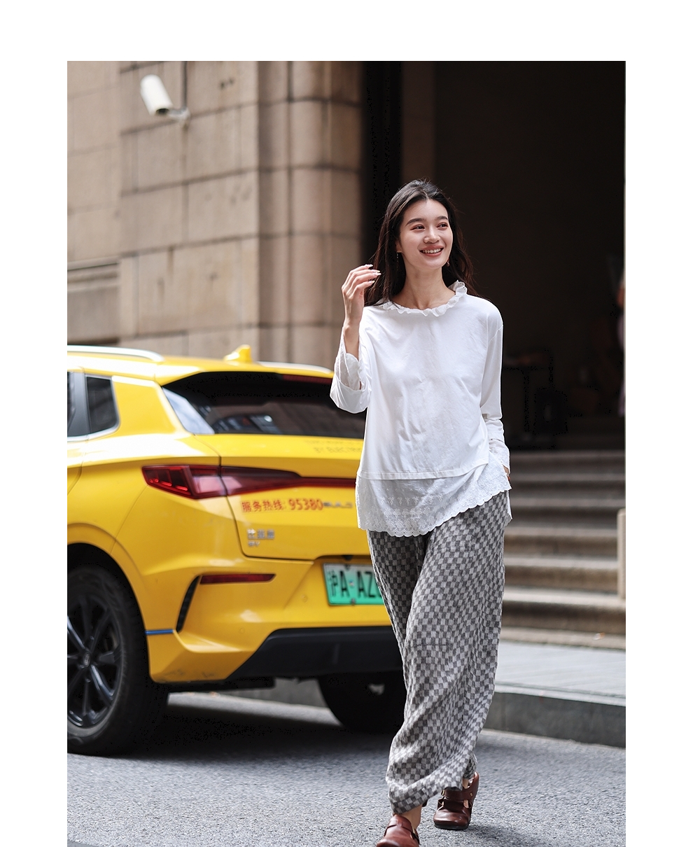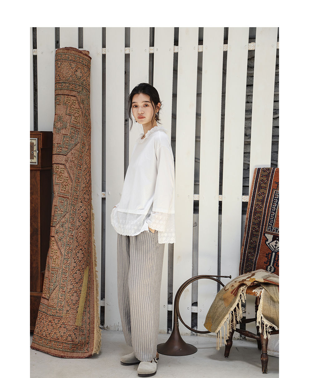 绽放旅行女装471朵/汉麻棉宽松设计感花边拼接叠搭长袖T恤女上衣