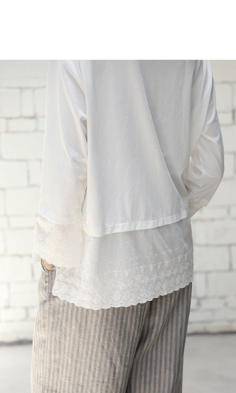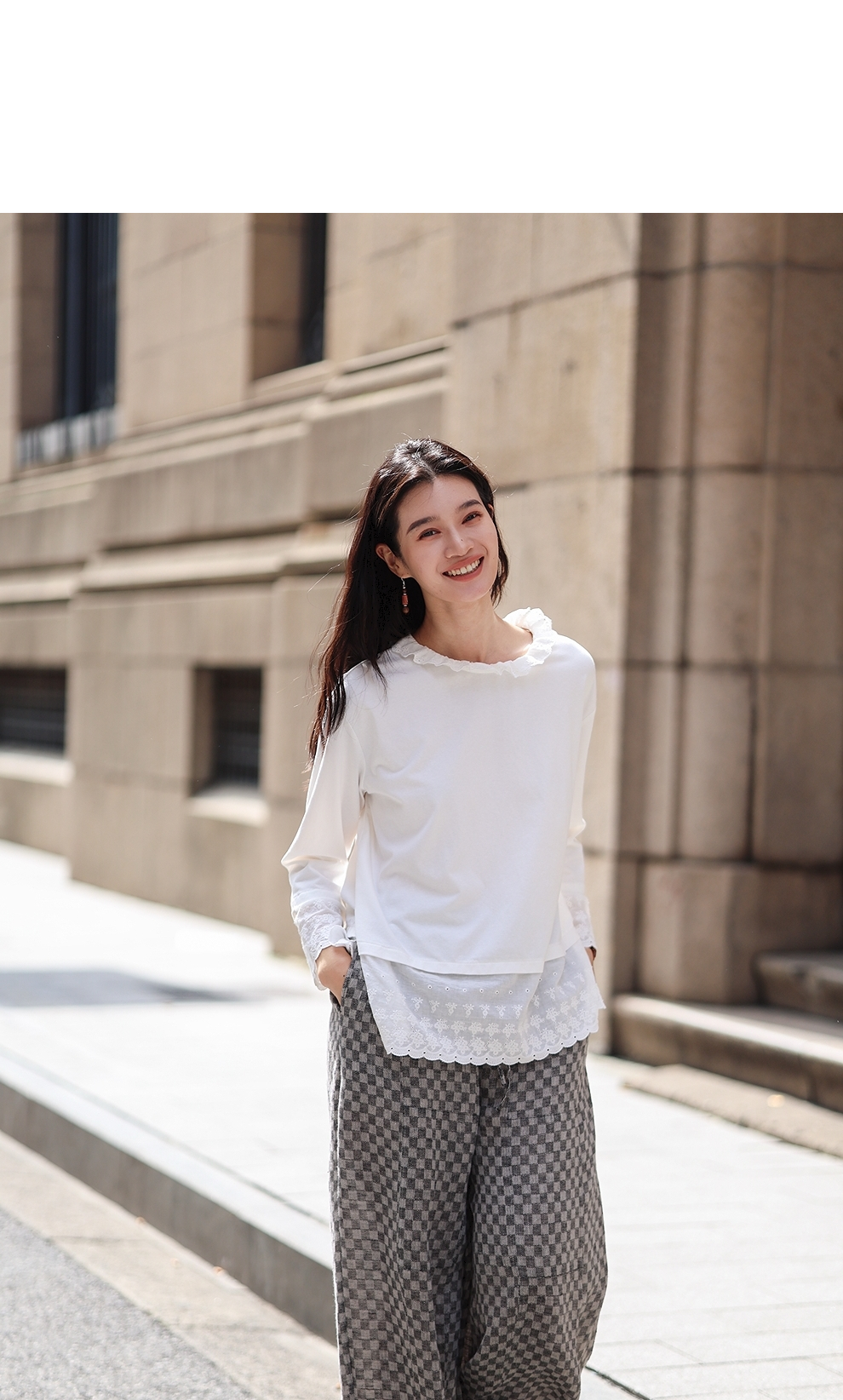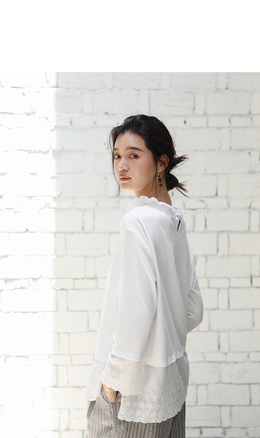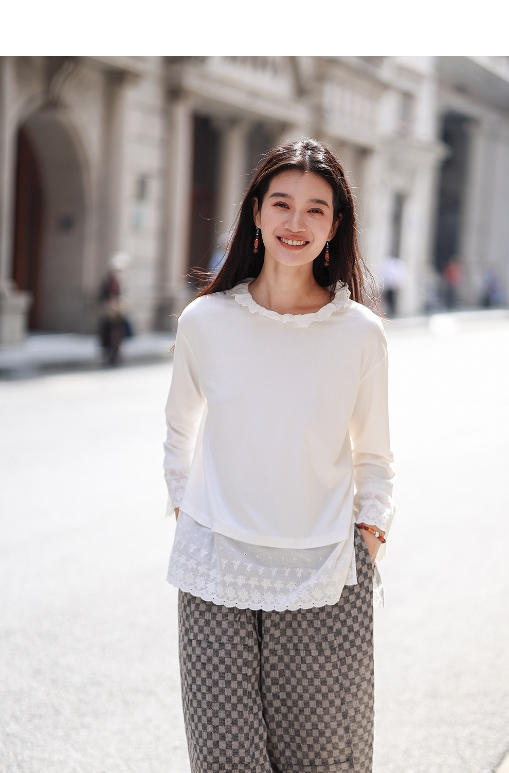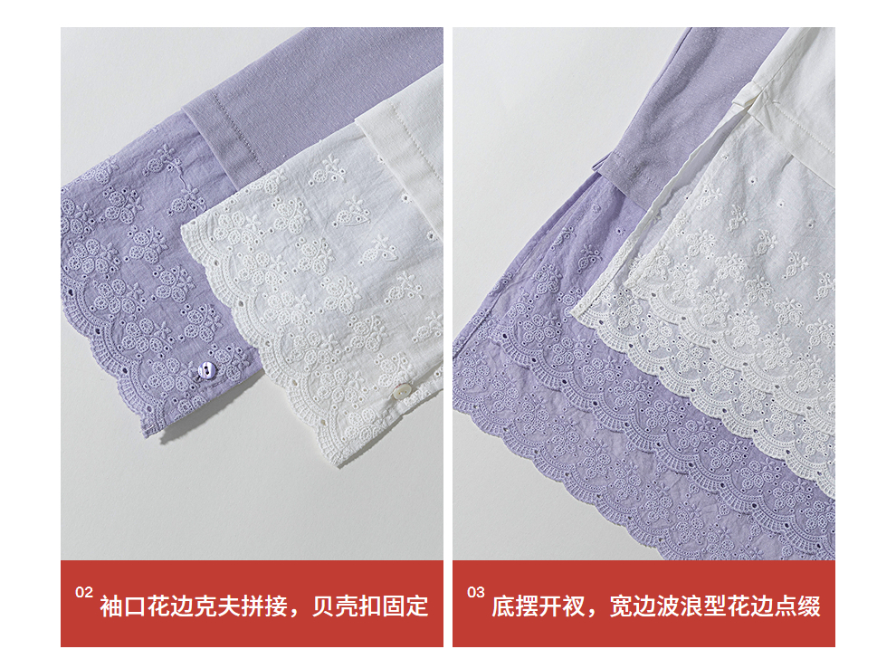 绽放旅行女装471朵/汉麻棉宽松设计感花边拼接叠搭长袖T恤女上衣