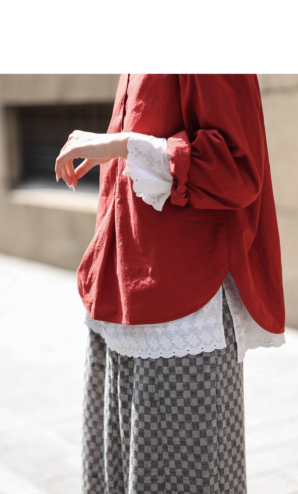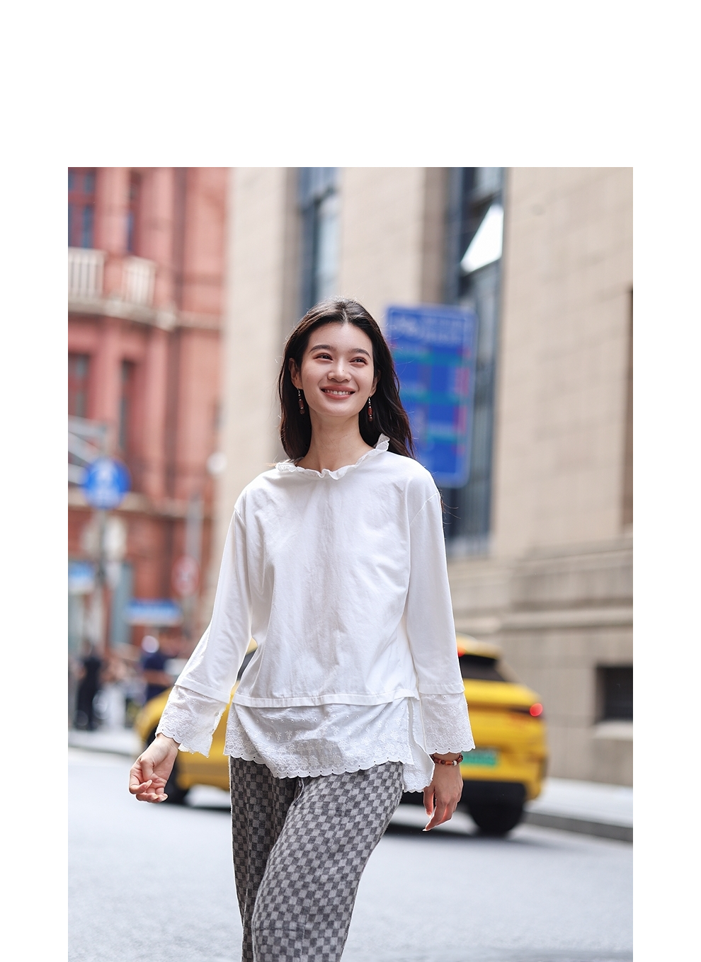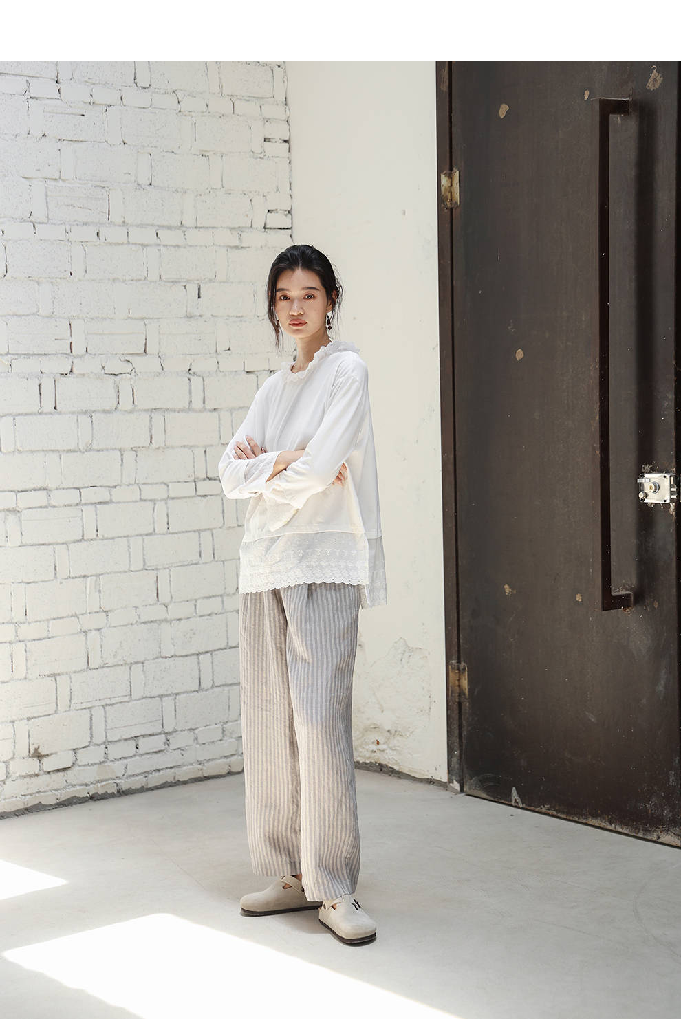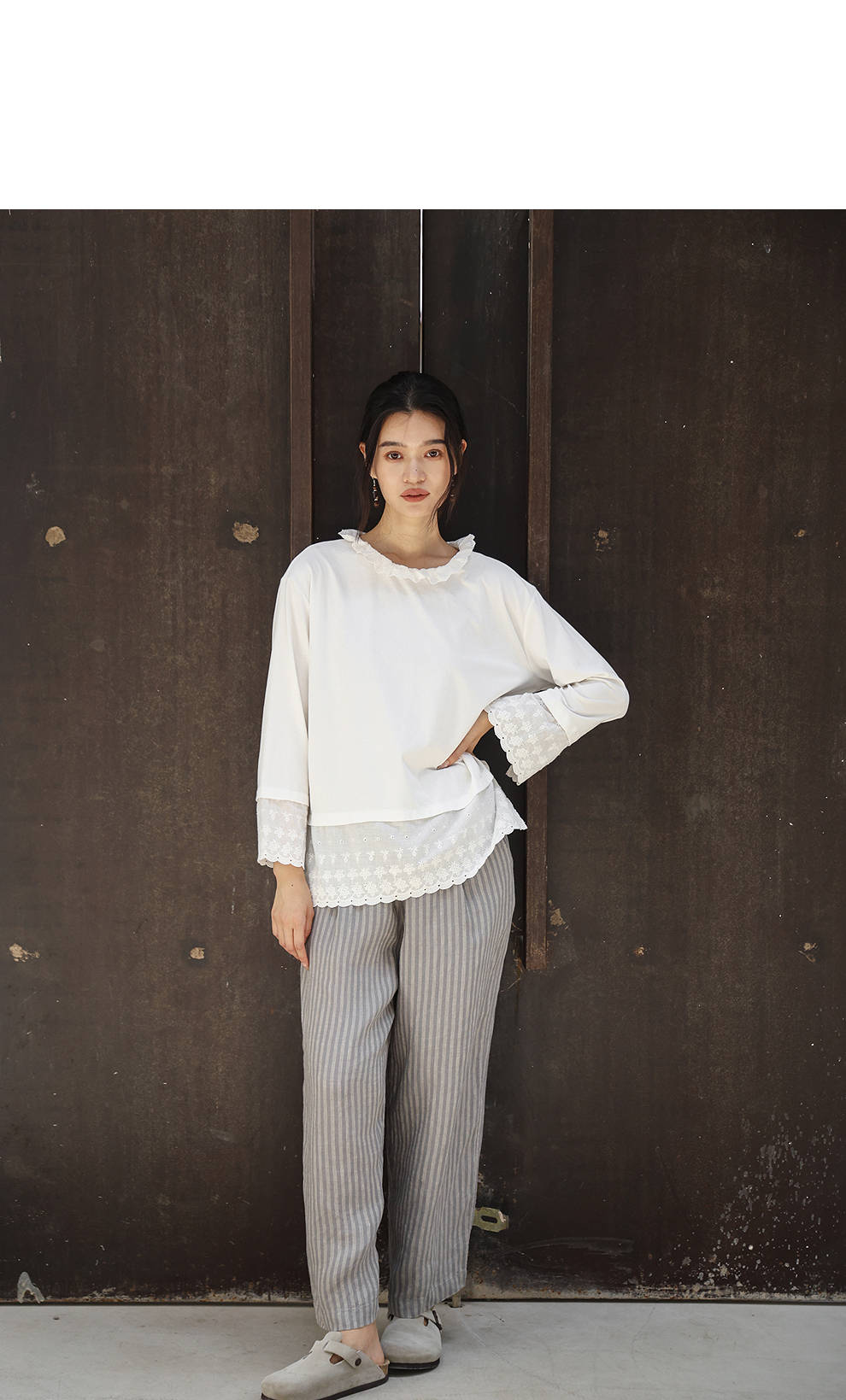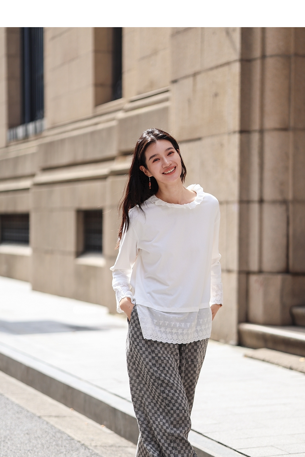 绽放旅行女装471朵/汉麻棉宽松设计感花边拼接叠搭长袖T恤女上衣