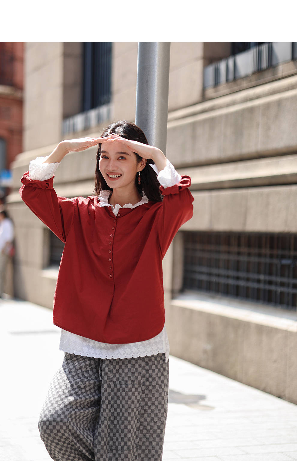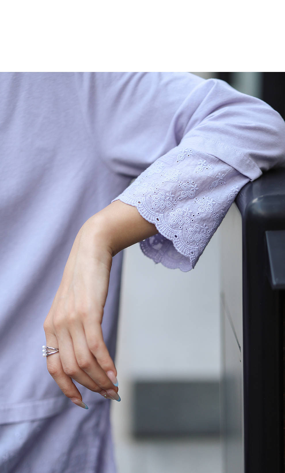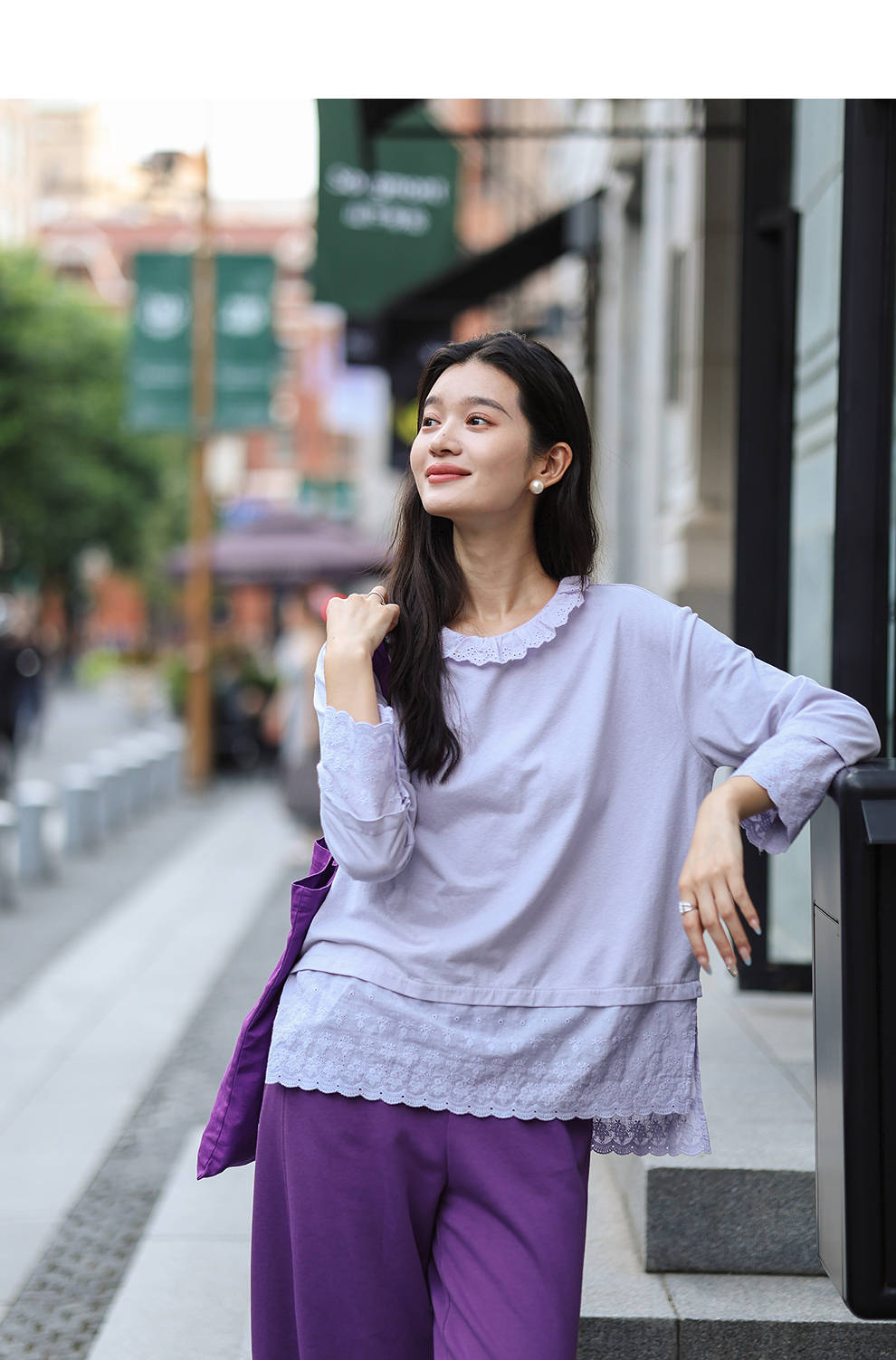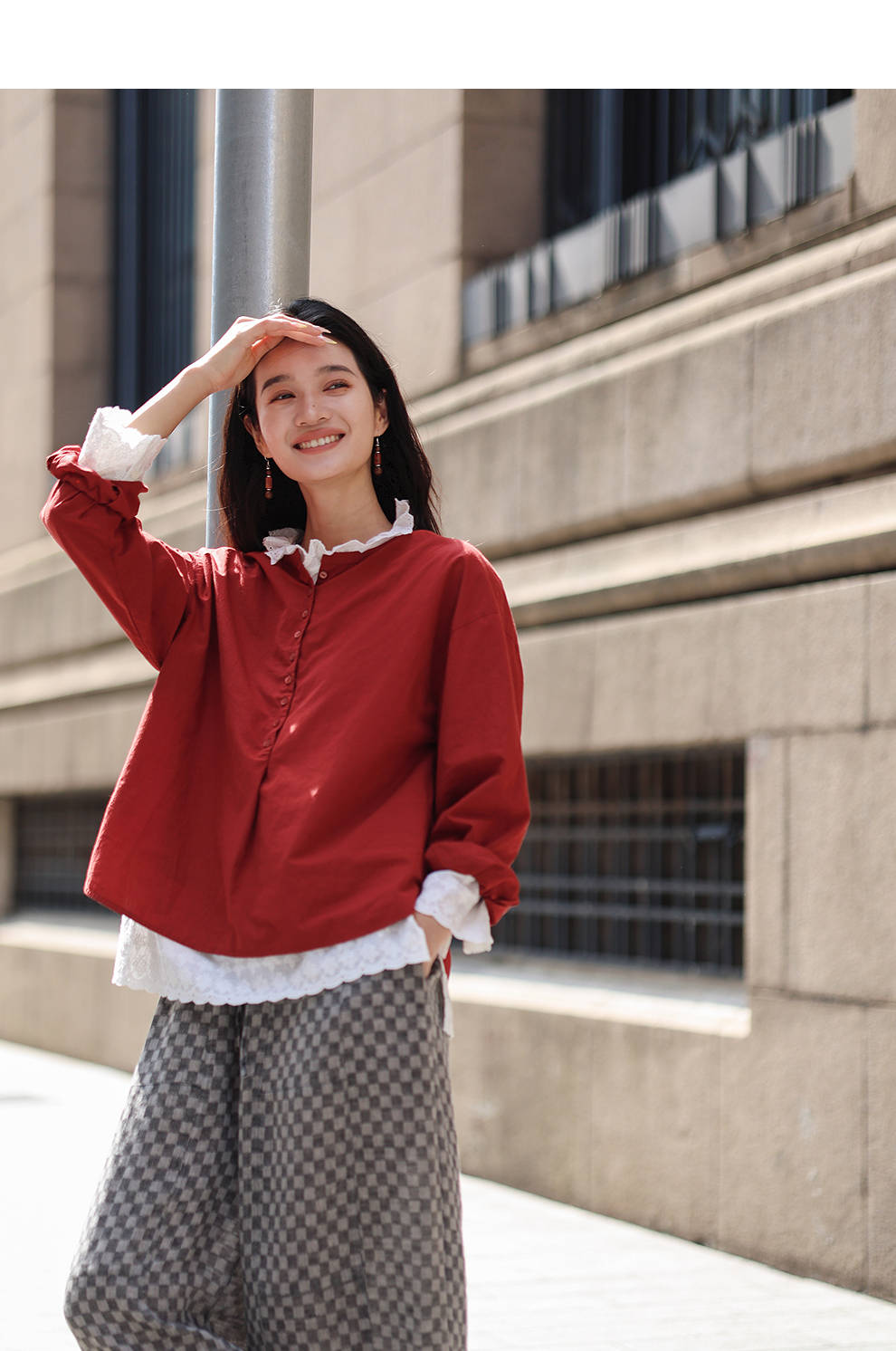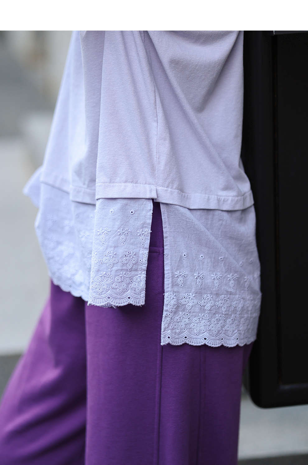 绽放旅行女装471朵/汉麻棉宽松设计感花边拼接叠搭长袖T恤女上衣