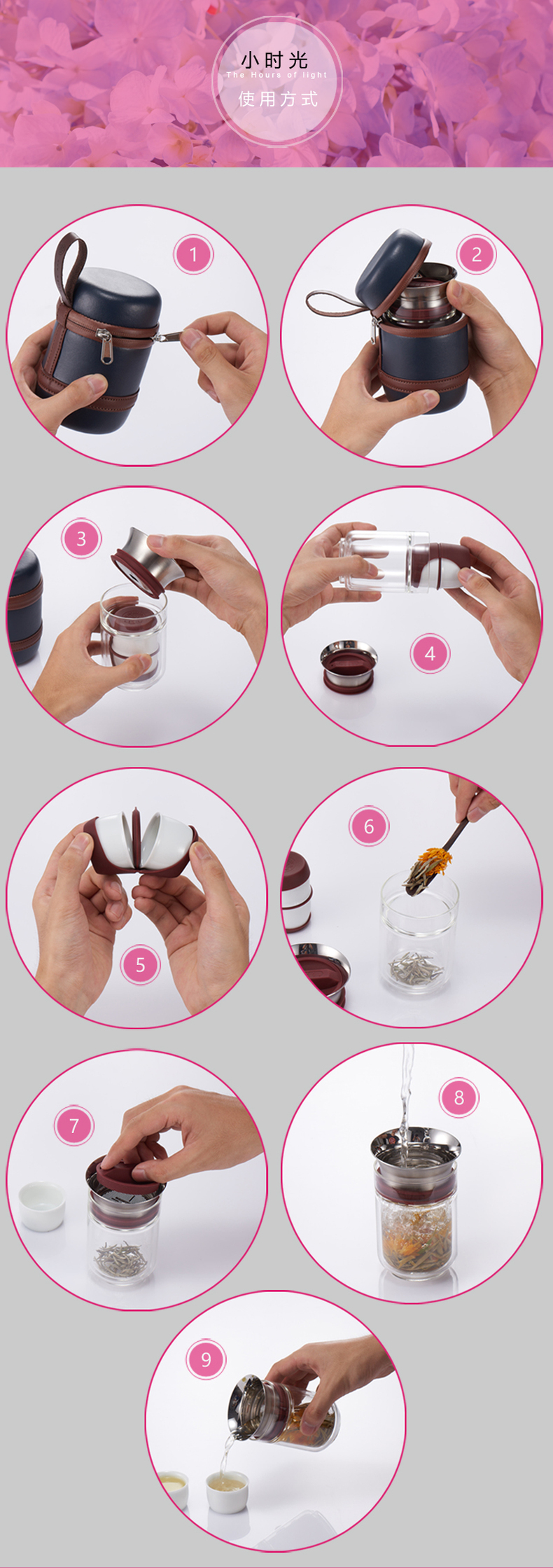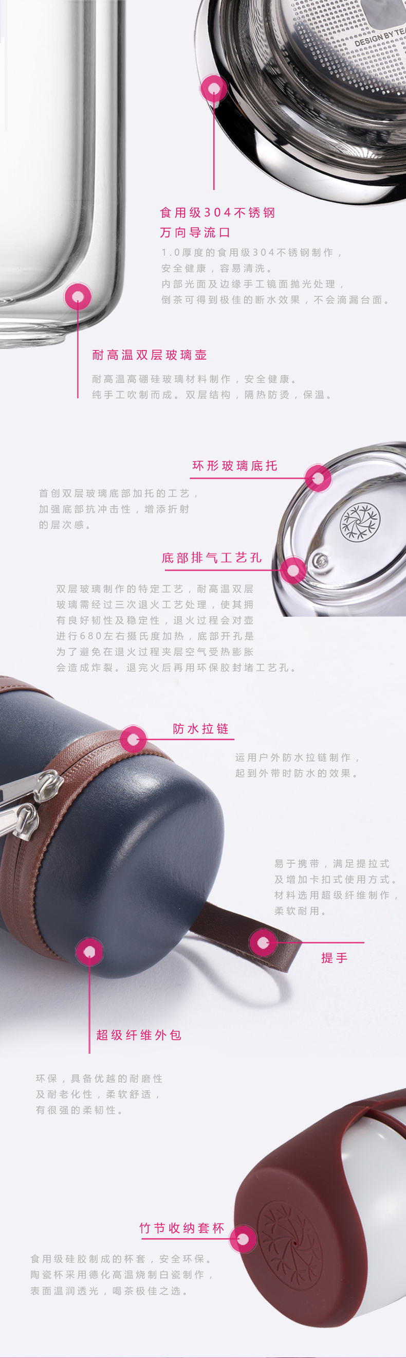 茶具由八个零件组合起来:便携包装+ 耐高温高硼双层玻璃壶+食用级硅胶壶盖+304不锈钢导流口+白瓷茶杯2个+硅胶杯套+硅胶密封圈。