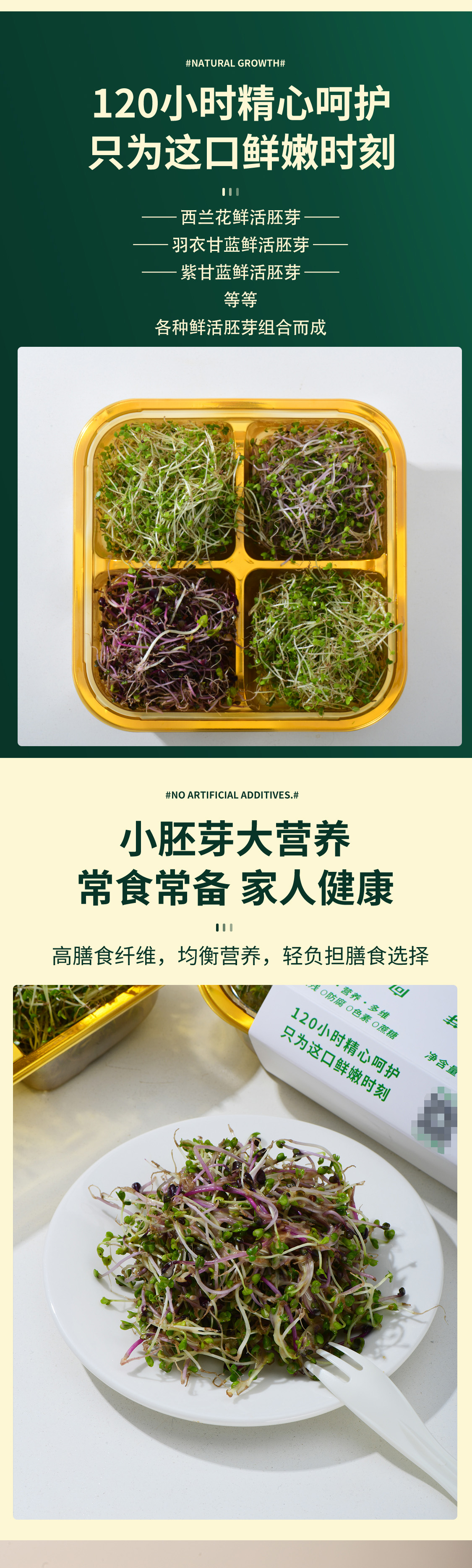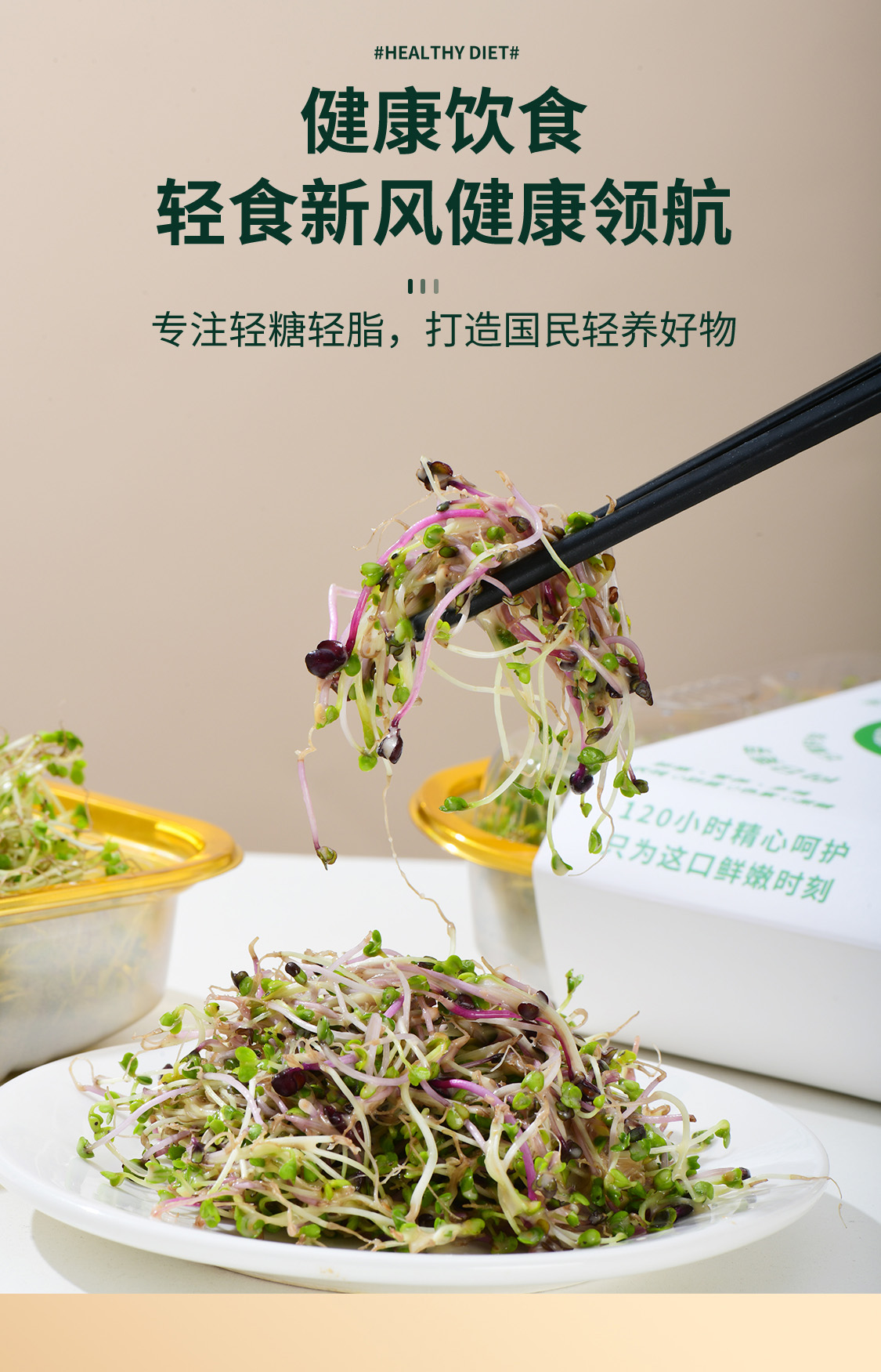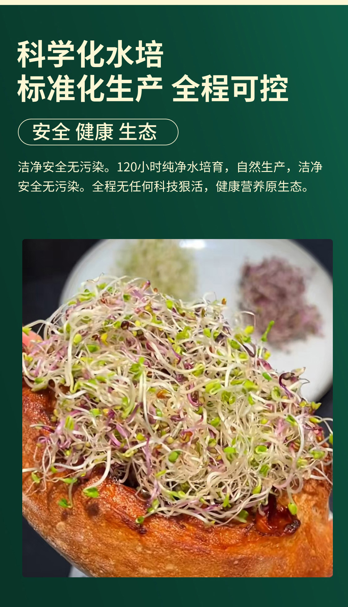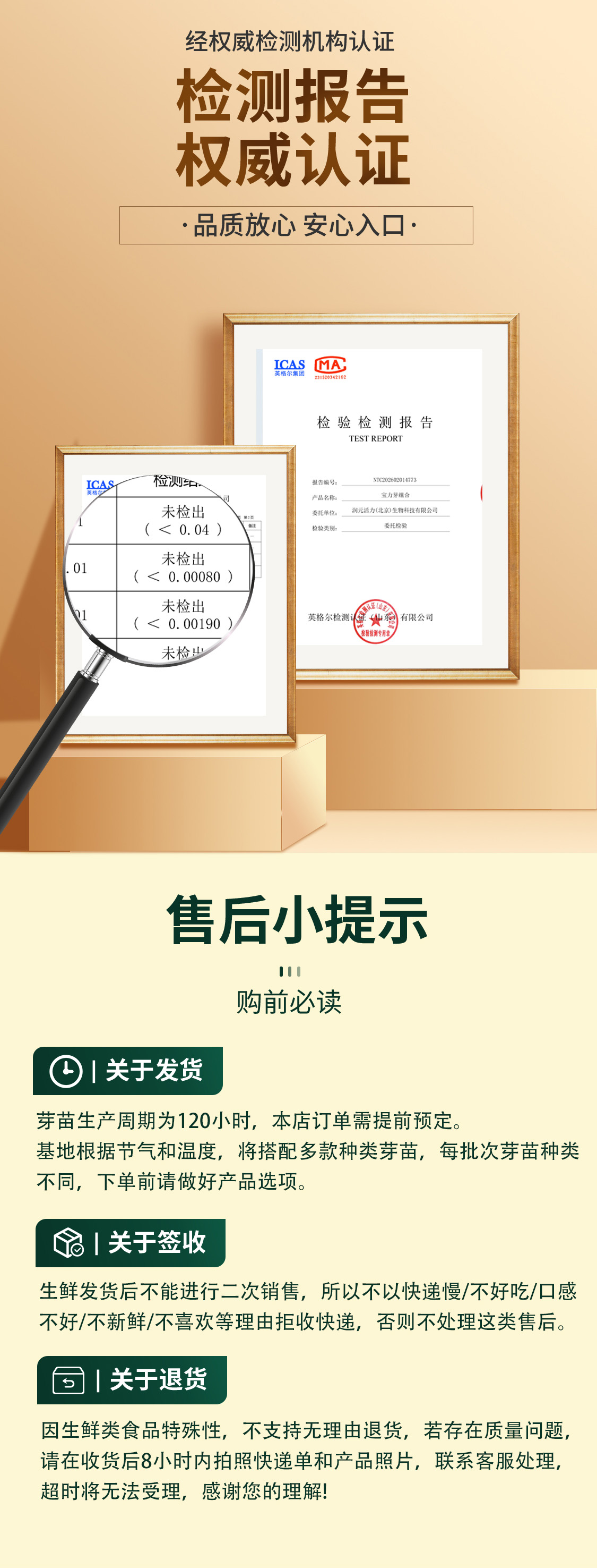 注意:活芽苗是新鲜活菜,在快递和存放期间持续生长,偶有根部出现的白色细绒毛为正常根毛,是芽苗生长过程中健康吸水的自然生理现象,非发霉、非变质,可放心正常食用。