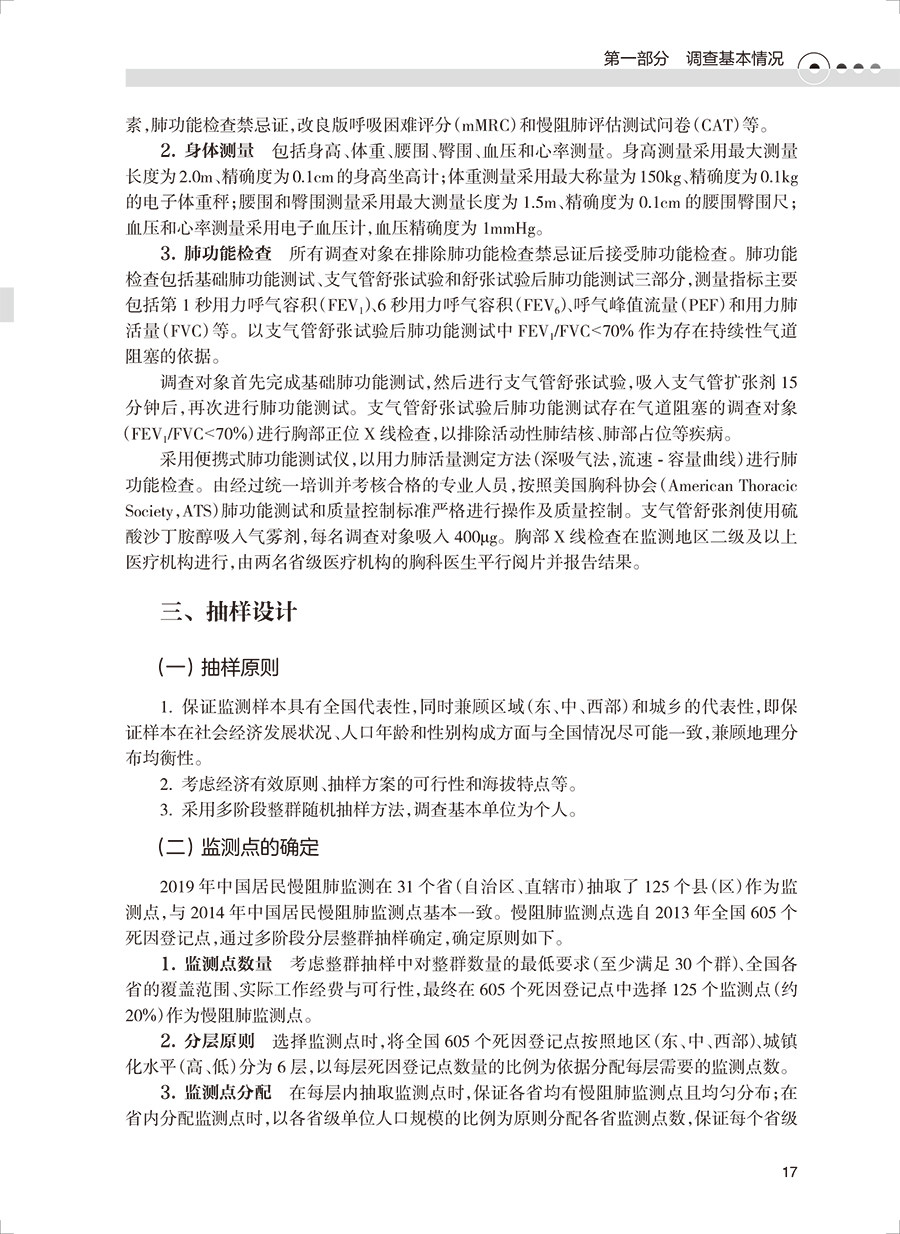 1.本监测报告介绍中国慢阻肺监测的设计、抽样、调查方法和内容以及数据分析指标和方法等;重点分析我国40岁及以上不同特征人群的慢阻肺患病率、主要危险因素的暴露率、肺功能检查率、慢阻肺患者的肺通气功能障碍严重程度、诊断水平以及慢阻肺患病知晓率等重要指标,为评估国家慢性呼吸系统疾病防控状况和效果的提供重要科学依据。 2.本监测报告结合第一轮数据结果(2014-2015年)进行比较,有针对性地对我国以慢阻肺为主的慢性呼吸系统疾病防控政策和措施提出建议。