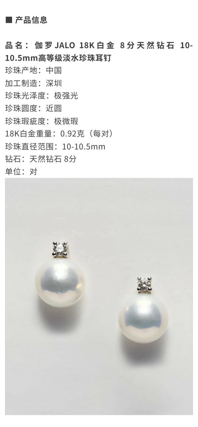 伽罗JALO 18K白金 8分天然钻石 10-10.5mm高等级淡水珍珠耳钉