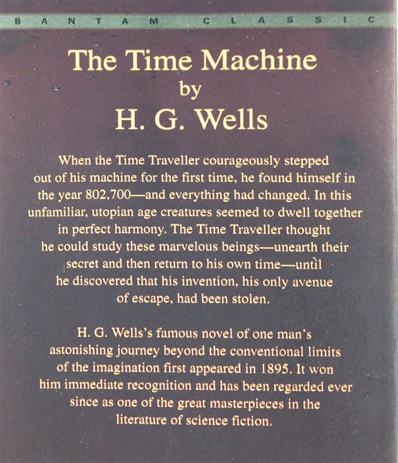 The Time Machine《时间机器》是英国知名小说家赫伯特·乔治·威尔斯在1895年发表的一部科幻小说。这本书也是威尔斯的首部科幻小说。有评论家将这本书的出版认定为"科幻小说诞生元年"。作品描述一位科学家通过时间旅行机器来到公元802701年。这时的地球到处是宫殿式建筑。人类进化为两类:艾洛伊人和莫洛克人。作者将将优雅的贵族描写为被莫洛克饲养的畜牲,而且还被当作食物,展示了人类退化的阴森景象。
