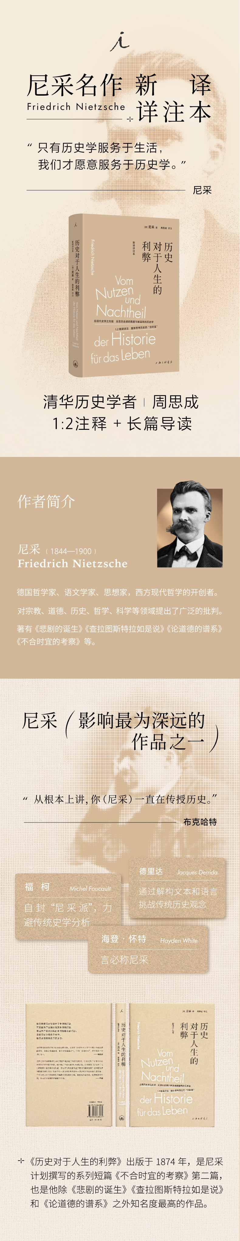 这部尼采名作的新译注本可谓意外地回应了时代的呼声。21世纪头二十来年公众对往昔异乎寻常的热情,似乎贴近尼采所说的历史感泛滥。此时重温《历史对于人生的利弊》就变得十分对症:什么样的历史最有益于我们的精神健康?怎样避免成为陈腐历史的囚徒?如何学会一边历史地思考过去一边现实地创造未来?尼采在一个半世纪之前的深刻沉思召唤我们保持批判立场,傲然地不合时宜,热烈地拥抱生活,从而达至超越性的解放与自由。