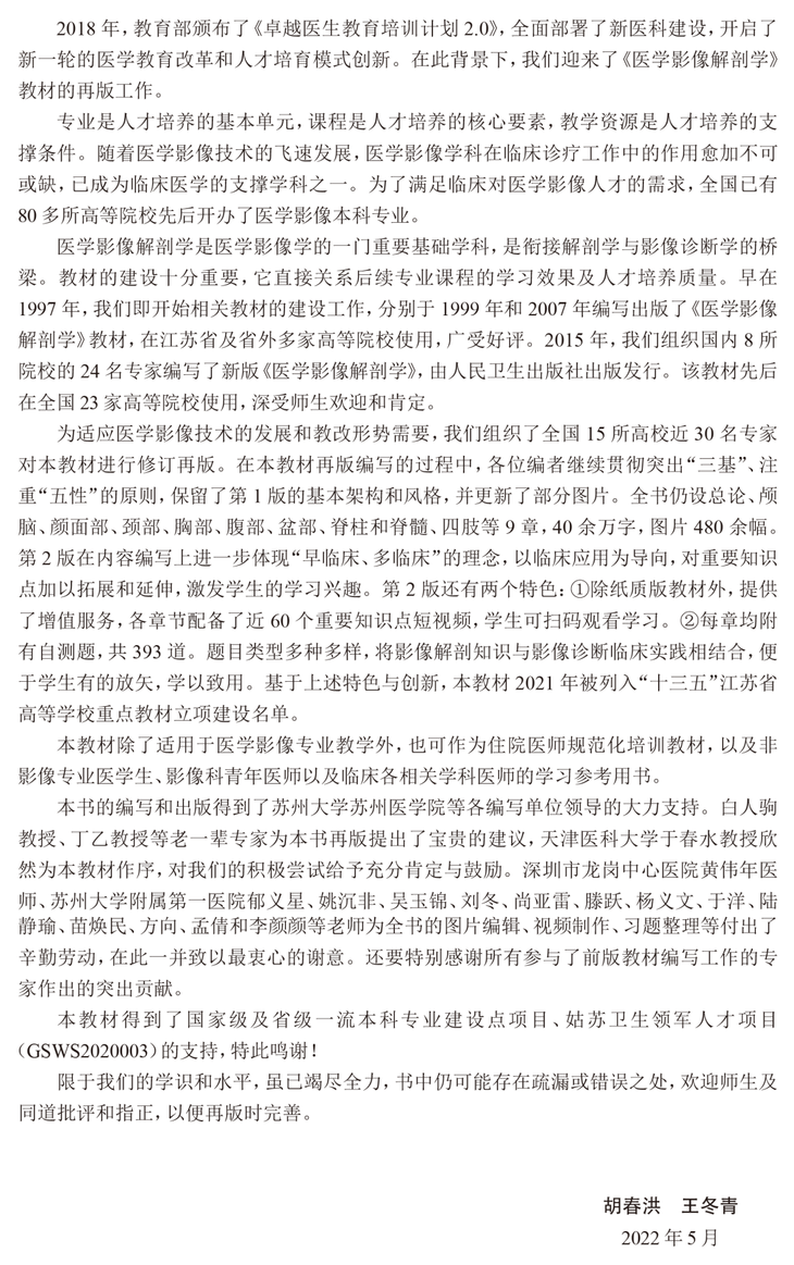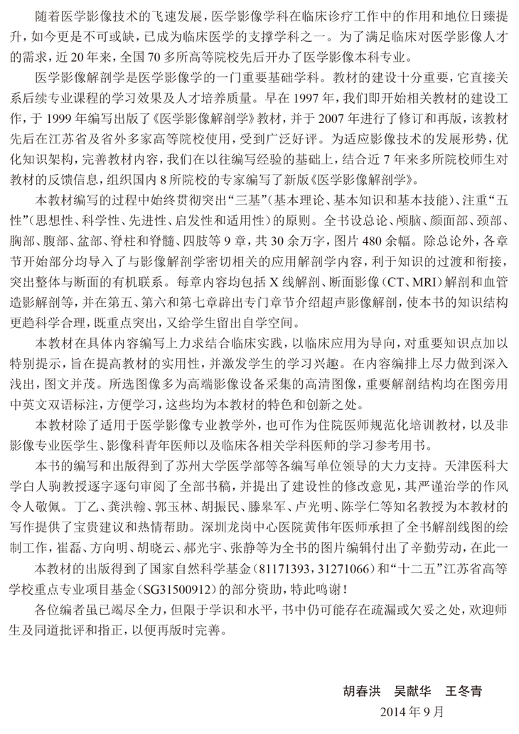 全书分为总论、颅脑、颜面部、颈部、胸部、腹部等9章,以临床应用为导向,对重要知识点加以拓展和延伸,激发学生的学习兴趣。除纸质版教材外,还提供了增值服务,各章节配备了近60个重要知识点短视频,学生可扫码观看学习。每章的自测题,类型多种多样,将影像解剖知识与影像诊断临床实践相结合,便于学生有的放矢,学以致用。