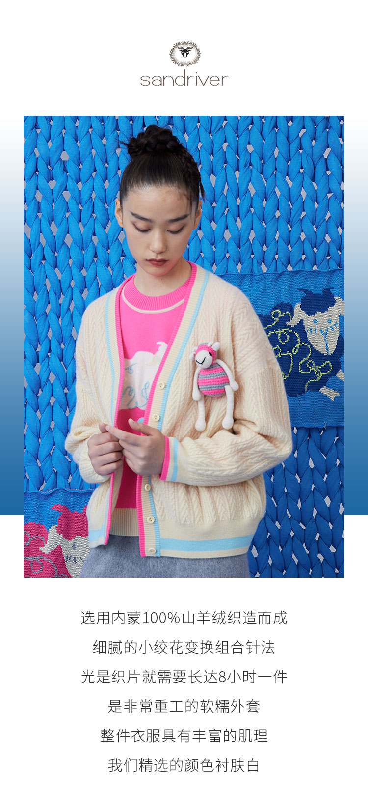 历年在巴黎时装周亮相,享誉世界的艺术羊绒品牌[Sandriver 沙涓]由羊绒布道者郭秀玲女士创立。阿拉善自有牧场纯种羔羊绒,日本国宝设计师小筱顺子,上海自有基地精工细作。承载羊绒情怀,坚持匠人品质。