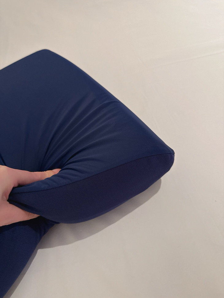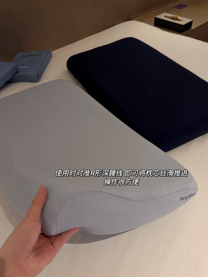 取消了硬硬的小拉链 换成身体更熟悉的瑜伽裤腰头工艺 使用时对准R形深睡线 即可将枕芯丝滑推进👍操作很方便